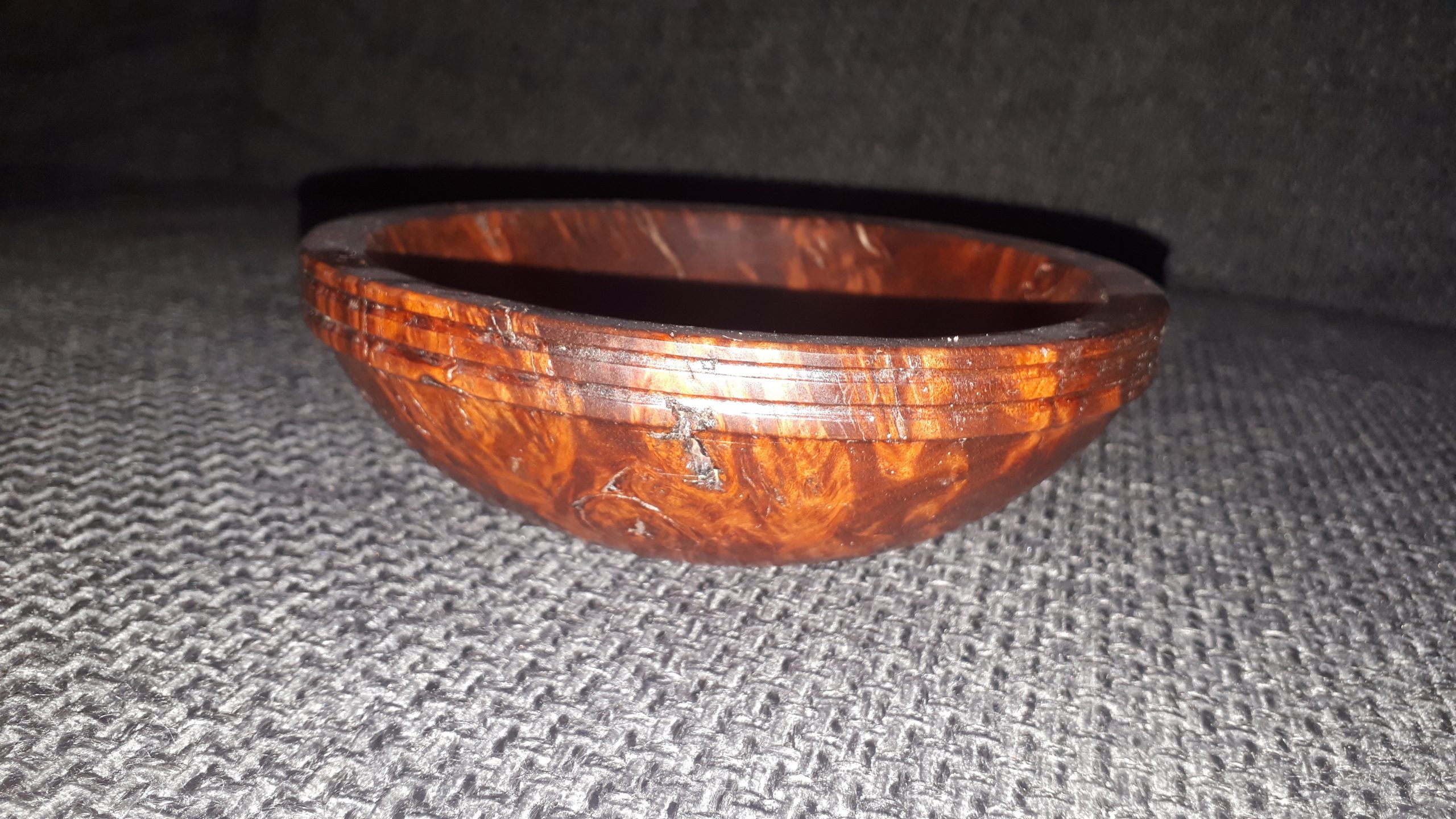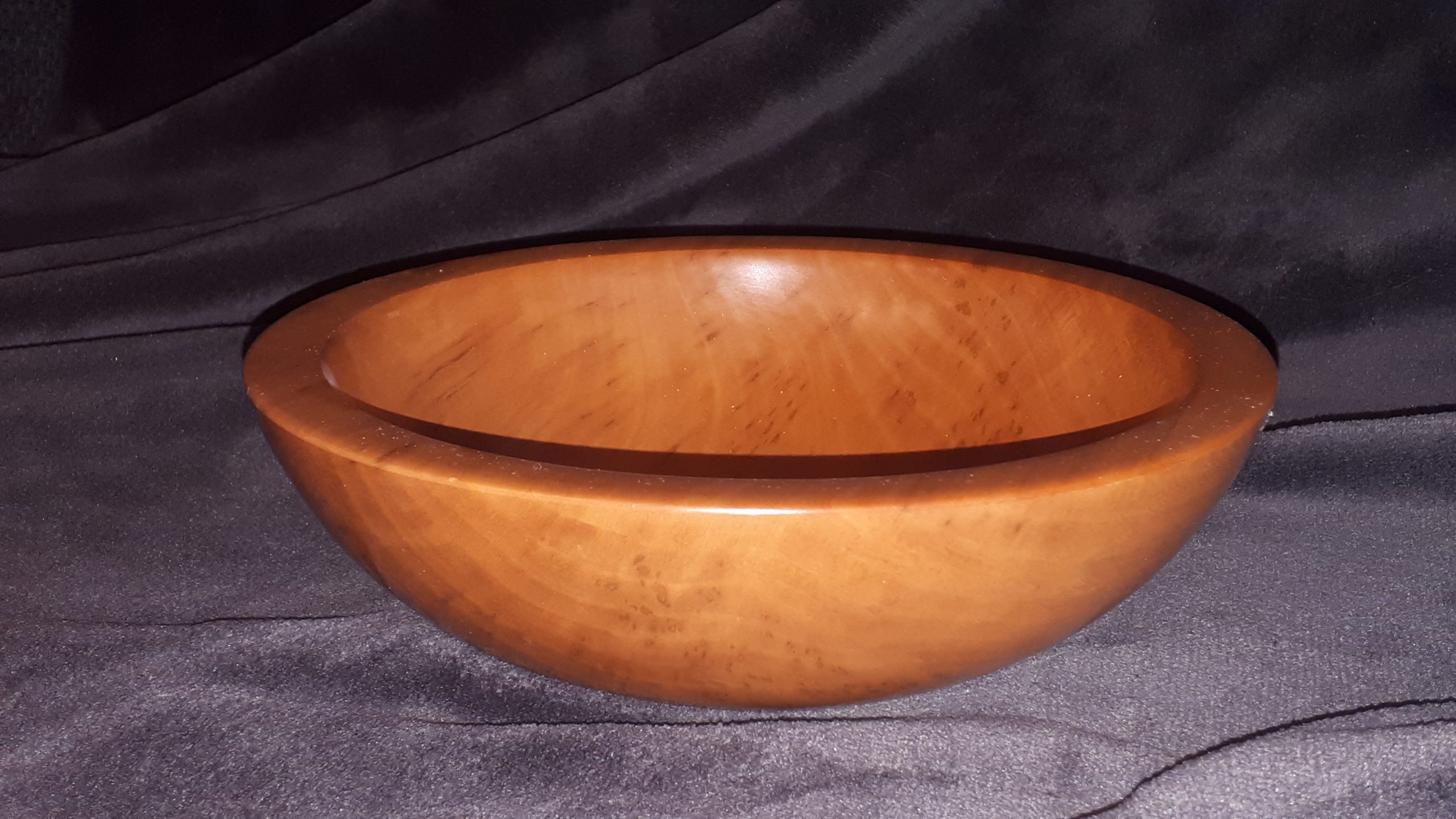Obstschale aus gedämpftem Birnbaum gedrechselt. Oberflächenbehandlung mit Danish Oil. Durchmesser 23cm, Höhe 6,5cm.