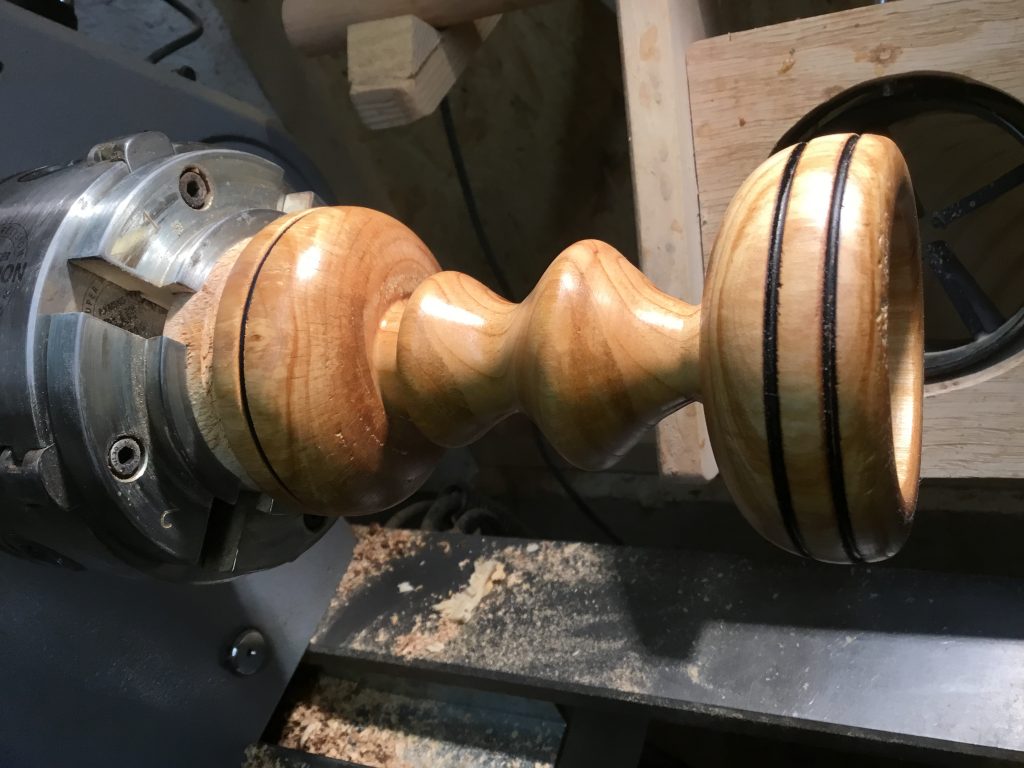 Der Fuß der Stehlampe wurde aus dem Stamm eines Kirschbaumes gedrechselt Höhe 63 cm ; Durchmesser Lampenschirm 32 cm, Durchmesser Sockel 20 cm. Die Oberfläche wurde abschließend mit Danish Oil von DICTUM behandelt.