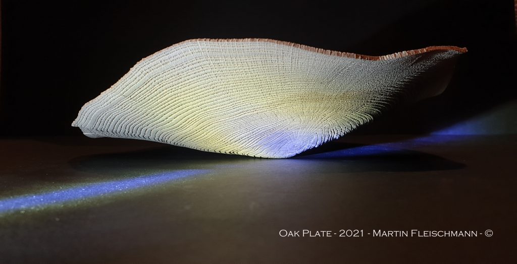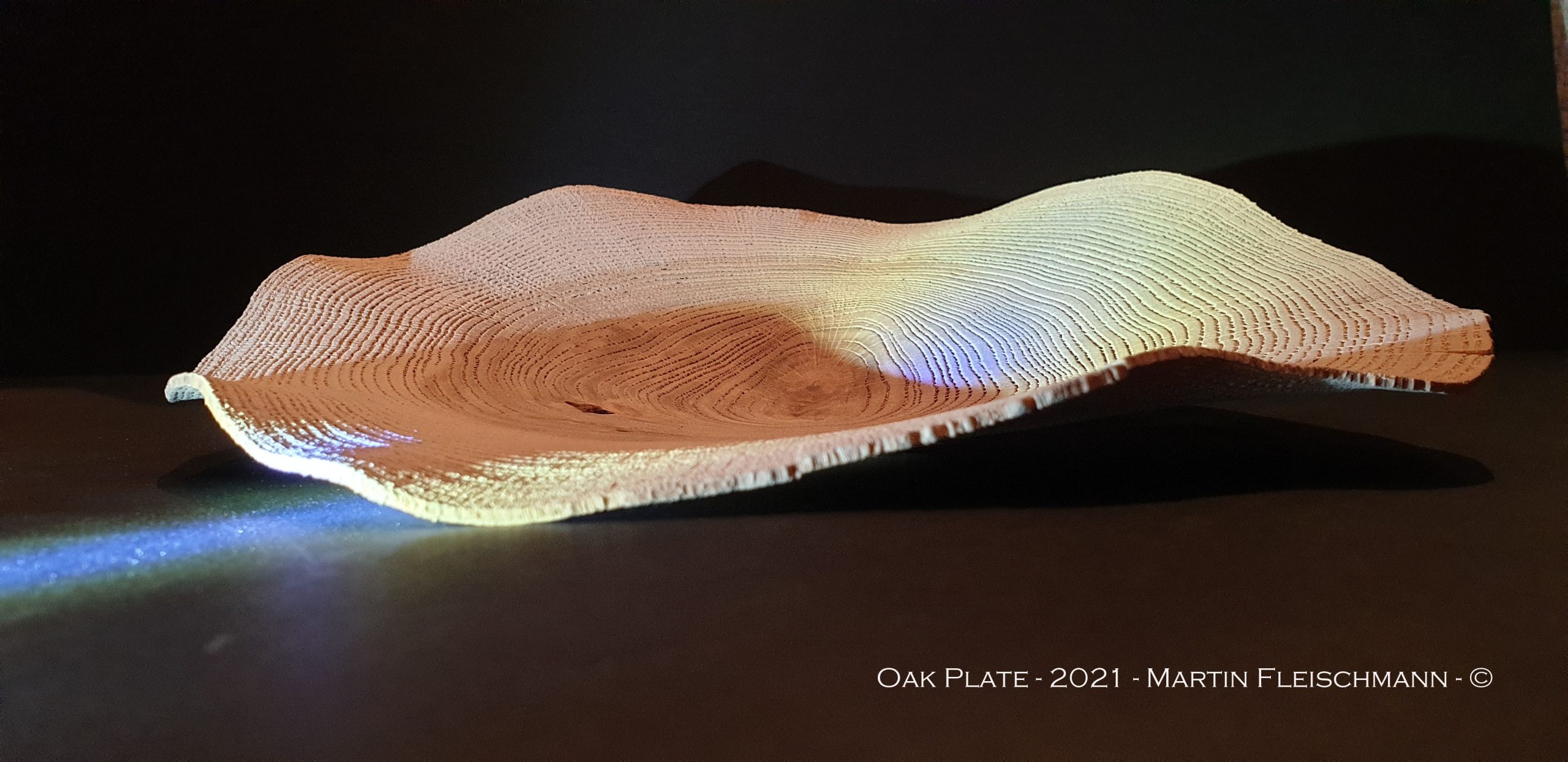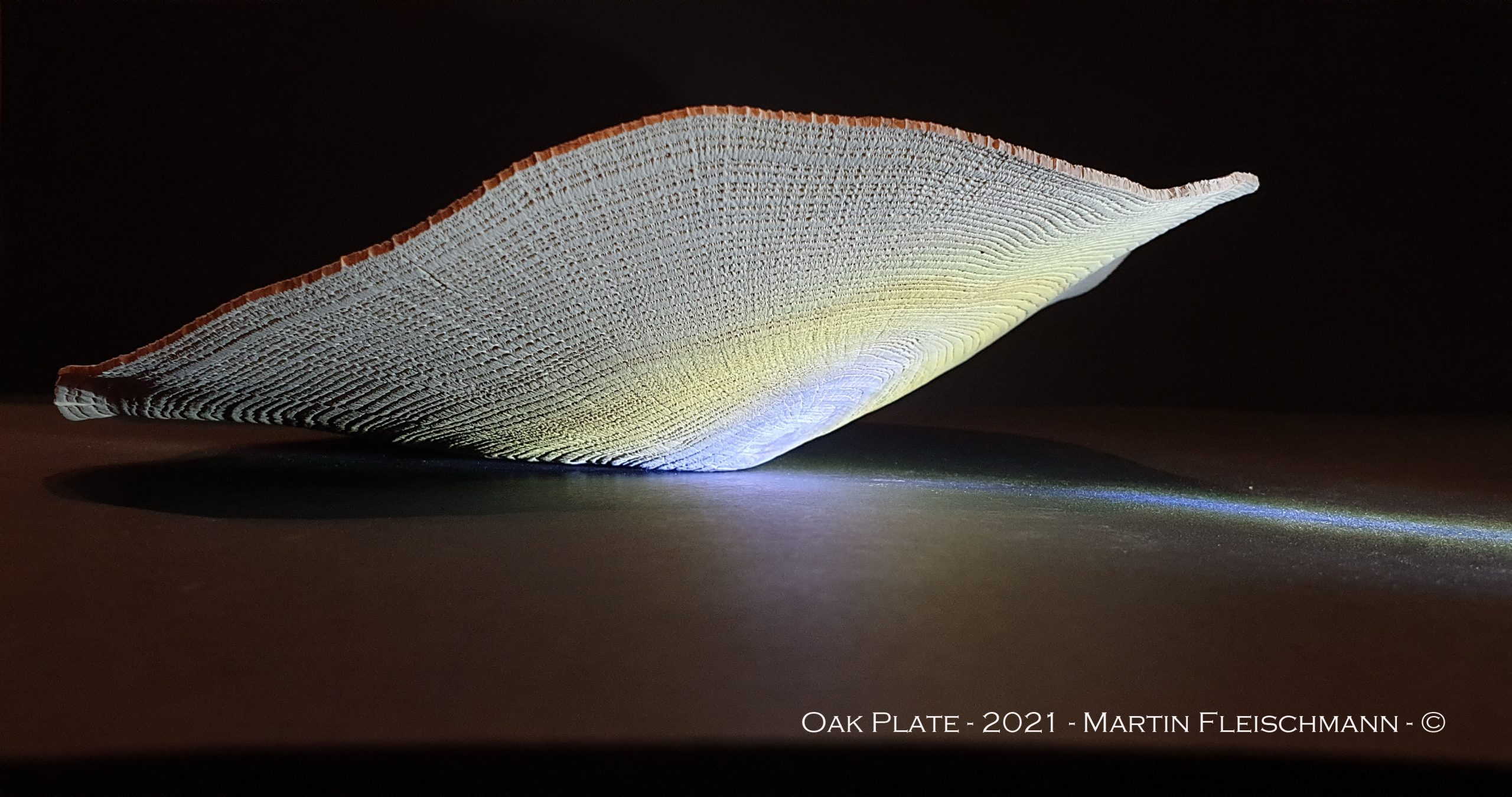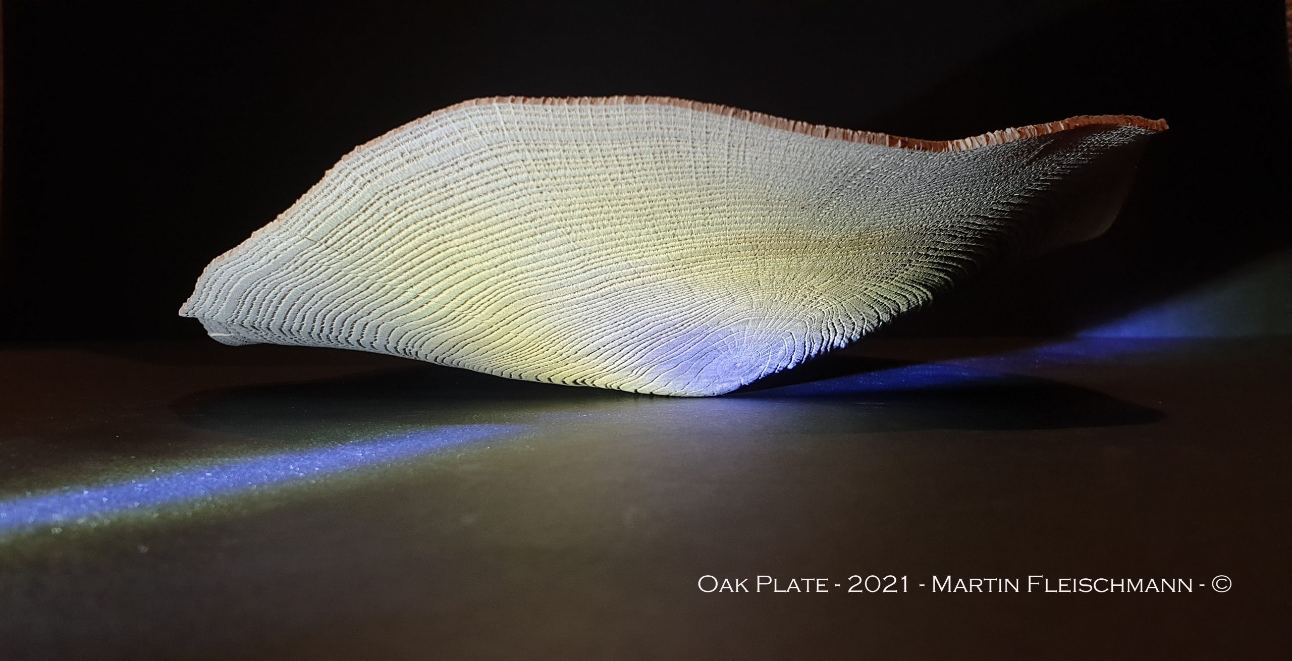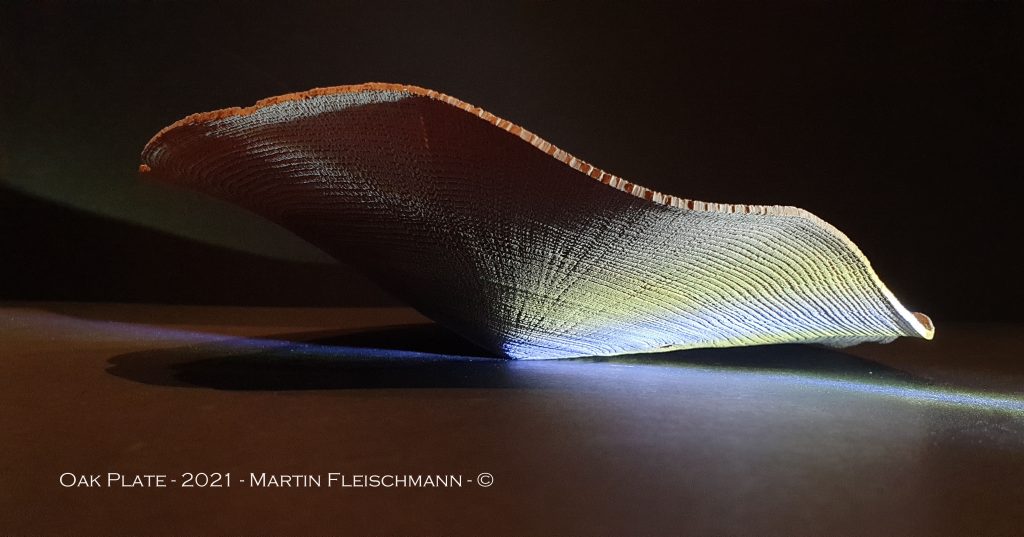 Mein zweiter Teller aus Eiche hat sich beim Trocknen sehr schön verzogen da er dünner als der erste gedrechselt wurde. Durch das Sandstrahlen sind die Jahresringe wunderbar zu erkennen. Die Oberfläche habe ich mit Schellack behandelt. Der Durchmesser beträgt ca. 280 mm, die Dicke ca. 2 mm.