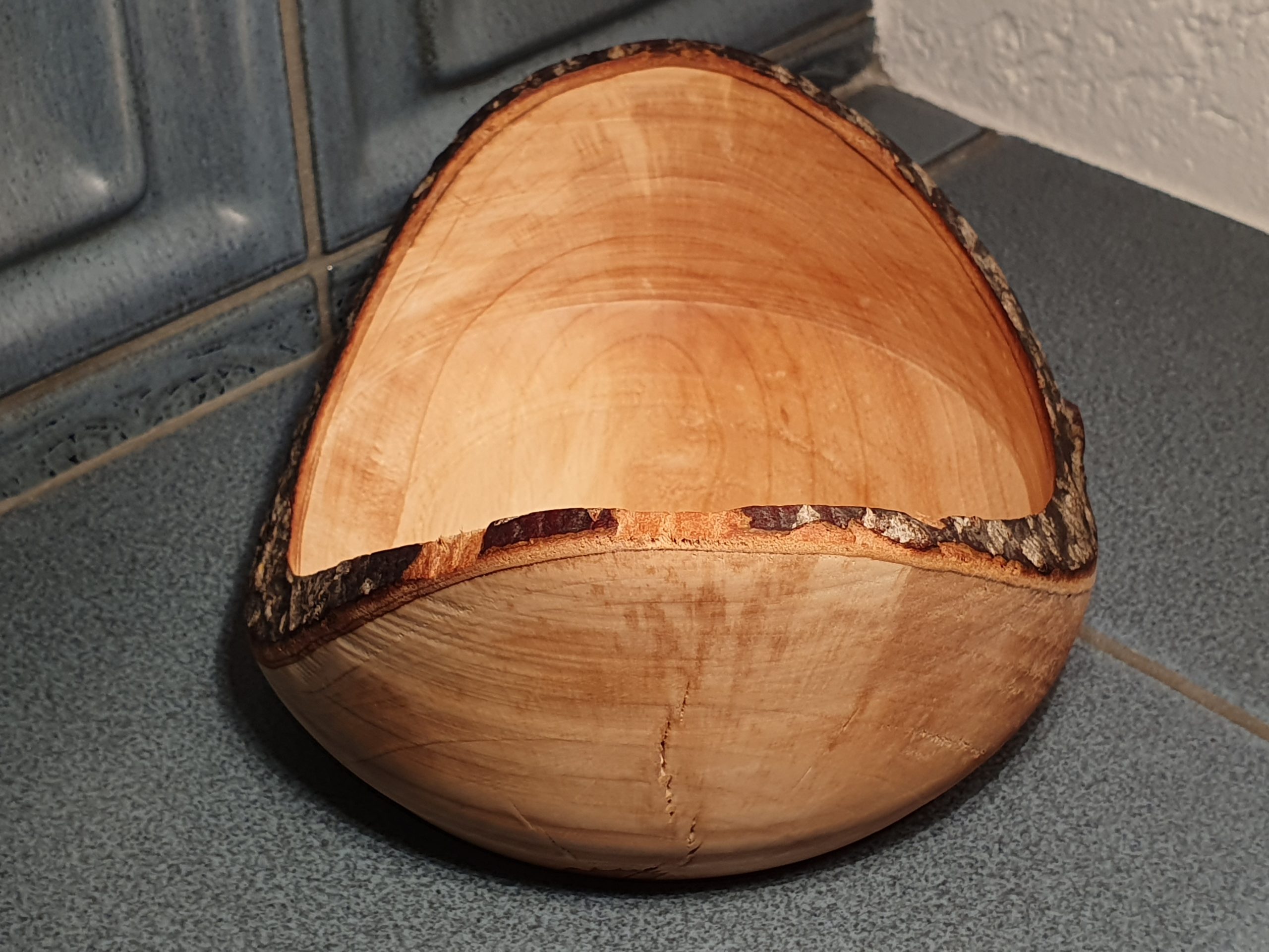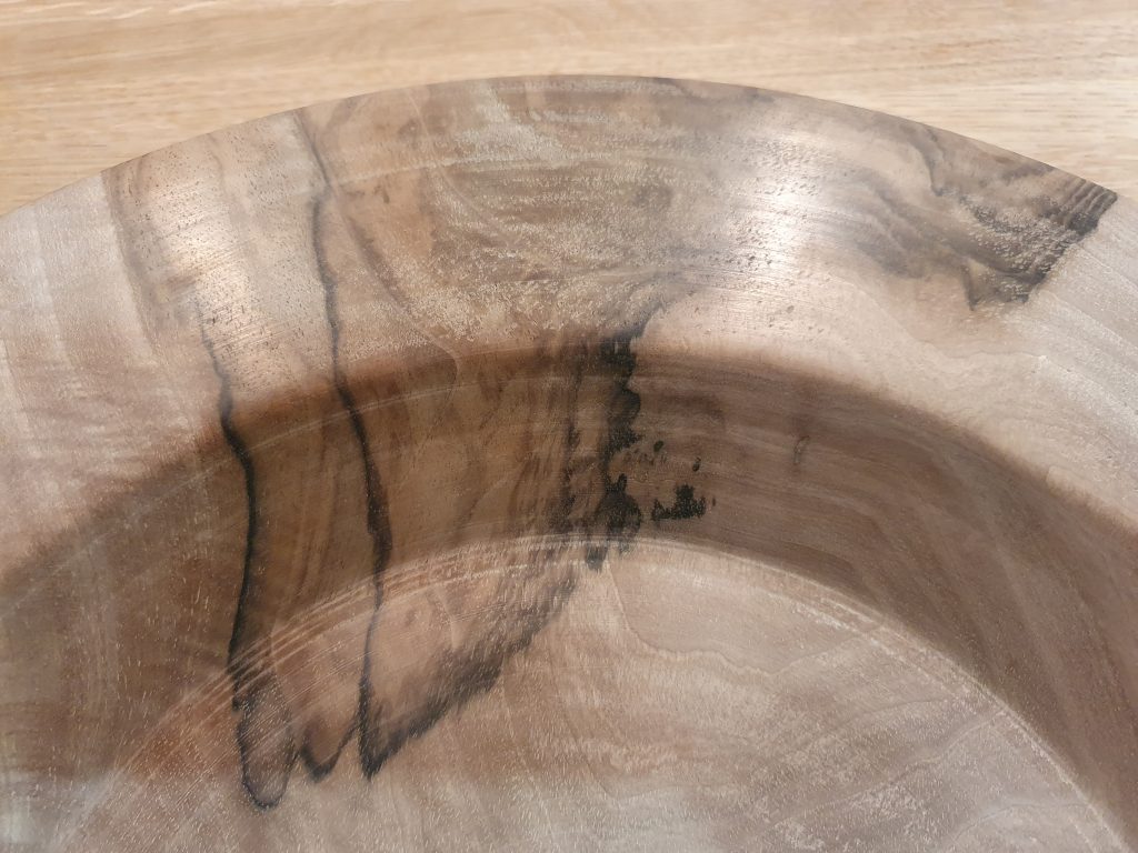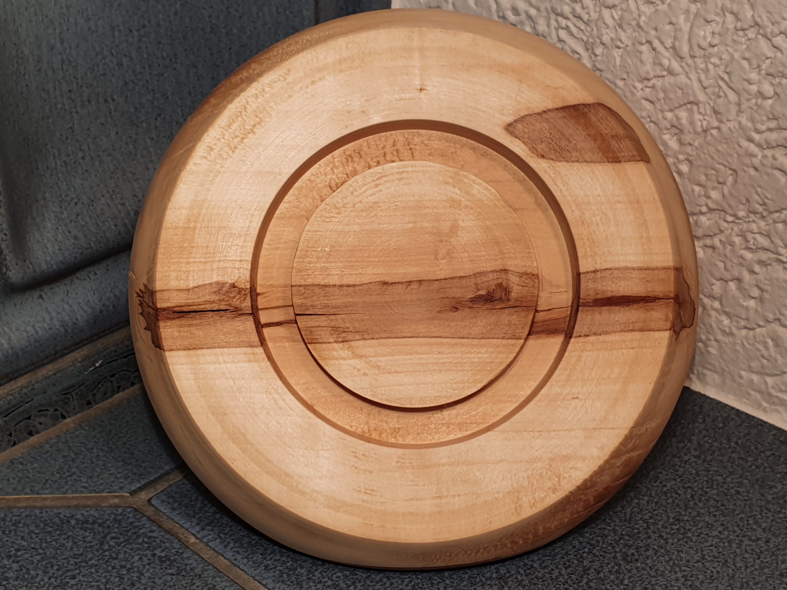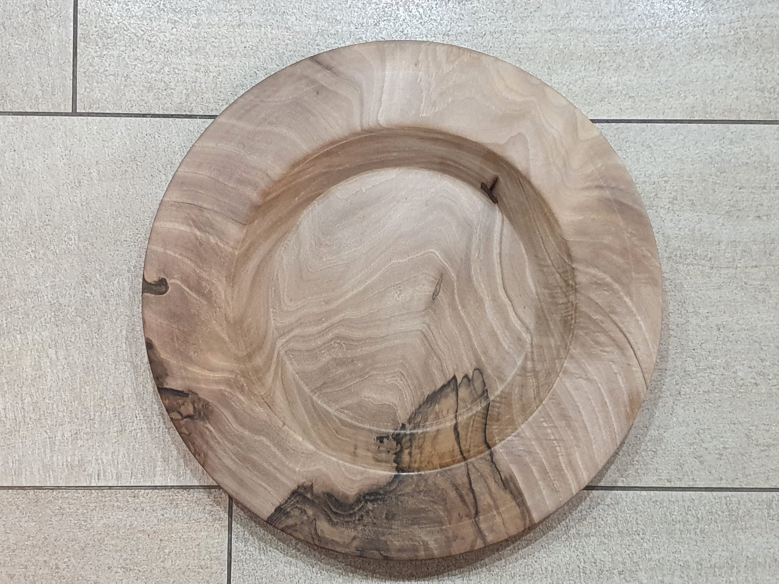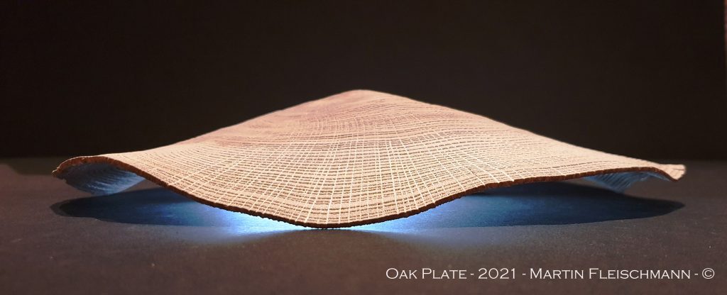 Mein zweiter Teller aus Eiche hat sich beim Trocknen sehr schön verzogen da er dünner als der erste gedrechselt wurde. Durch das Sandstrahlen sind die Jahresringe wunderbar zu erkennen. Die Oberfläche habe ich mit Schellack behandelt. Der Durchmesser beträgt ca. 280 mm, die Dicke ca. 2 mm.