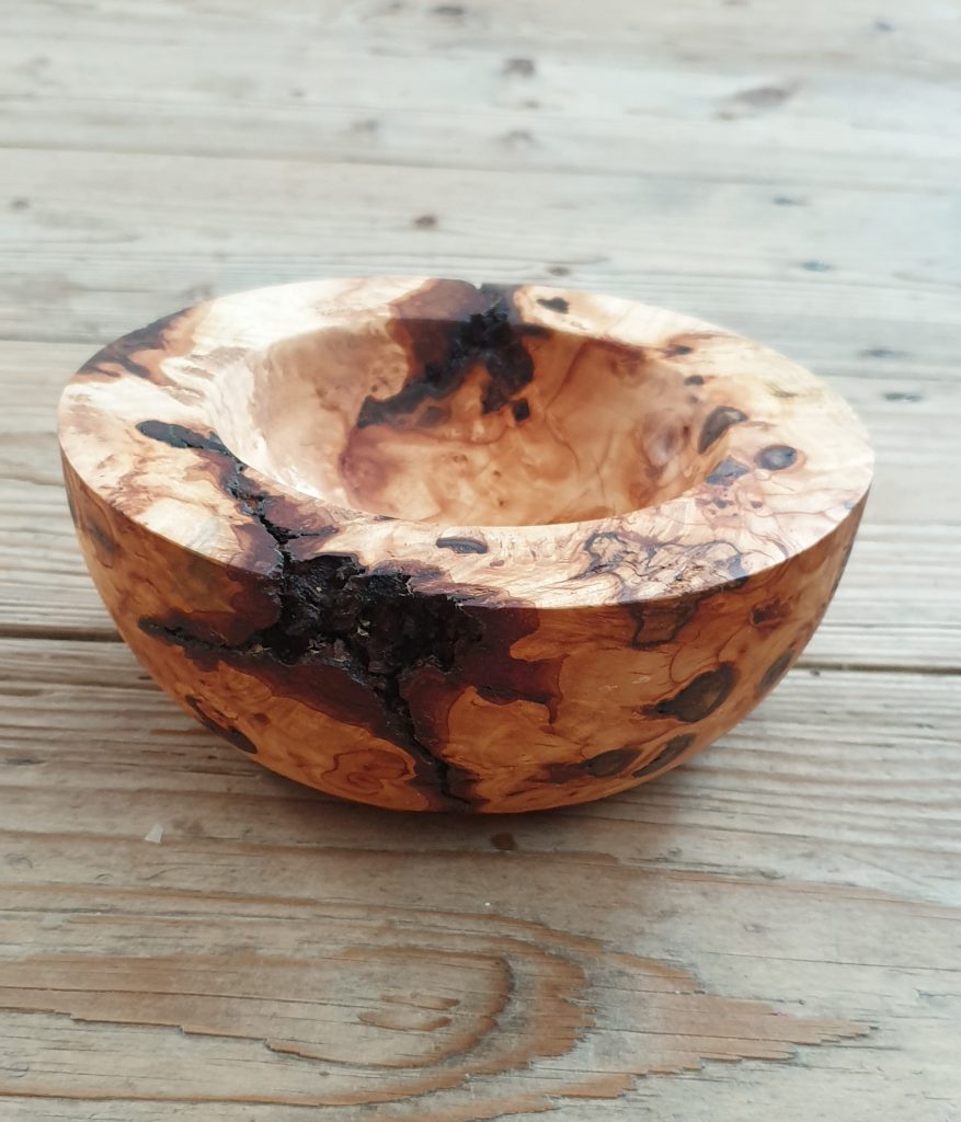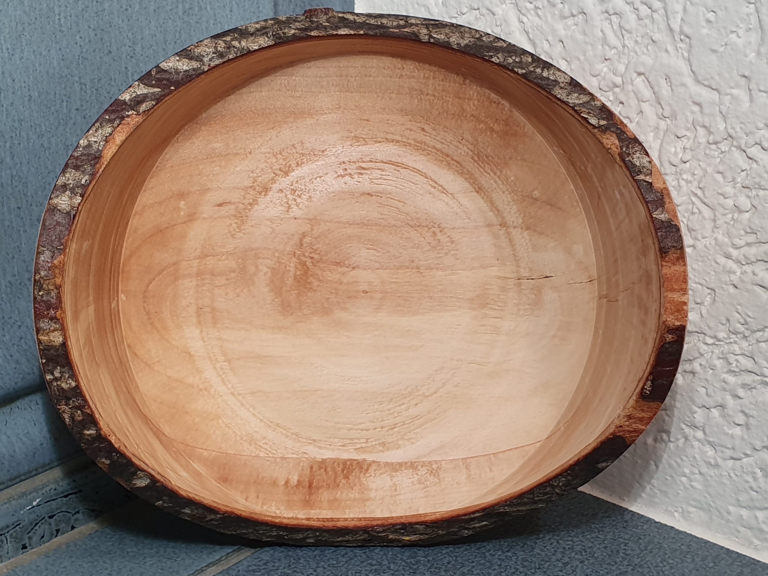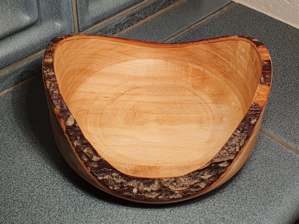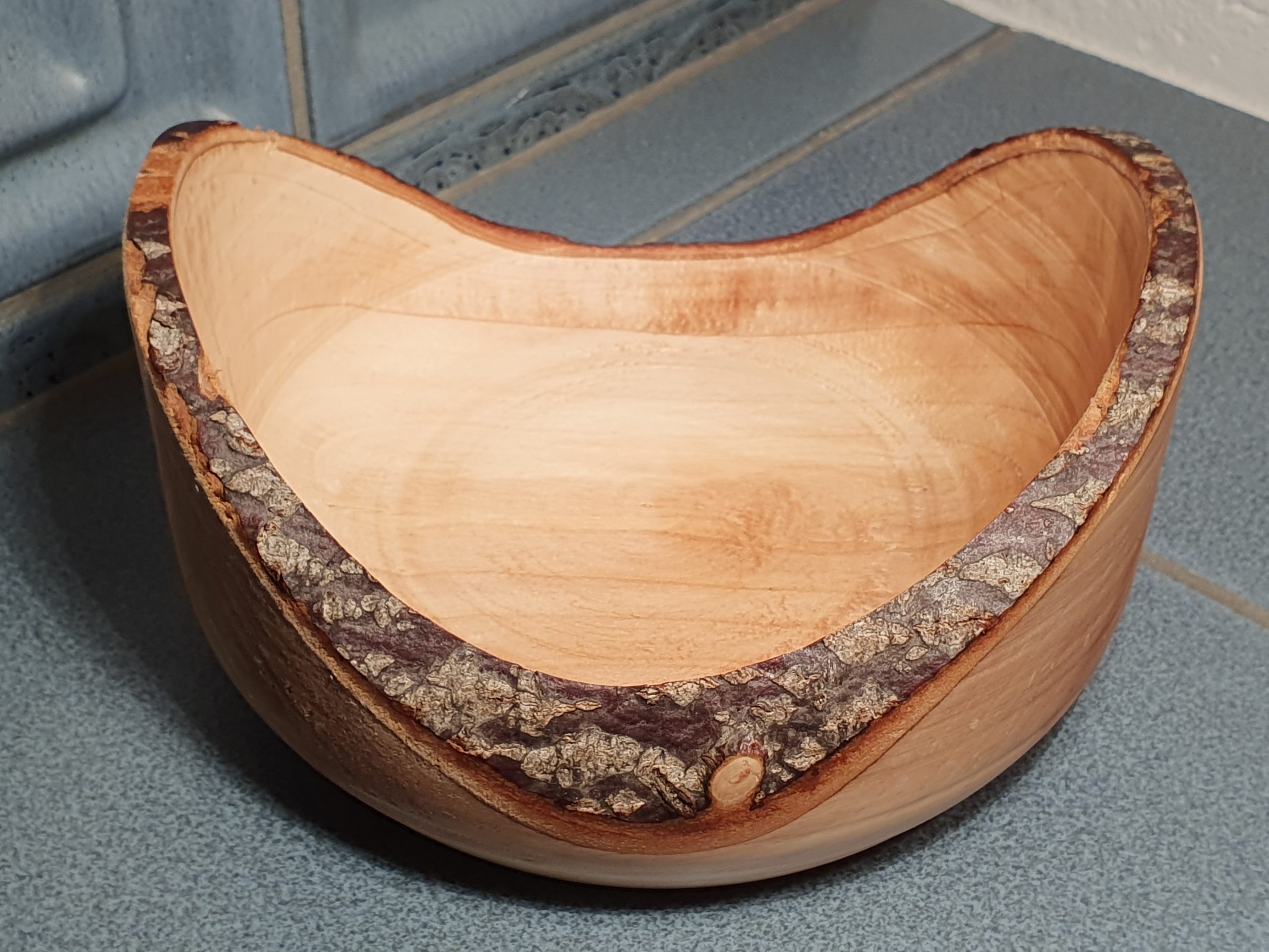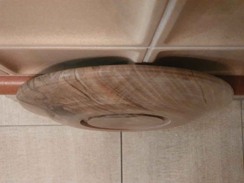 Mein zweiter Teller aus Eiche hat sich beim Trocknen sehr schön verzogen da er dünner als der erste gedrechselt wurde. Durch das Sandstrahlen sind die Jahresringe wunderbar zu erkennen. Die Oberfläche habe ich mit Schellack behandelt. Der Durchmesser beträgt ca. 280 mm, die Dicke ca. 2 mm.