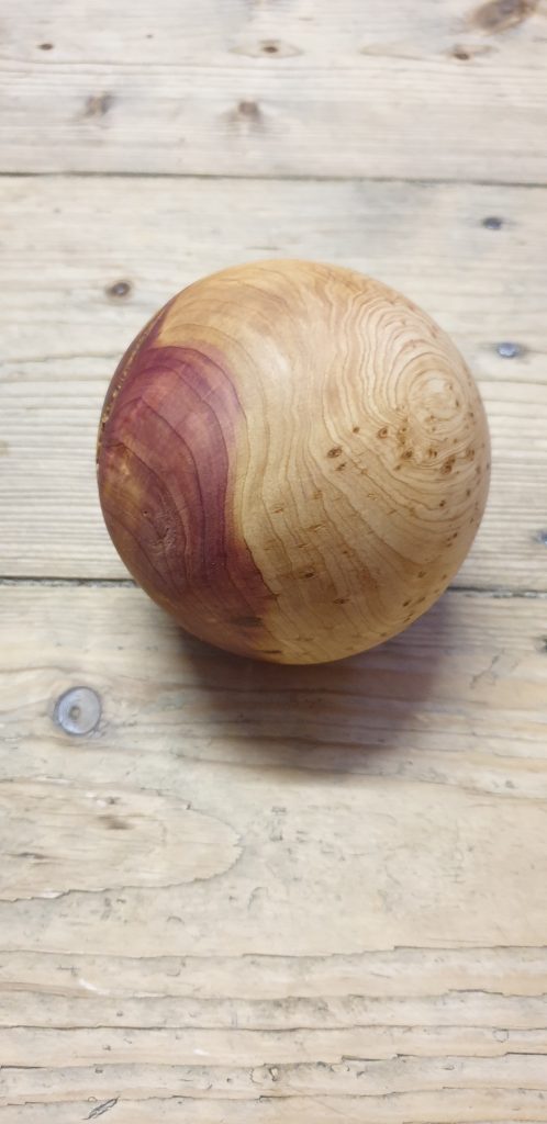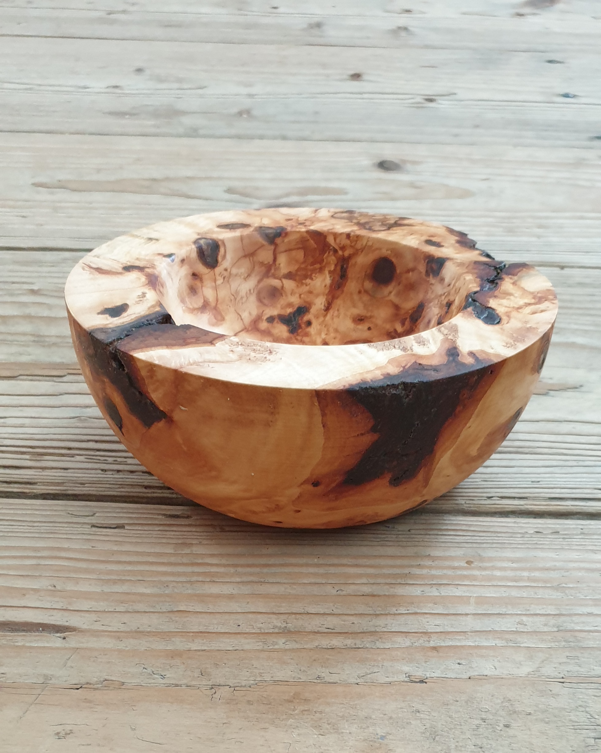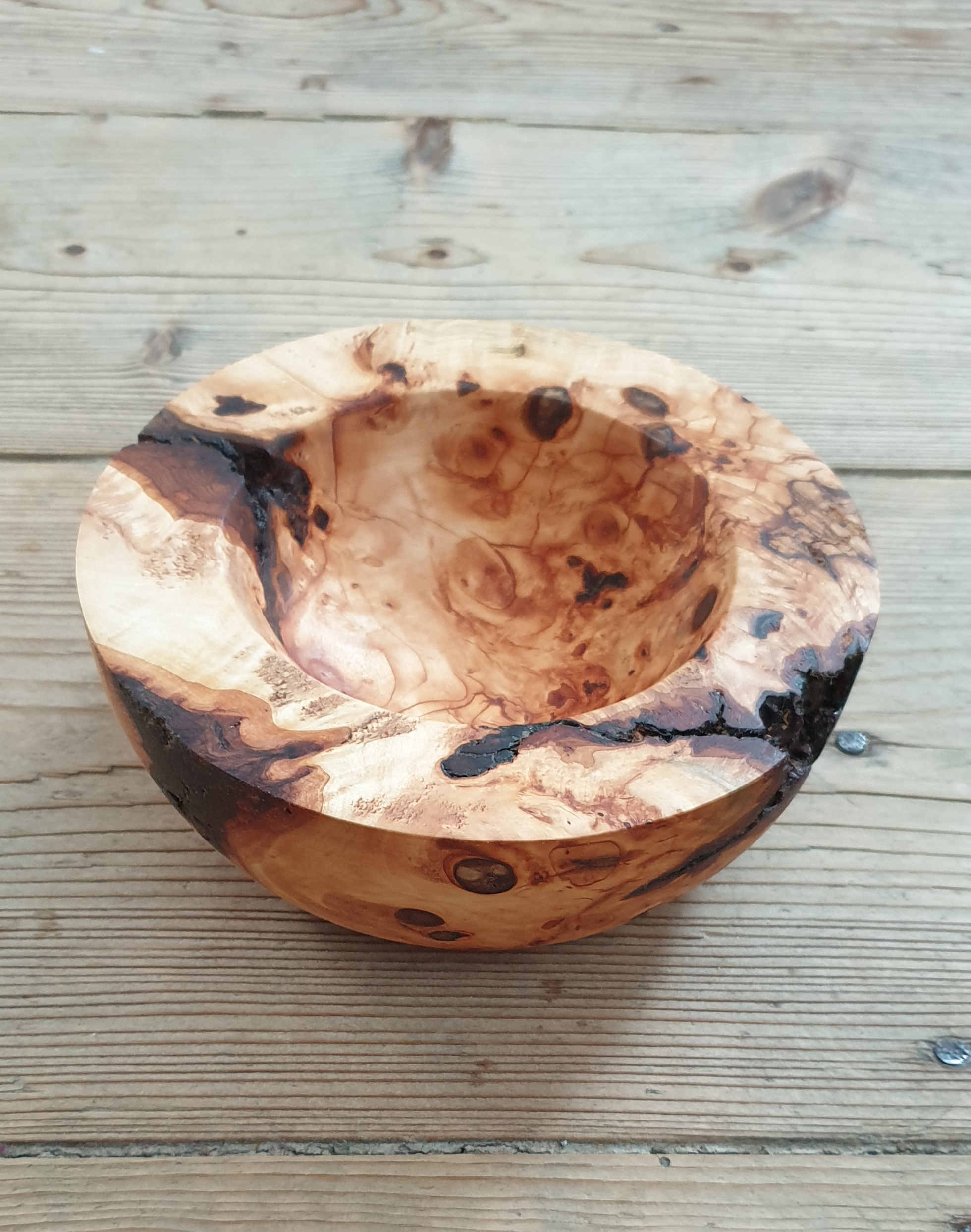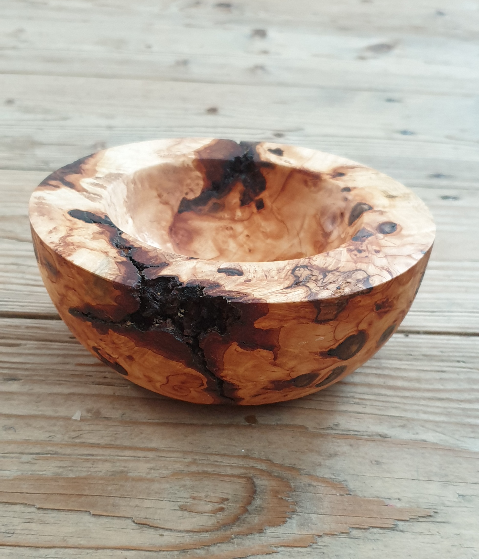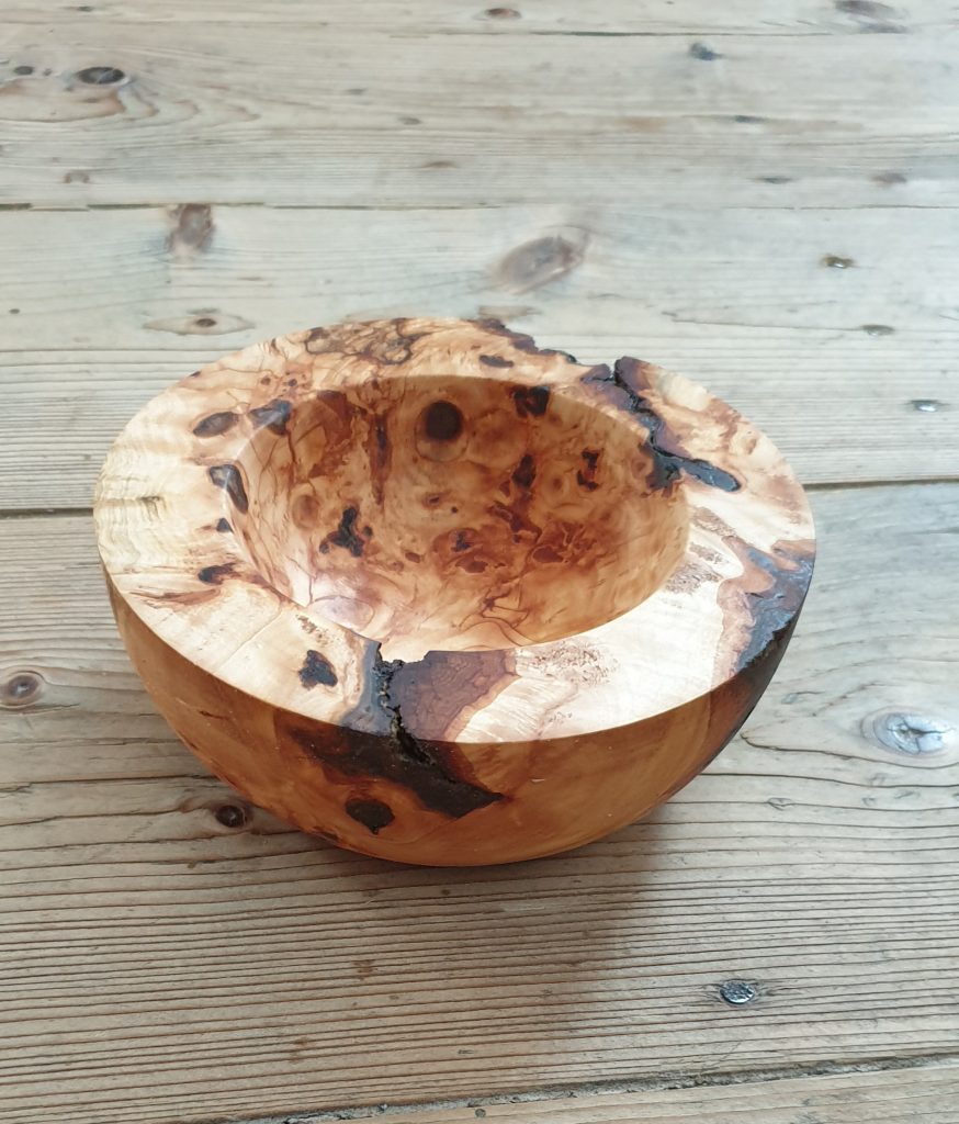 Mein zweiter Teller aus Eiche hat sich beim Trocknen sehr schön verzogen da er dünner als der erste gedrechselt wurde. Durch das Sandstrahlen sind die Jahresringe wunderbar zu erkennen. Die Oberfläche habe ich mit Schellack behandelt. Der Durchmesser beträgt ca. 280 mm, die Dicke ca. 2 mm.
