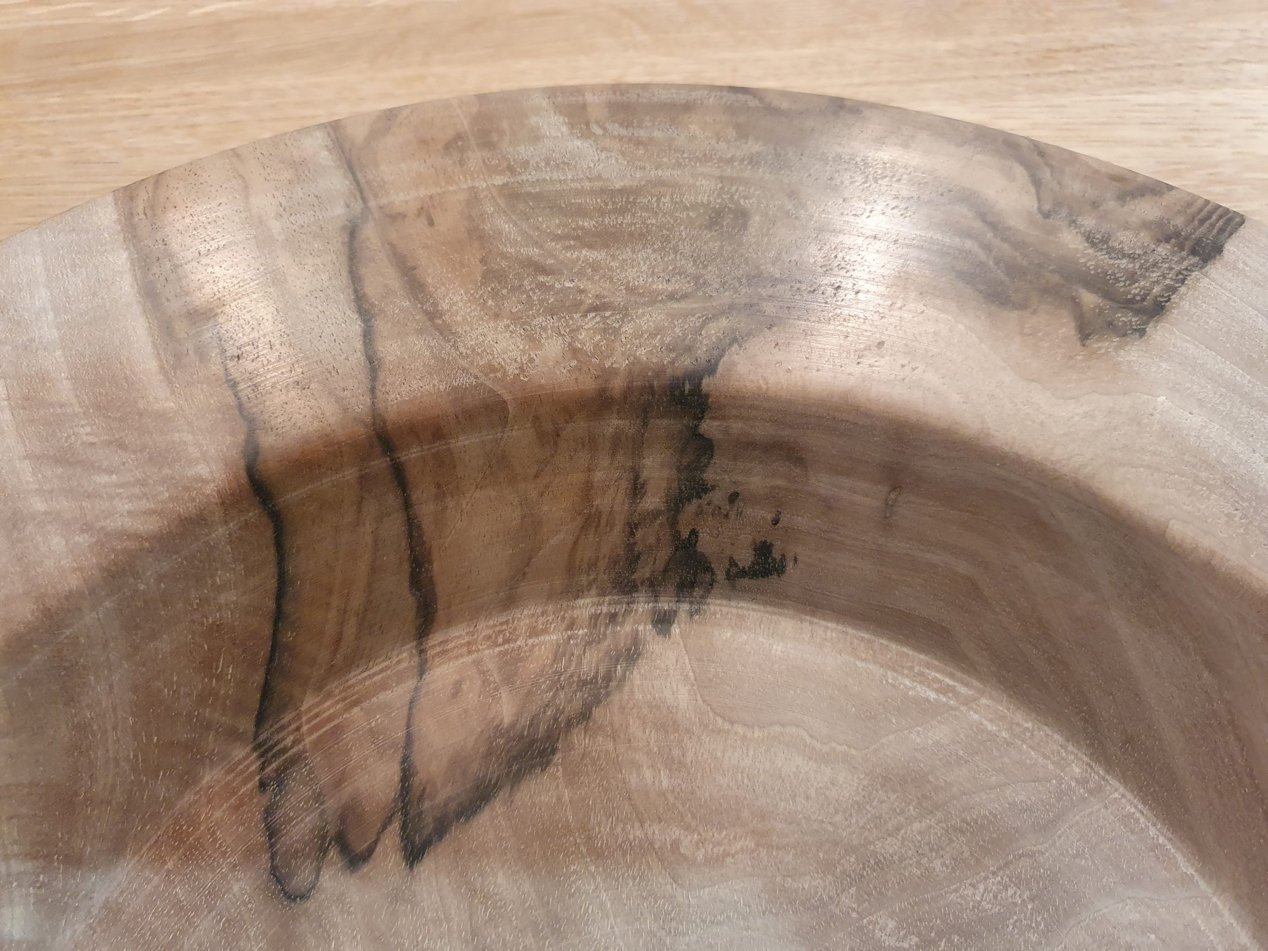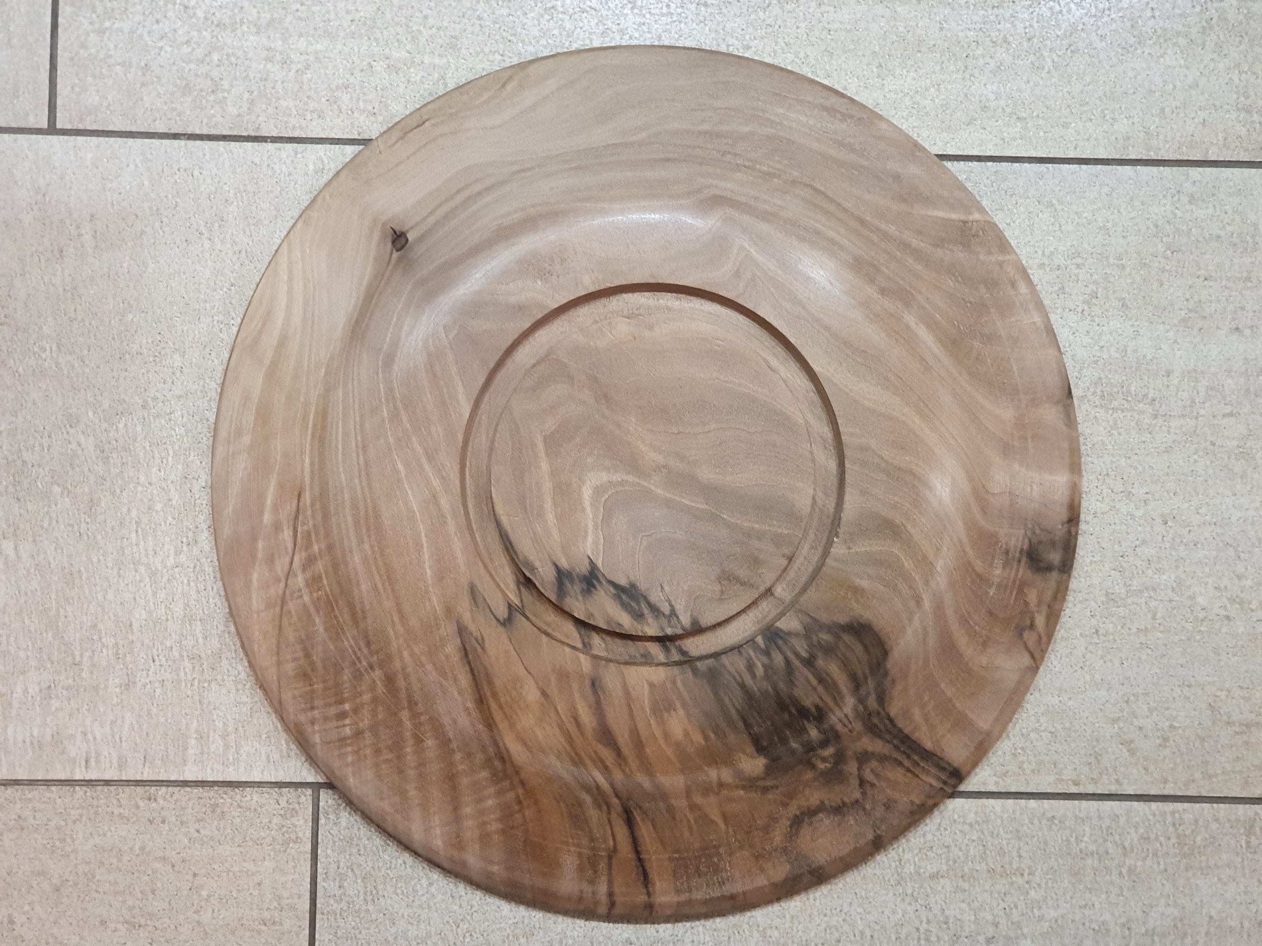 Diese Schale aus Nußbaumholz, mit einem Durchmesser von ca. 40cm und einer Höhe von ca. 5cm, wurde an einer Axminster Trade AT1628 VS und einem Oneway Spannfutter Stronghold von DICTUM gedrechselt. Wurde mit 400er Körnung geschliffen.