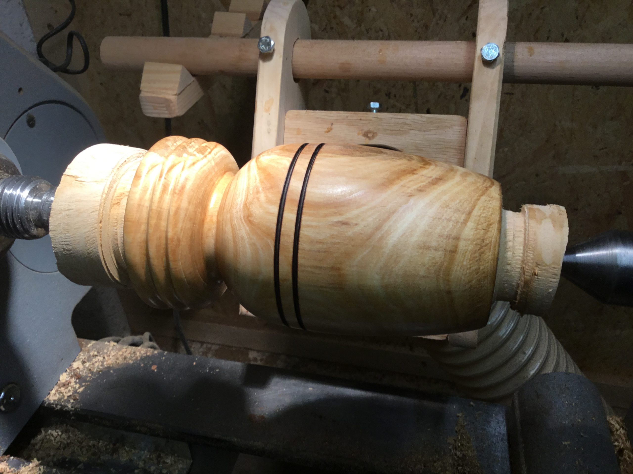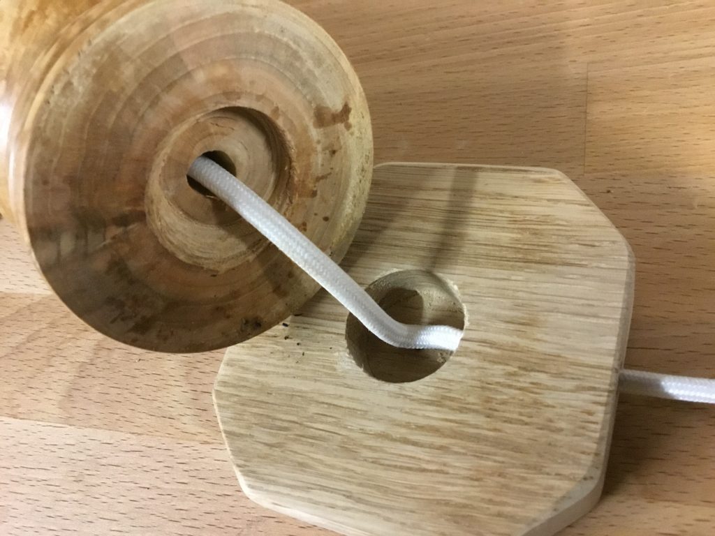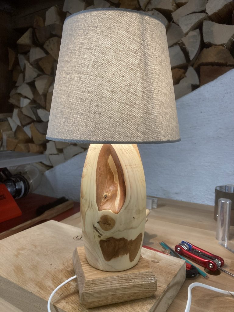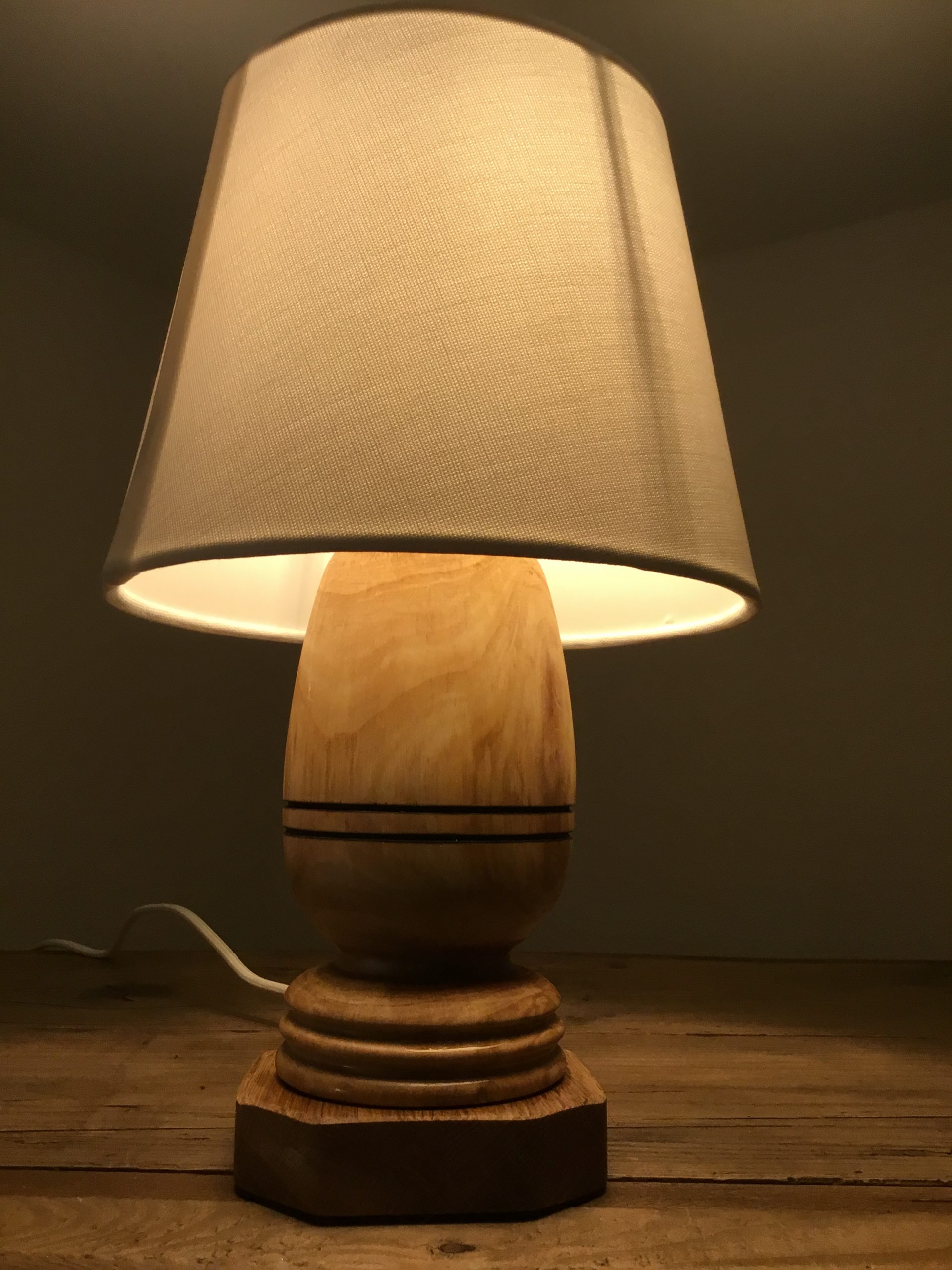 Die Tischleuchte ist 35 cm hoch und wurde aus Eibenholz gedrechselt. Die Oberfläche wurde abschließend mit Danish Oil von DICTUM behandelt.