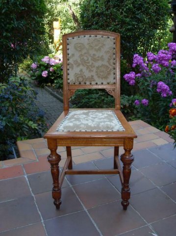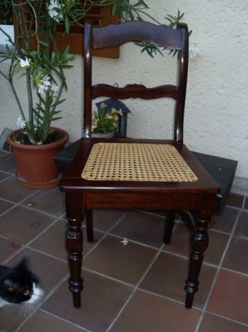 Wieder einmal war es ein Bodenfund von alten Stühlen in einem teilweise sehr schlechten Zustand. Die Aufgabe bestand darin einige Fehlteile neu zufertigen, kpl. zerlegen und wieder zusammen zu fügen, Fehlteile zuersetzen (Querstreben zu drechseln). Eckverbindungen mit Schnitzeinlage herstellen, beizen, Sitzfläche neu zu flechten mit Rohrmaterial 2,25mm und mit Schellack (natur) zuversiegeln. Zum Einsatz kamen verschiedene Holzbearbeitungwerkzeuge (Stechbeitel, Schnitzeisen, Drechselbank, Minihobel u.a.).