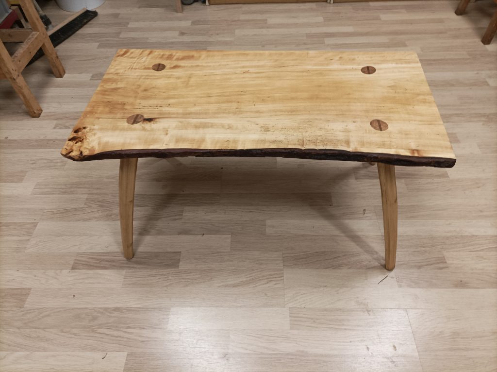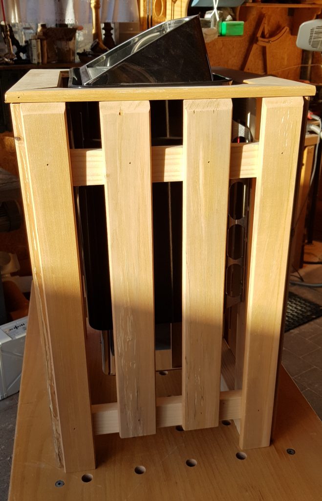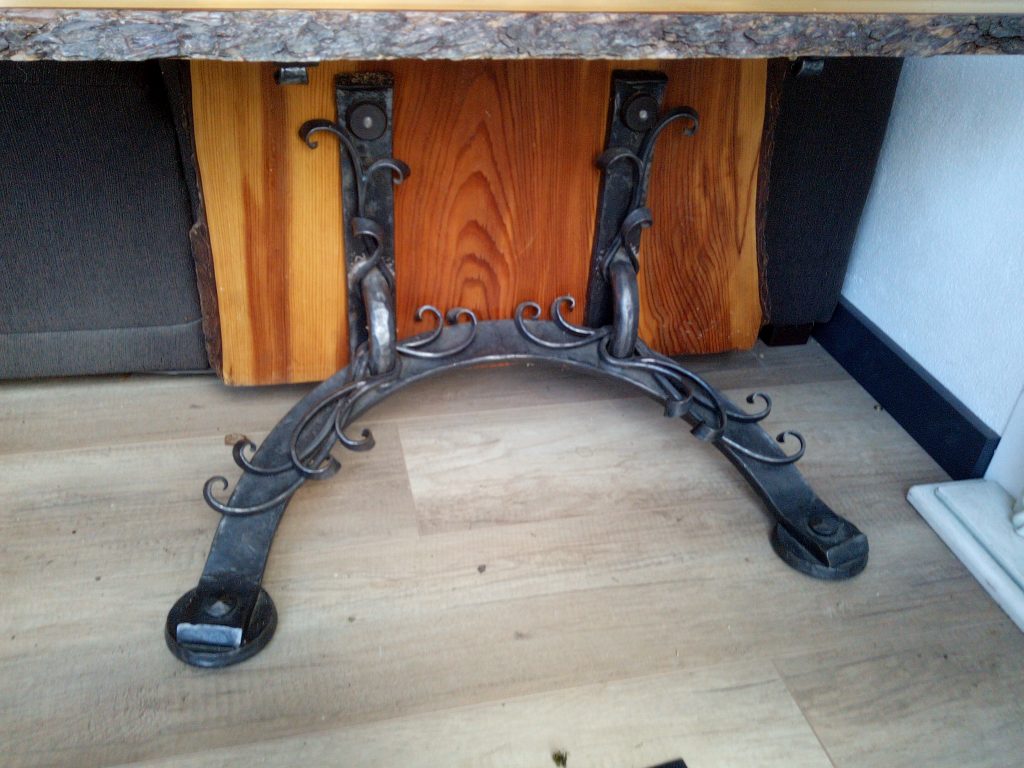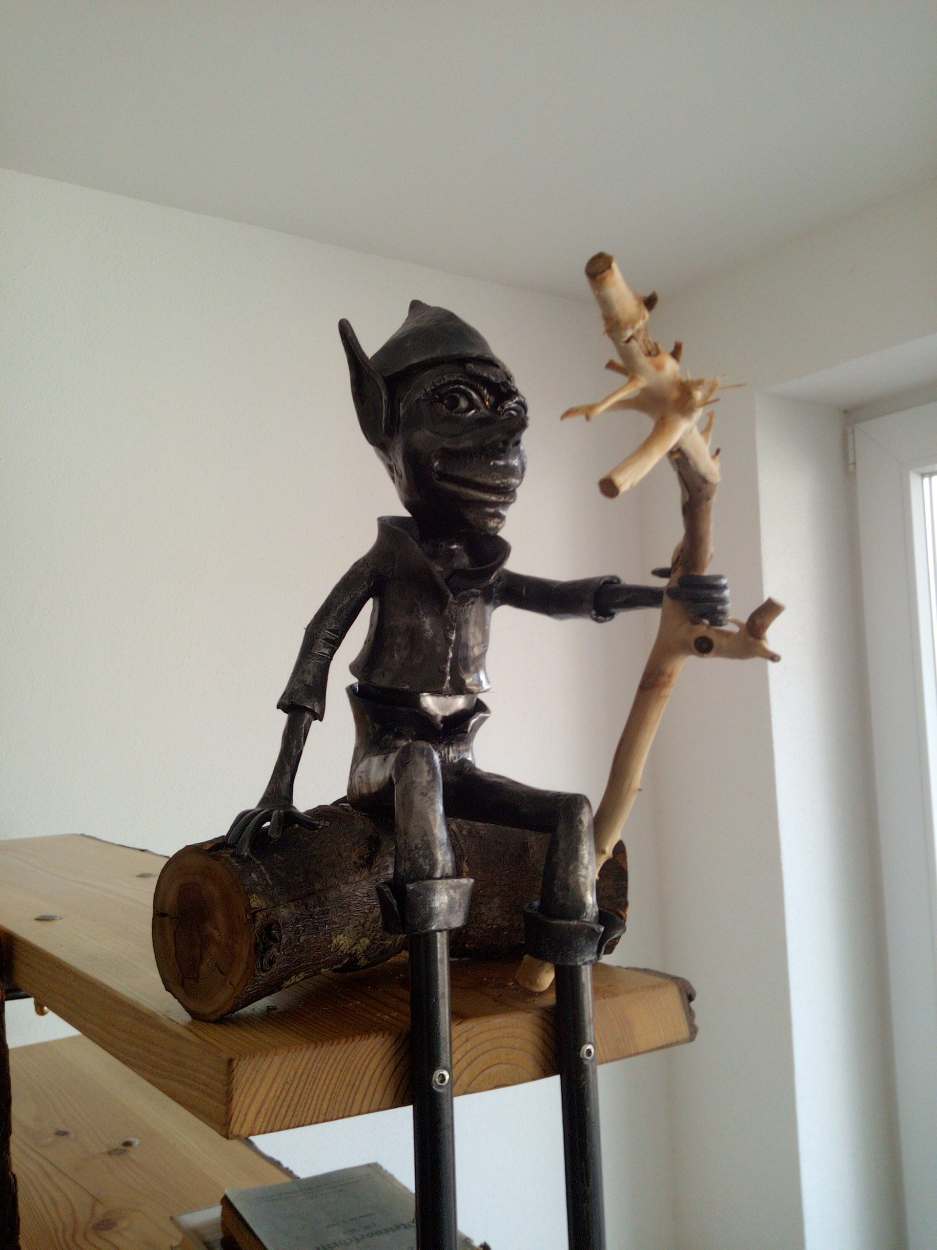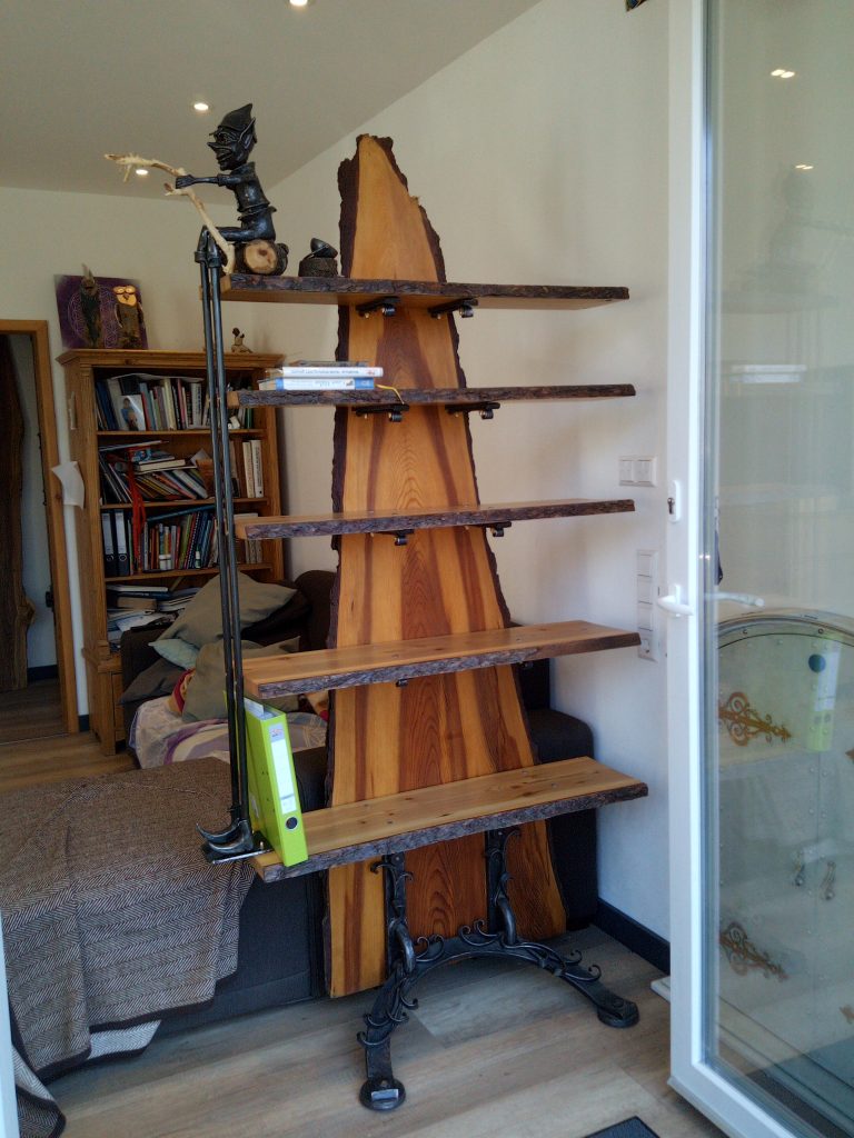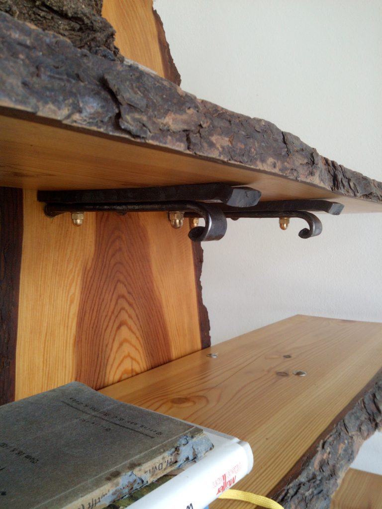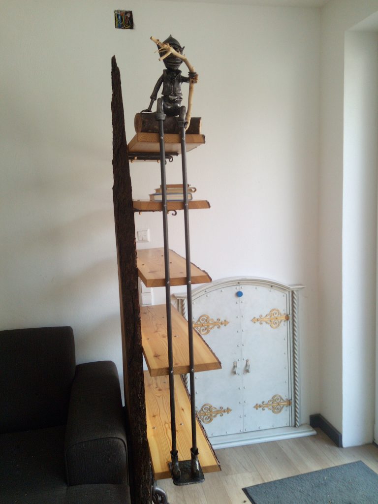 Regalholz aus Lärche mit Schmiedeeisen kombiniert. Der oben sitzende Wichtel mit seinen langen Beinen (die zur Stabilität beitragen) können als Magnethalter benutzt werden. Das Holz ist mit ASUSO Lärchenöl und dann mit Kirjes Ölwachs behandelt worden. Die Schmiedeeisernen Querbretthalter wurden mit TITEBOND PU-Kleber eingeklebt. Alle Schmiedeteile sind mit Kirjes Ölwachs behandelt. Dies ist eine Gemeinschaftsarbeit. Holzarbeiten: Kraus Gerhard; Schmiedearbeiten: Schwab Karl-Heinz; Beratung: DICTUM