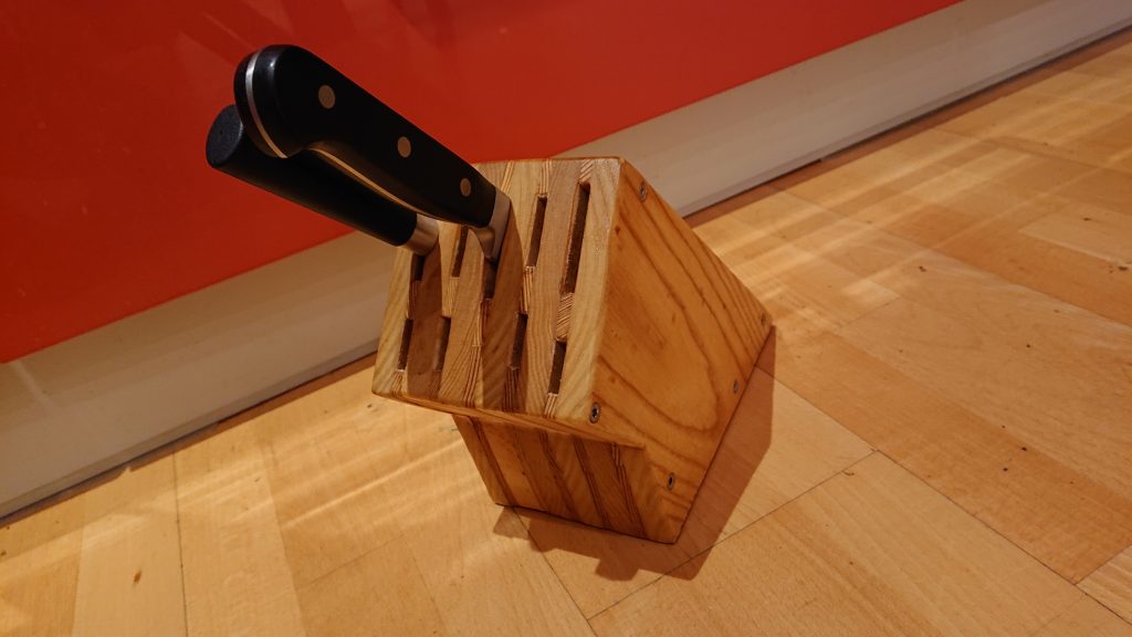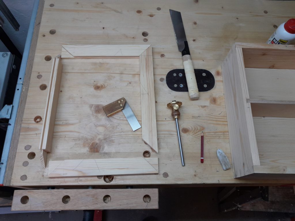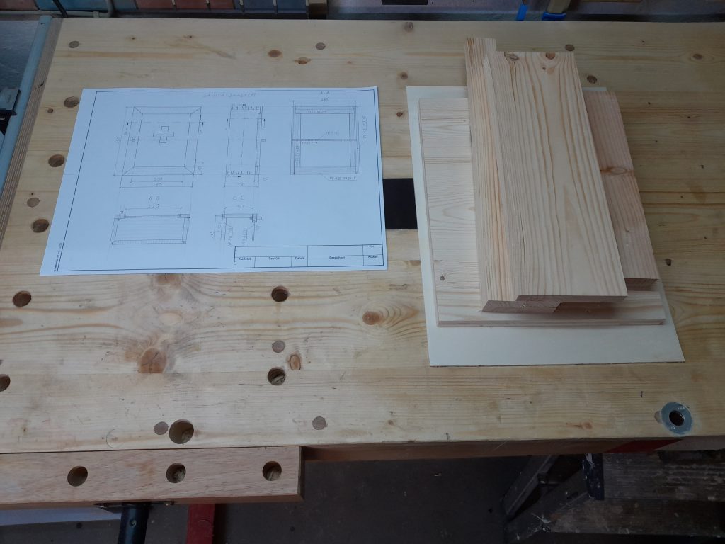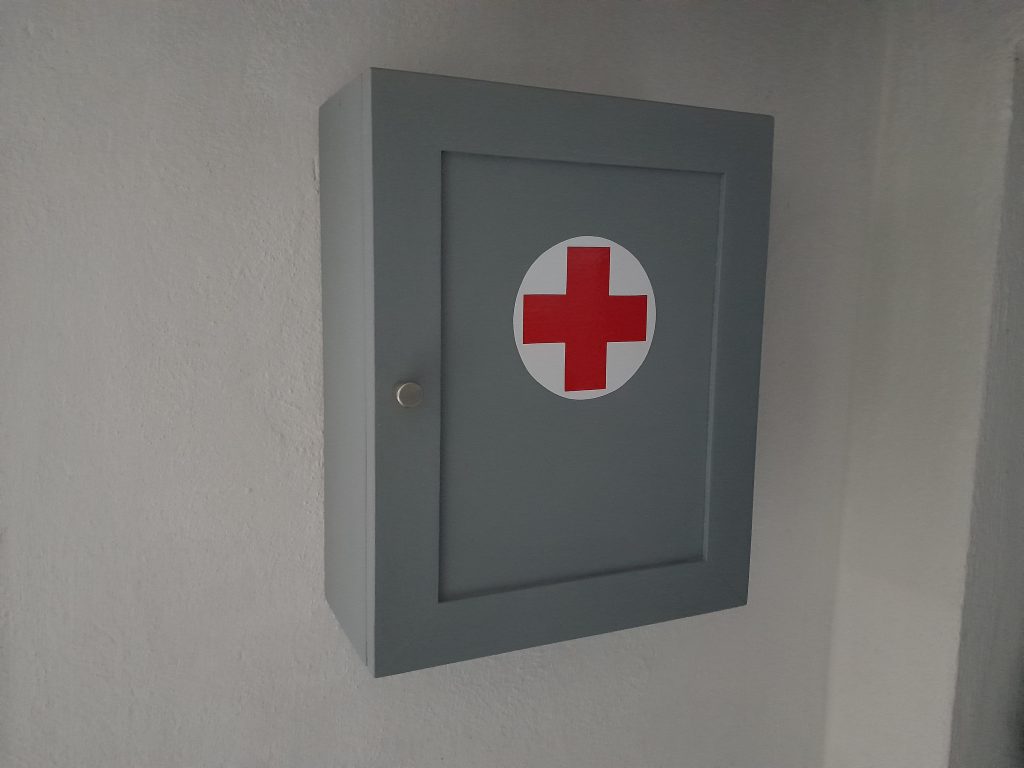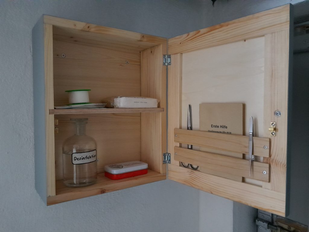 Für die Werkstatt habe ich einen Sanitätskasten gefertigt, der die wichtigsten Verbandsmaterialien enthält. Der Korpus ist mit Schwalbenschwanzzinken verbunden, die Rückwand ist eingefälzt. Die Türe habe ich in Rahmenbauweise mit Füllung hergestellt, was den Vorteil hat, dass die Innenseite der Türe zum Aufbewahren für flache Gegenstände wie Scheren, Pinzetten oder einer Erste-Hilfe-Anleitung verwendet werden kann. Anschließend habe ich den Korpus im für Sanitätskästen älterer Art typischen Grau lackiert und zur Kenntlichmachung ein Rotes Kreuz angebracht.