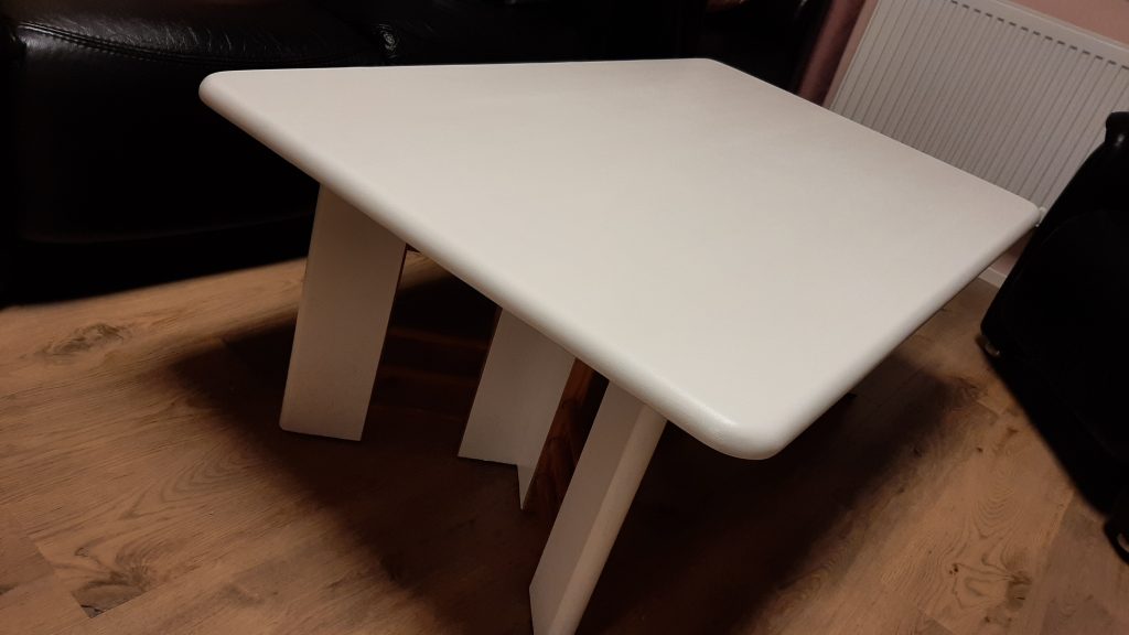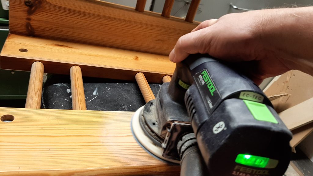 Ein lieb gewonnener Wohnzimmertisch sollte farblich angepasst werden. Dafür schliff ich mit einem Festool Exzenterschleifer die Oberflächen. Dazu nutzte ich ein Netzschleifmittel passend zu diesem Akkuschleifer. Beide, Akku Schleifer und Schleifmittel kaufte ich bei DICTUM. Nach dem Anschliff erfolgte die Grundierung und der neue Anstrich. Im Bereich der Tischbeine hinterließ ich Streben ungestrichen, so dass die Tischbeine filigraner in Erscheinung treten.