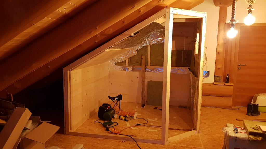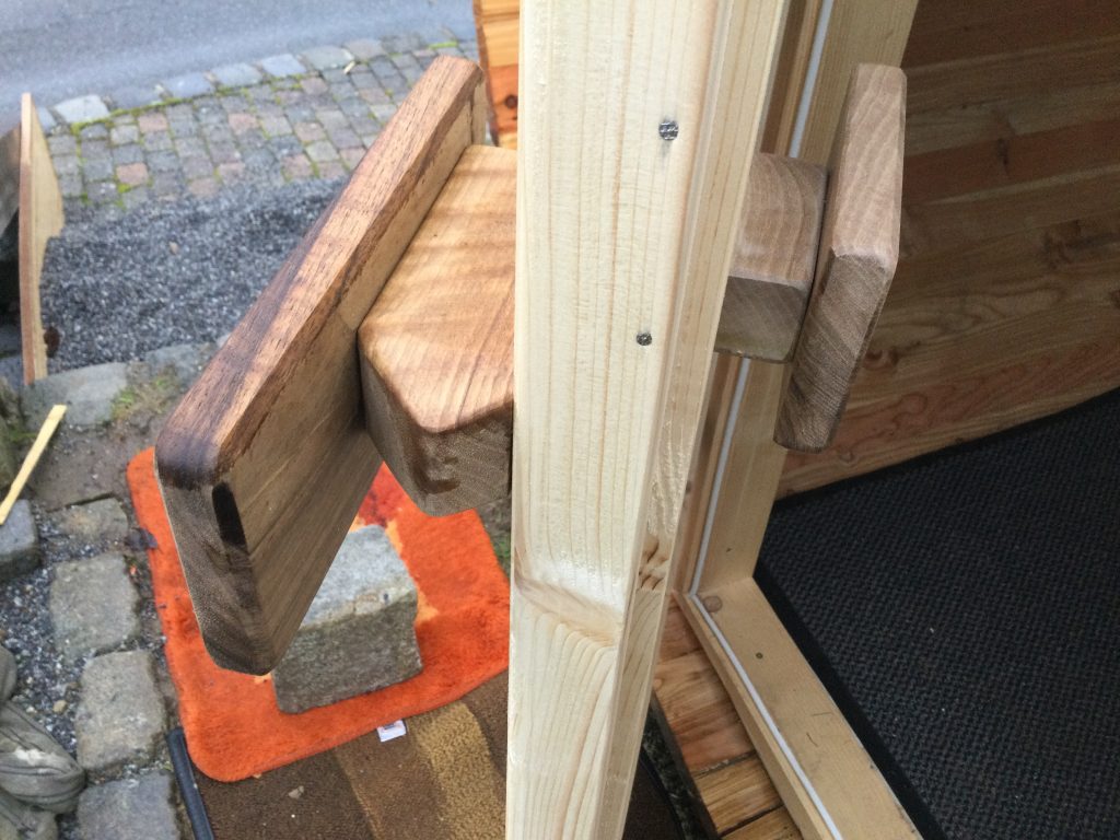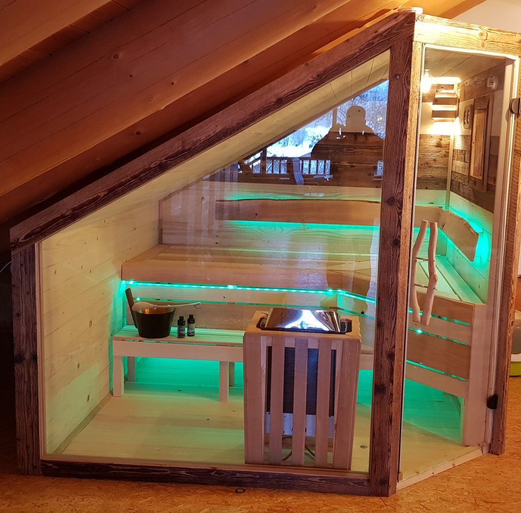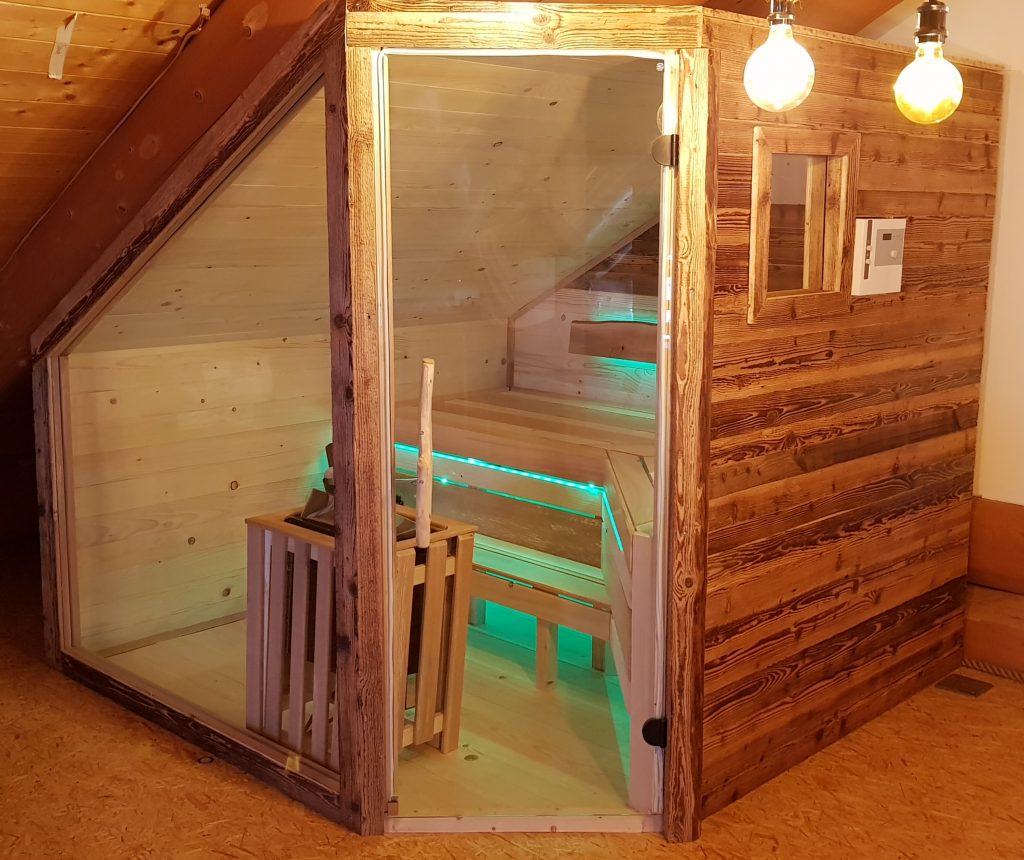 Sauna aus gebürstetem Altholz und Fichtenholz.