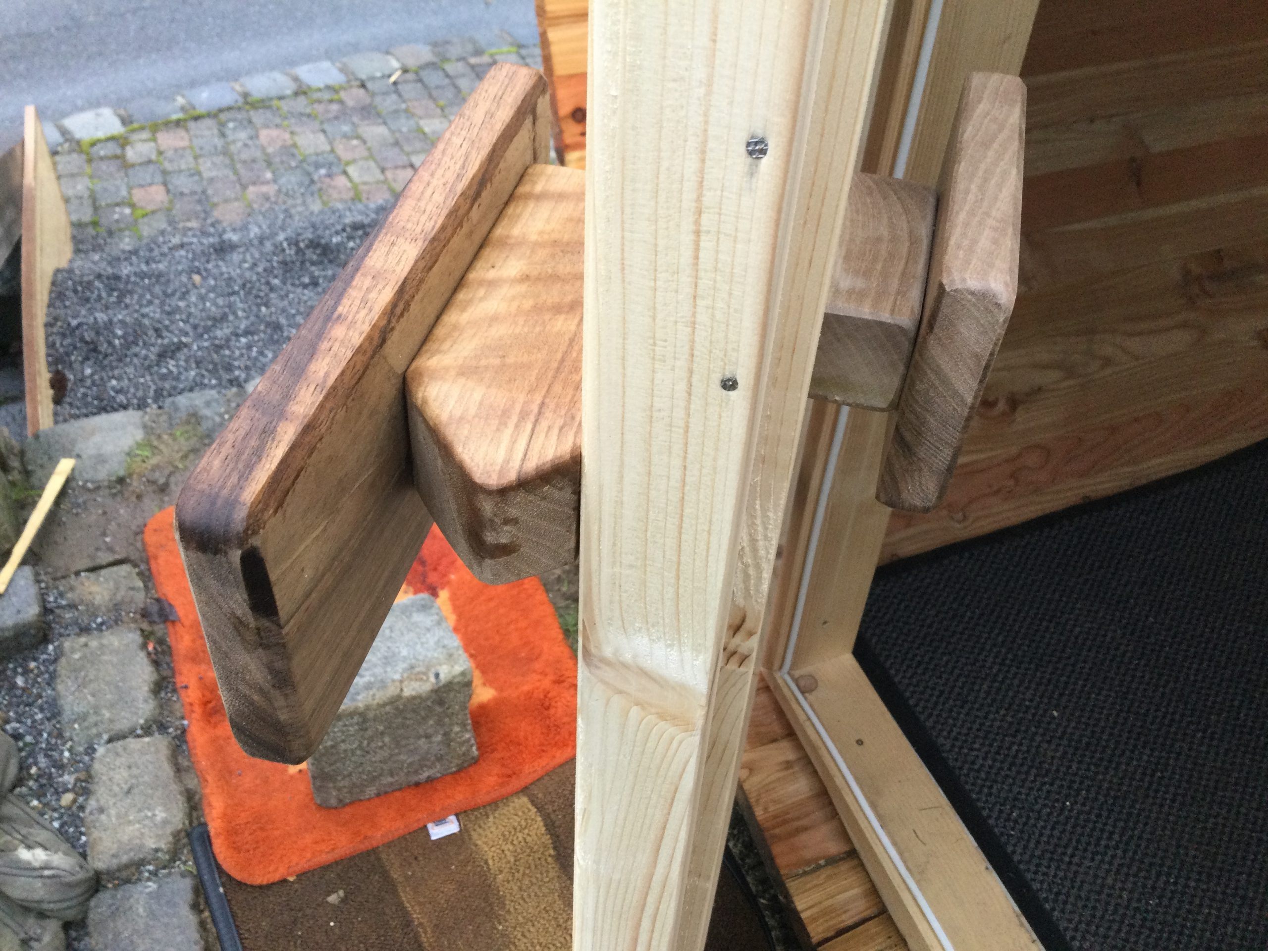 Diese Rückenlehne wurde mit einer Hobelmaschine hergestellt. Es wurde eine 30 Jahre alte Eichenbohle verarbeitet. Die Metallhalterungen wurden geschweißt und mit schwarzer Metallschutzfarbe bestrichen.