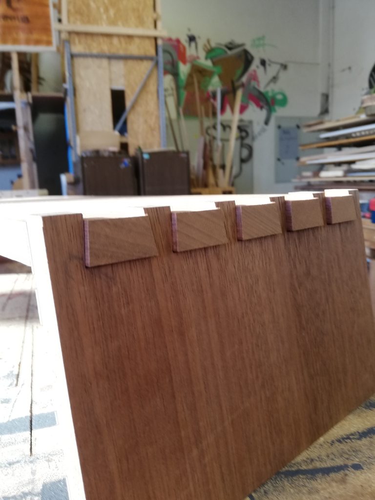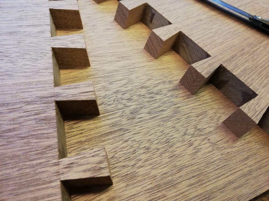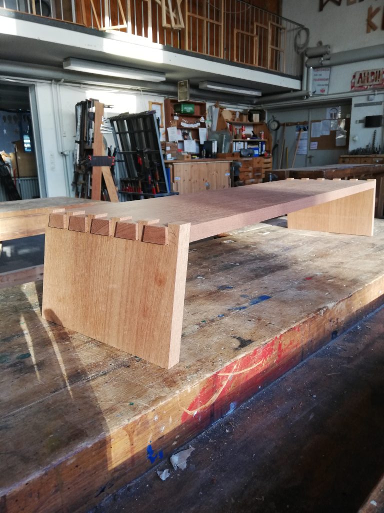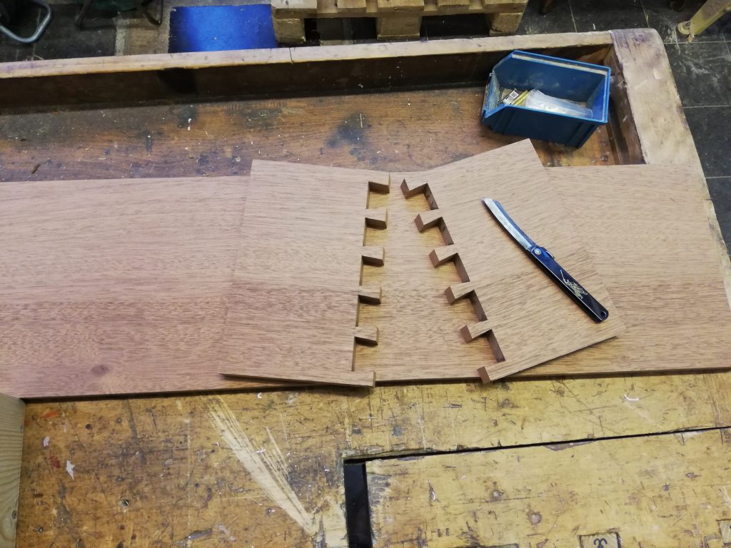 Aus zwei Brettern (eines mir unbekannten Holzes), die ich noch von meinem verstorbenen Vater hatte, habe ich mir einen Schrank für meine Schnitz- und Drechseleisen gebaut. Korpus mit offenen Schwalbenschwanzzinken, mit der Dozuki ausgesägt, Deckel mit überschobener Füllung. Statt eines Griffes ist eine Hohlkehle eingefräst. Sowohl die Schnitzeisen, als auch der Großteil der Crown und Henry Taylor finden hier einen sicheren Platz und sind einfach entnehmbar.