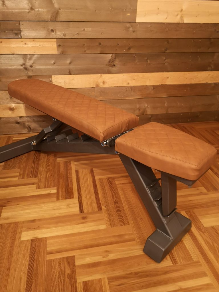 Terassentisch aus Meranti und Wenge auf einem Stahlgestell. Mit Danish Oil behandelt.