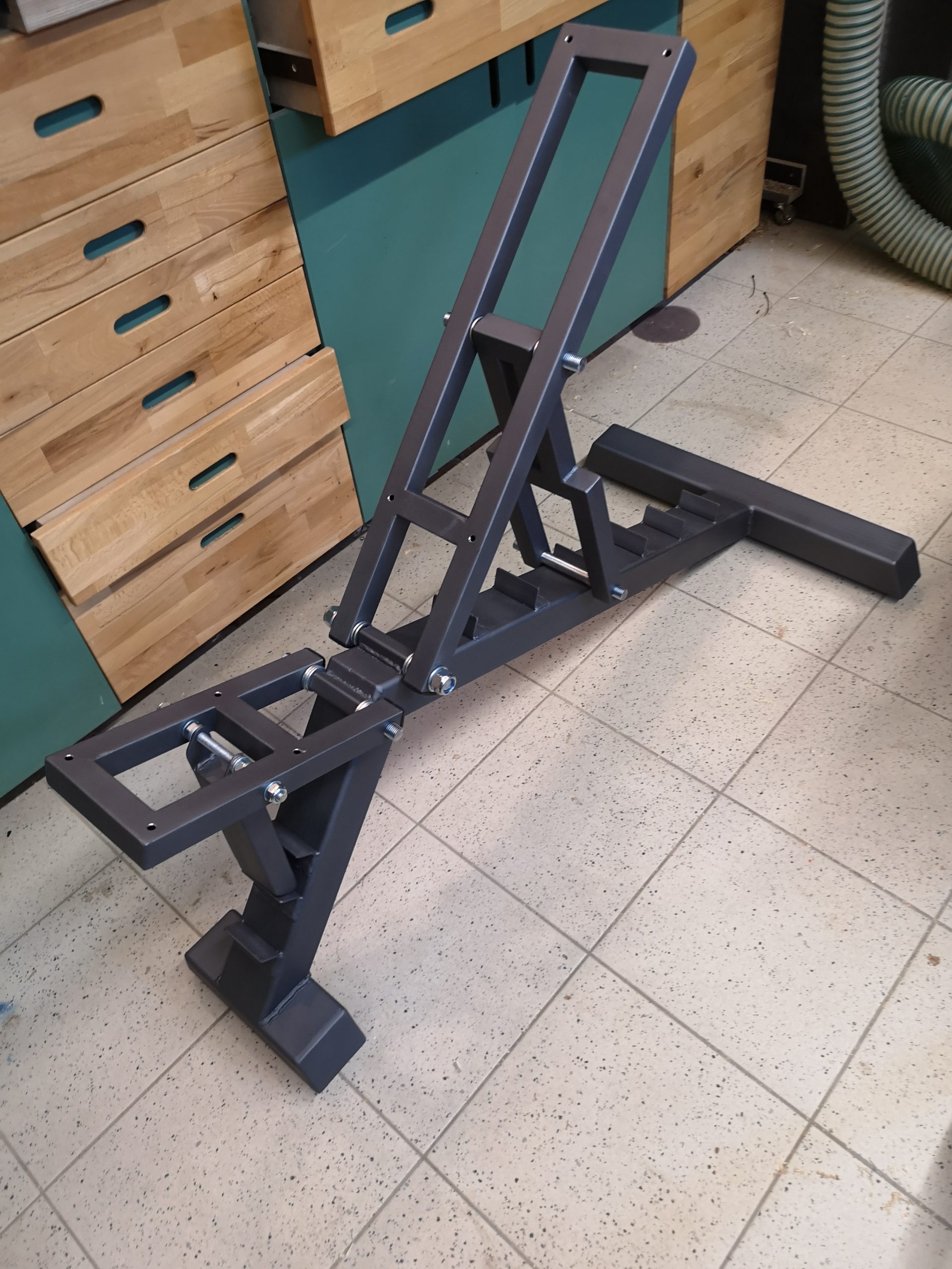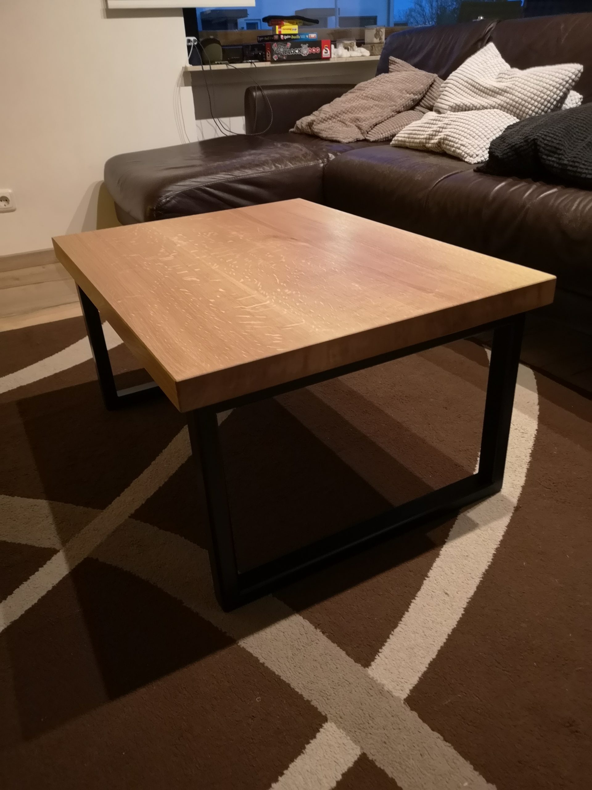 Terassentisch aus Meranti und Wenge auf einem Stahlgestell. Mit Danish Oil behandelt.