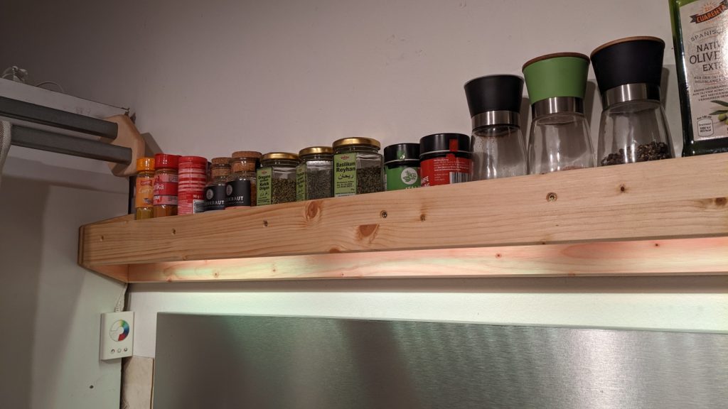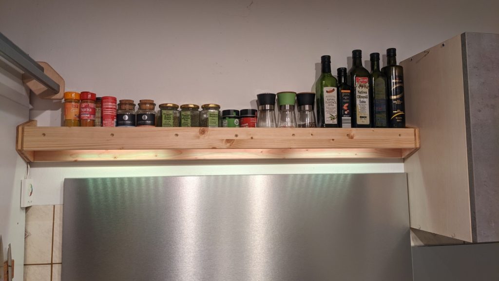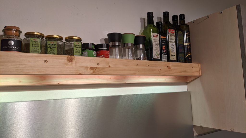 Da wir über dem Kochfeld weder Schränke noch eine Dunstabsaugung haben, wollte ich dort schon länger eine ablage für die Gewürze/Öle etc anbringen. Die Ablage ist nur seitlich in die Schränke geschraubt, da ich nicht in die Wand bohren wollte. Da ich bei einer Spannweite von gut 1,2m auf Nummer sicher gehen wollte habe ich einiges an Verstärkung sowohl hinten als auch vorne angeschraubt, wie zu erwarten war ist es nun völlig überdimensioniert stabil. Der RGB-LED-Streifen der praktischerweise von der vorderen Versteifung verdeckt wird ist eigentlich nur eine Spielerei, aber vielleicht machen wir ja irgendwann mal Disko in der Küche.