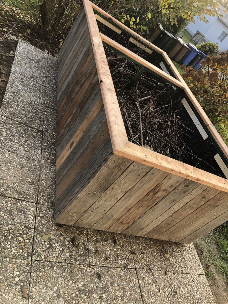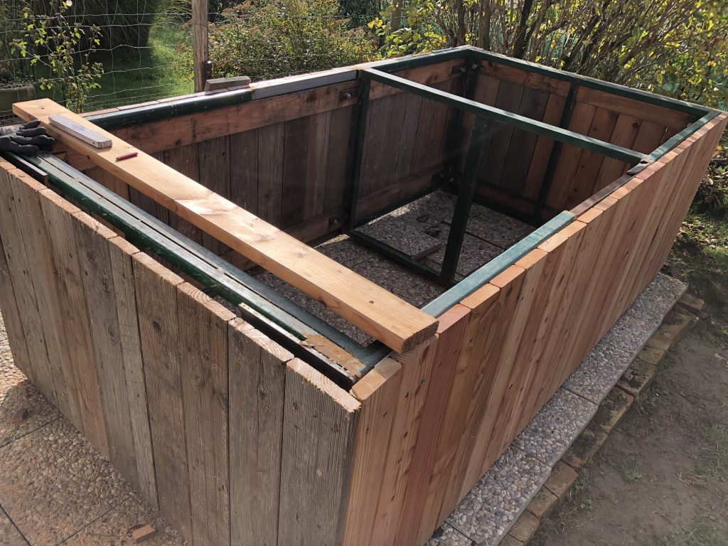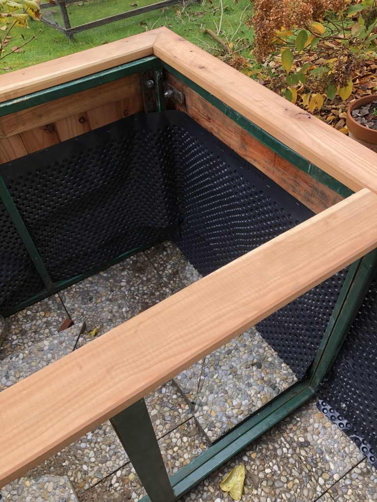 Das Grundgestell ist ein altes Stahlregal, das mit Winkelschleifer und Schweissgerät für sein neues Dasein als Gartenbeet umgebaut wurde. Beplankt wurde die Eisenkonsttuktion anschließend mit gehobelter Lärche (3cm stark).