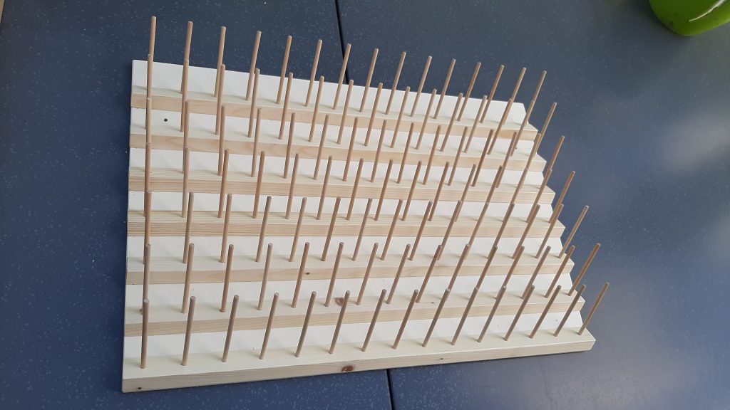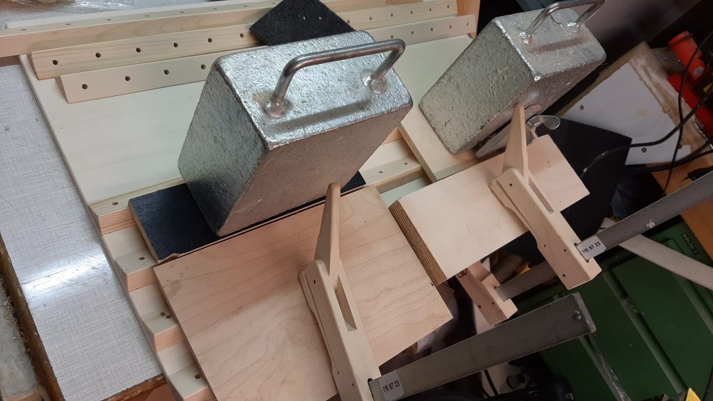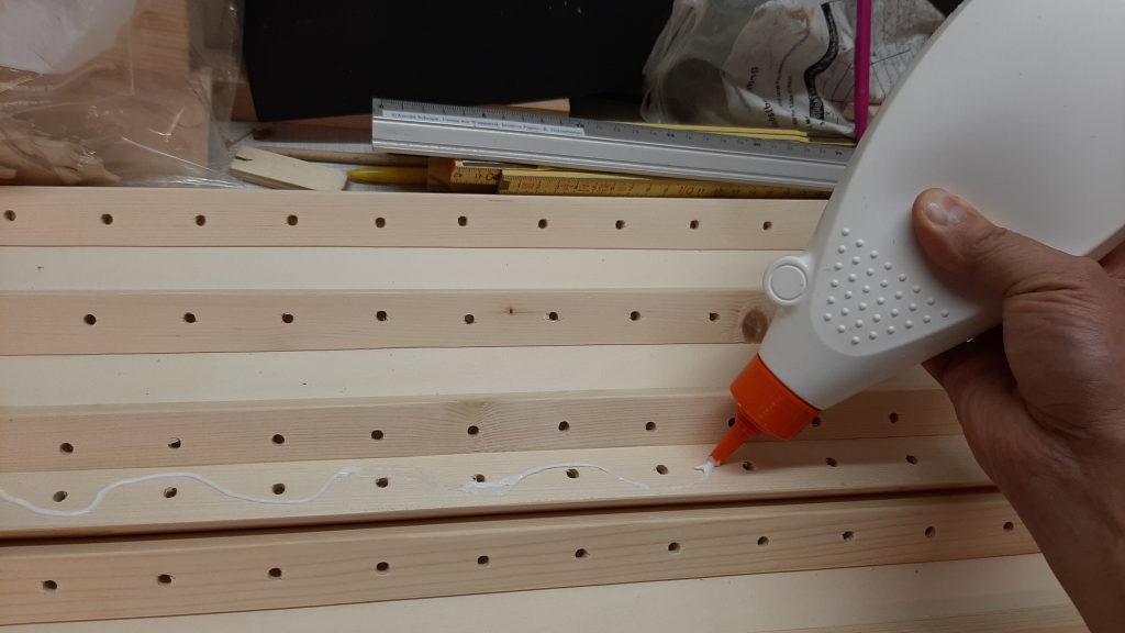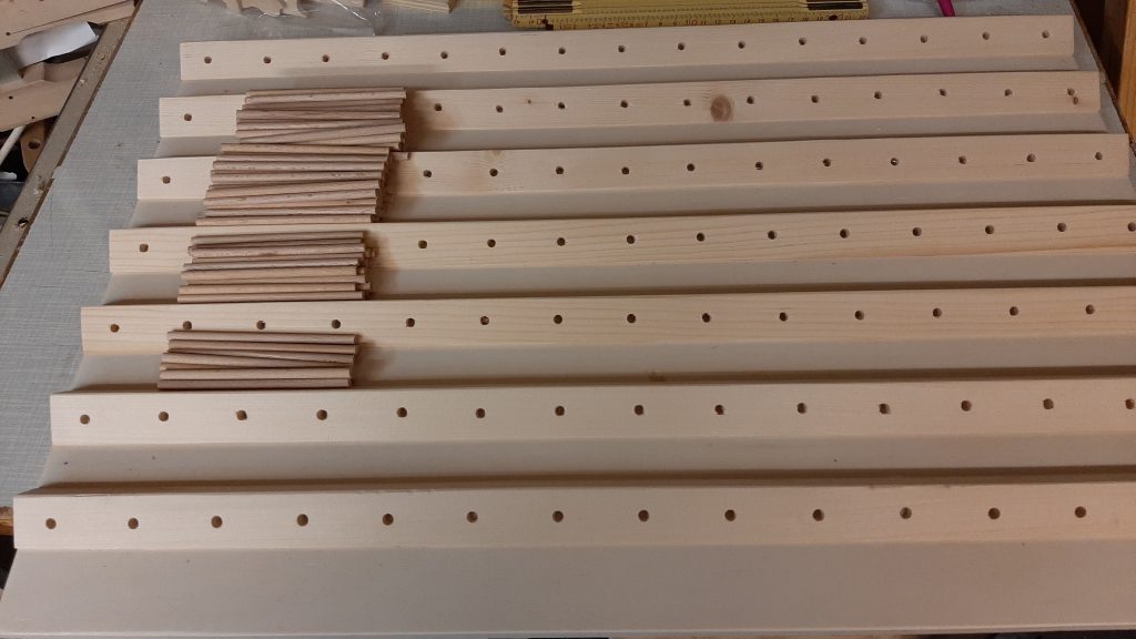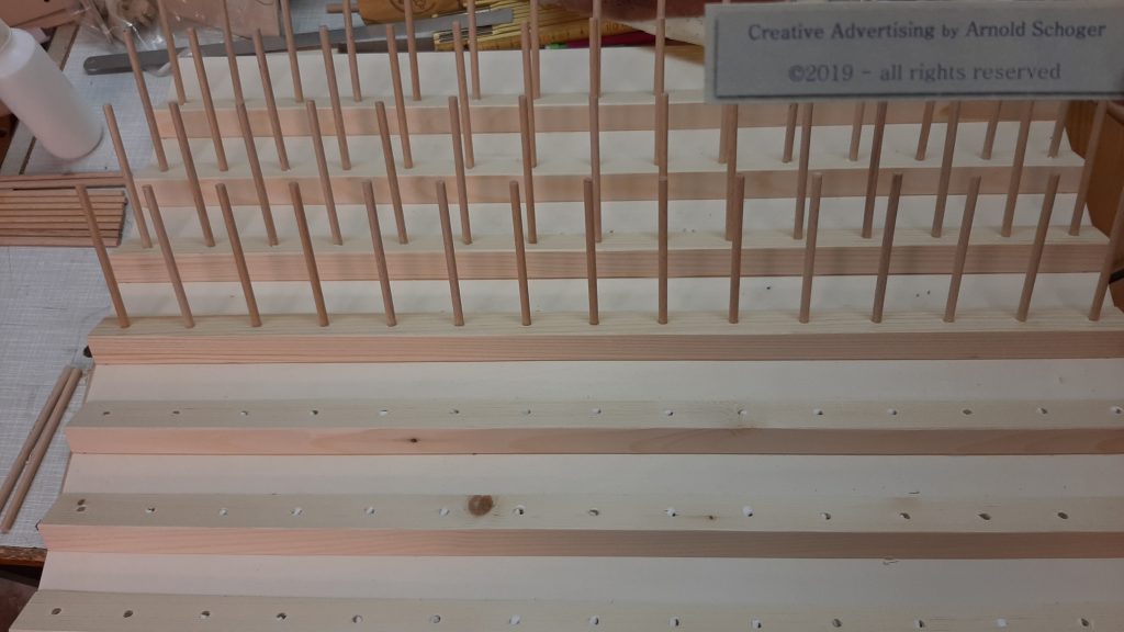 Diese Wandhalterung habe aus einer 12mm Sperrholzplatte und passend zugesägten Kanthölzer hergestellt. Die Kanthölzer sägte ich dazu an der Tischkreissäge diagonal der Länge nach entzwei. Diese nun im Querschnitt dreieckigen Holzleisten bohrte ich für die Rundstäbe an der Tischbohrmaschine im passenden Winkel auf. Die Rundstäbe leimte ich mit Holzleim in die vorher auf die Rückwand aufgeleimte Leisten. Gewichte und Leimzwingen waren mir dabei hilfreich