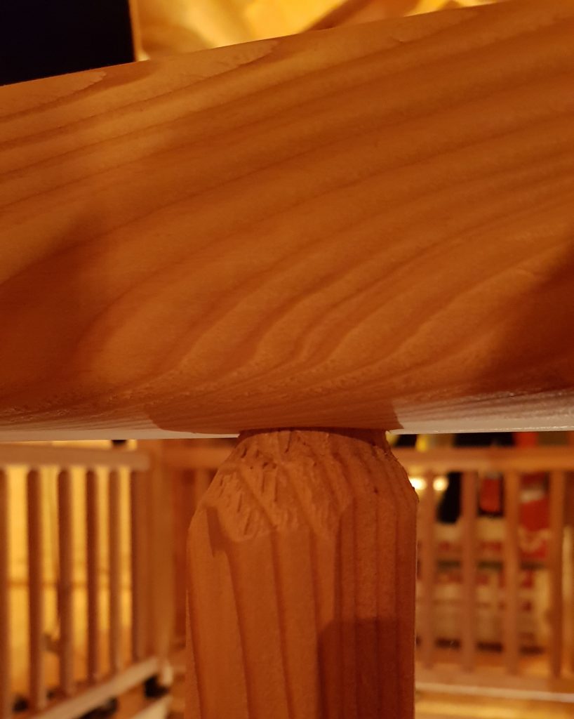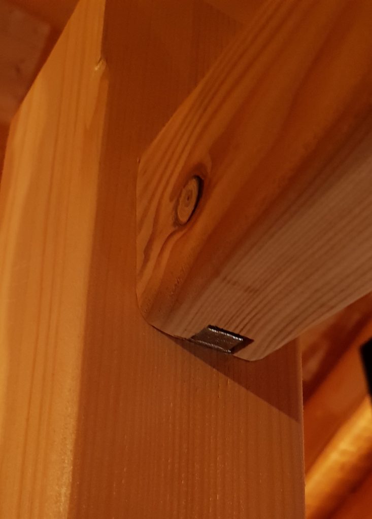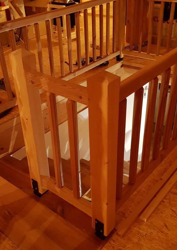 Aus Lärche gefrästes Geländer. Zapfenverbindung mit dem Veritas Zapfenschneider hergestellt. Seitlich mit Möbelverbinder eingehängt mit der Festool Oberfräse ausgearbeitet.