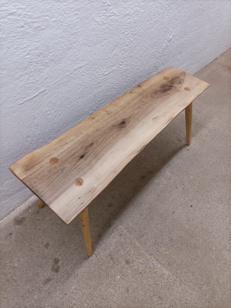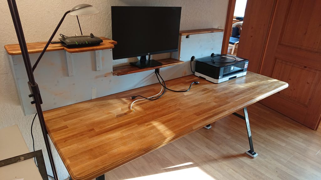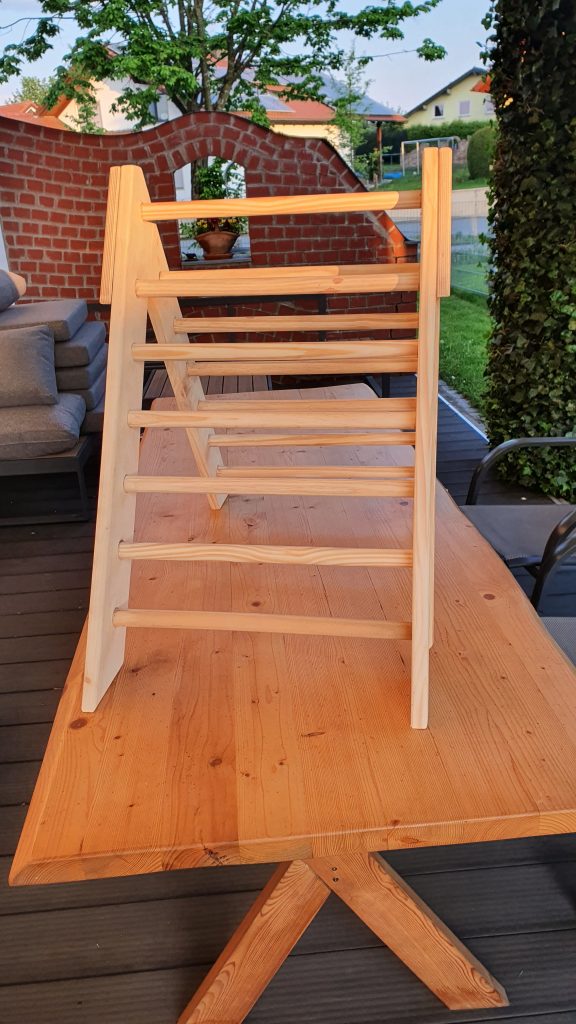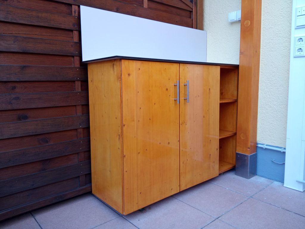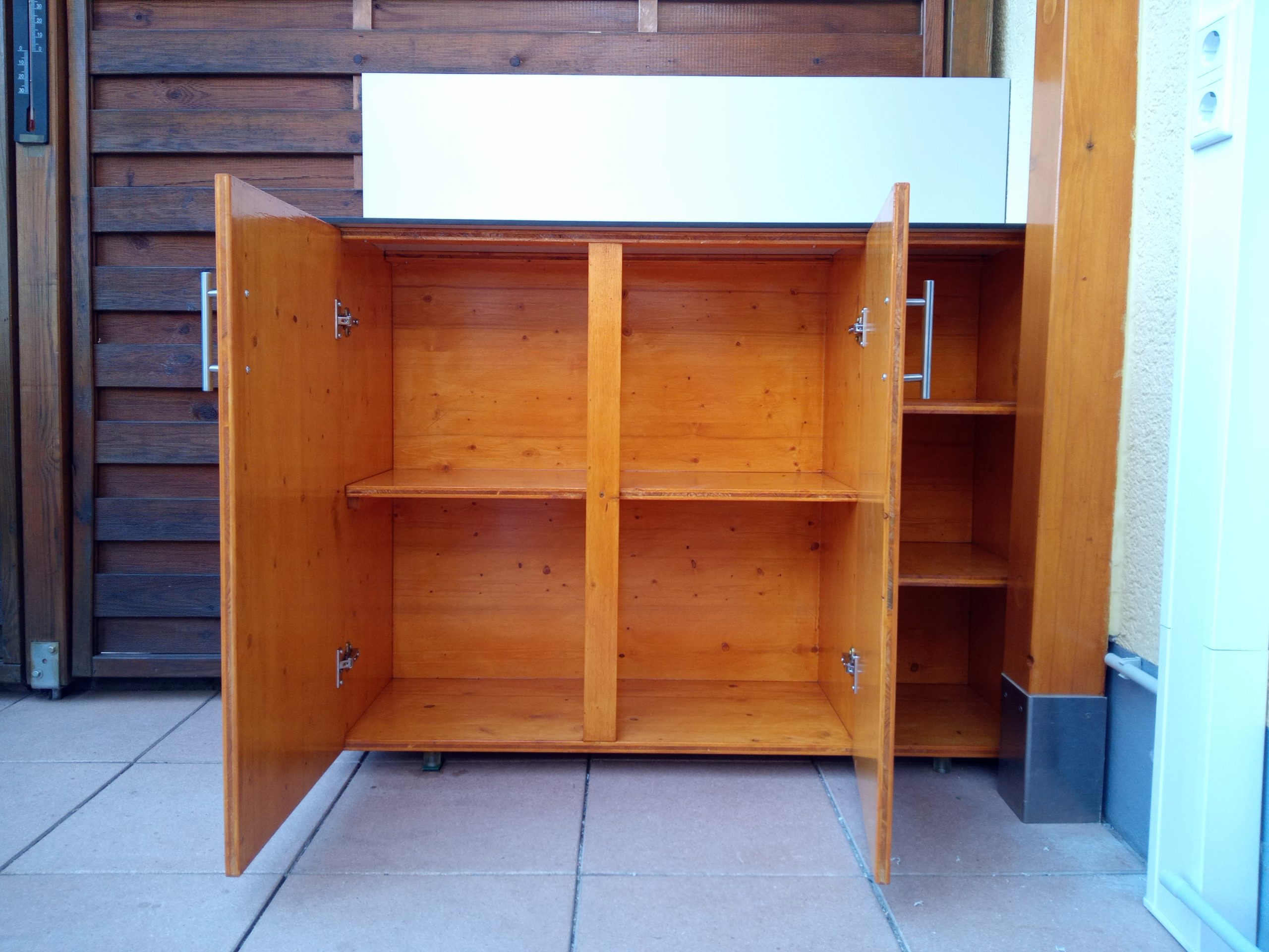Da die Anrichte nicht nur farblich zur Terrassenüberdachung passen sollte, sondern auch unempfindlich gegen Feuchtigkeit sein muss, war eine Eigenkonstruktion aus Dreischichtplatten die einzige Wahl. Als Arbeitsplatte dient eine wasser- und kratzfeste HPL Platte, alle Korpusteile sind sind mehrfach mit Wetterschutzlasur behandelt. Der Korpus wurde mit Flachdübeln und D4-Leim wasserfest verleimt, die Regalböden sind verschraubt.
