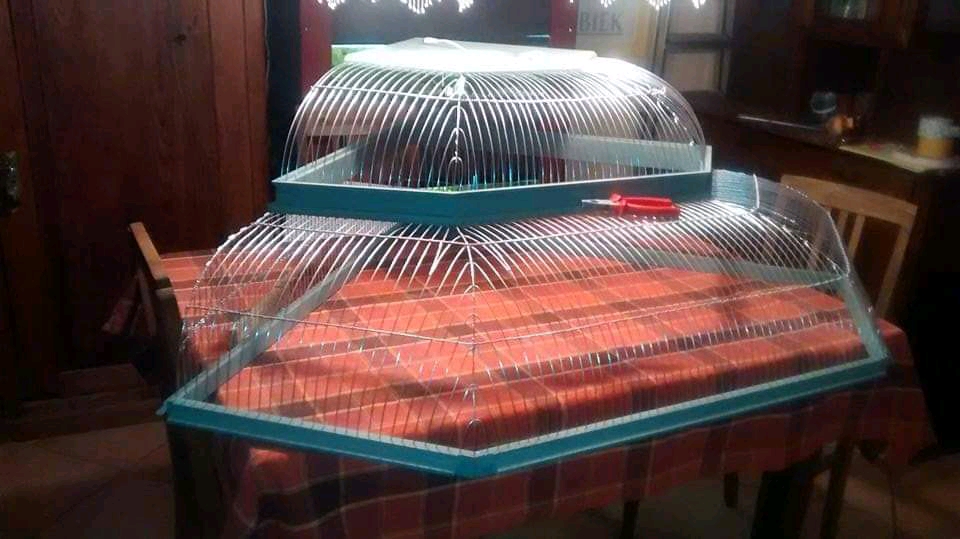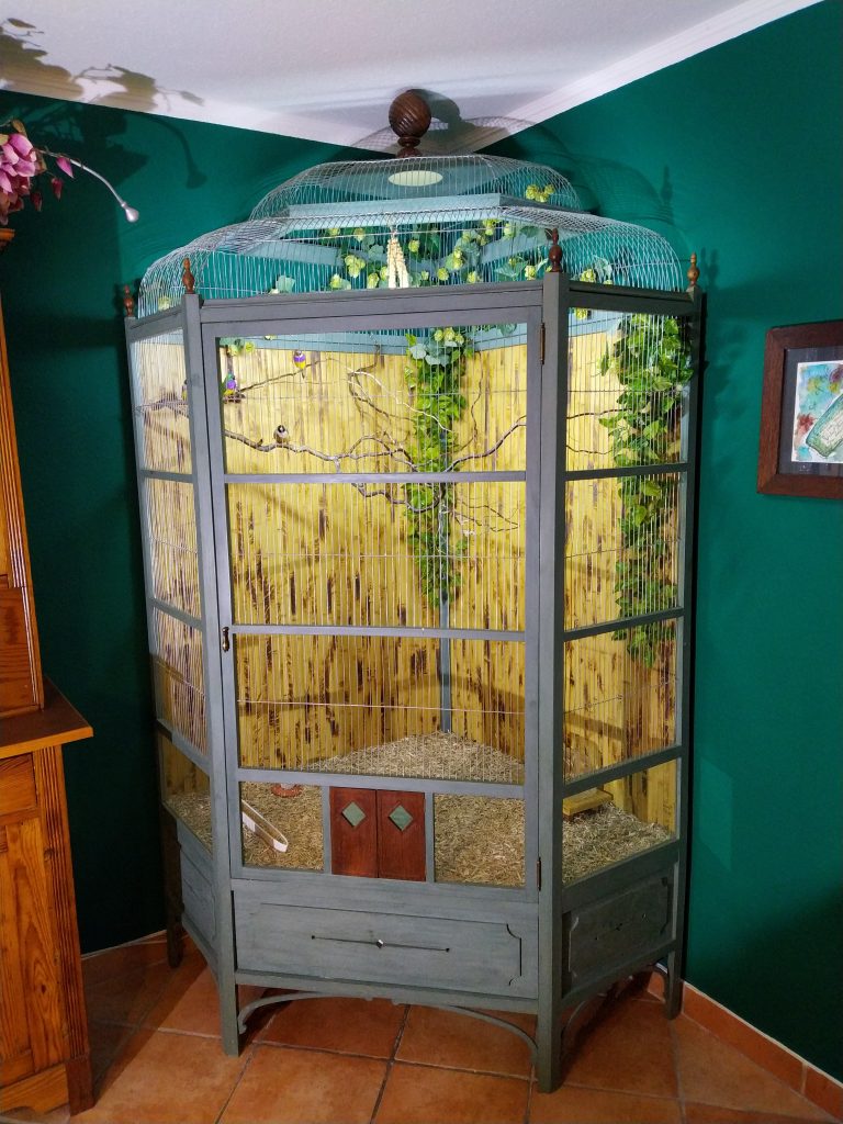 Voliere im viktorianischen Stil. Eigener Entwurf nach historischen Vorbildern. Gebaut aus Kiefernholzleisten, ca. 230 m Weidedrahtzaun, Bambustapete aus gespaltenen Bambus. Alle Drähte von Hand eingezogen und verbunden. Der Boden beherbergt eine Schublade in der Mitte und zwei Anlagefächer in den Seiten. Finish mit Milk Paint und transparentem Klarlack. Sie beherbergt einen kleinen Schwarm Gouldamadinen.