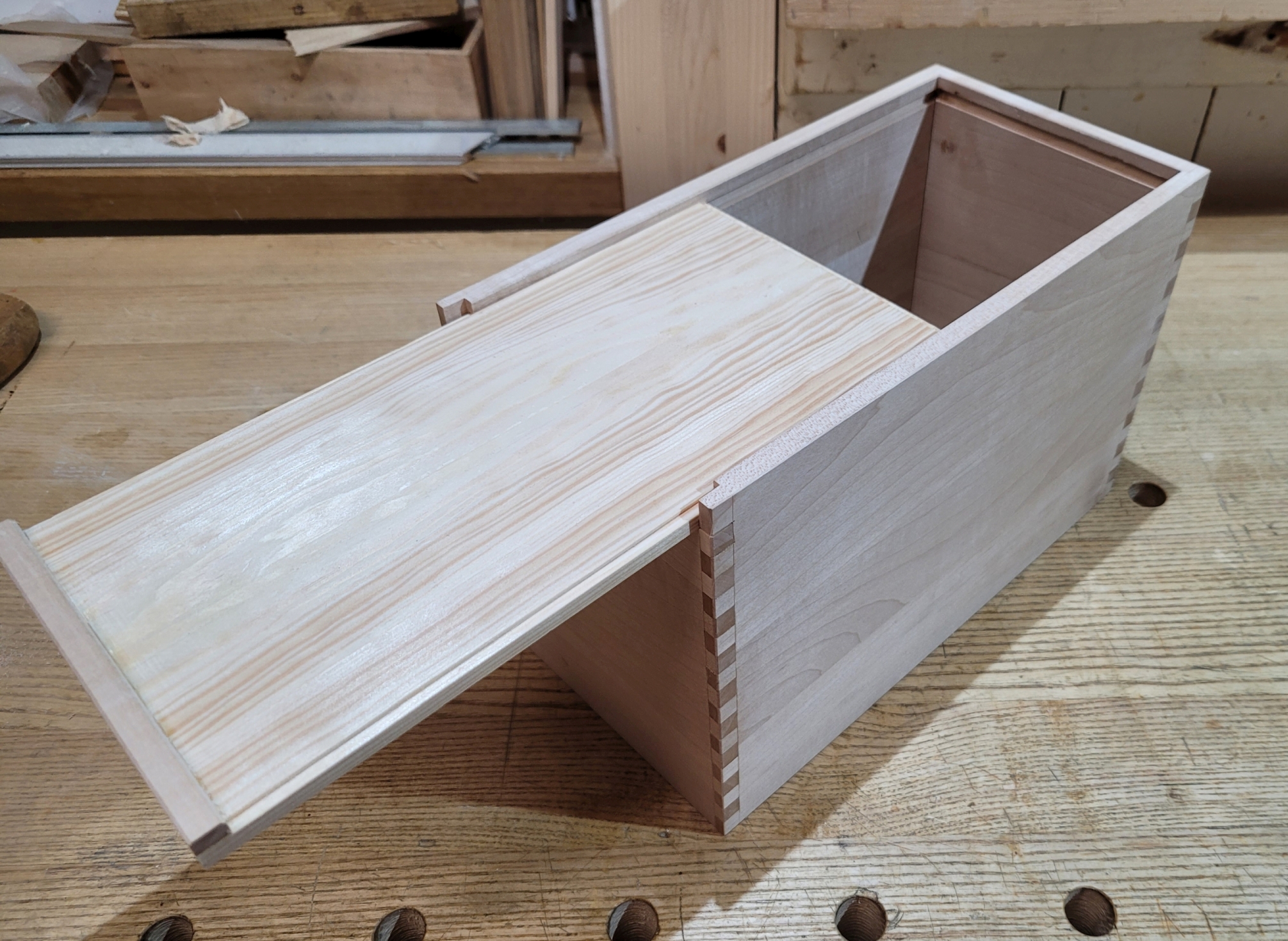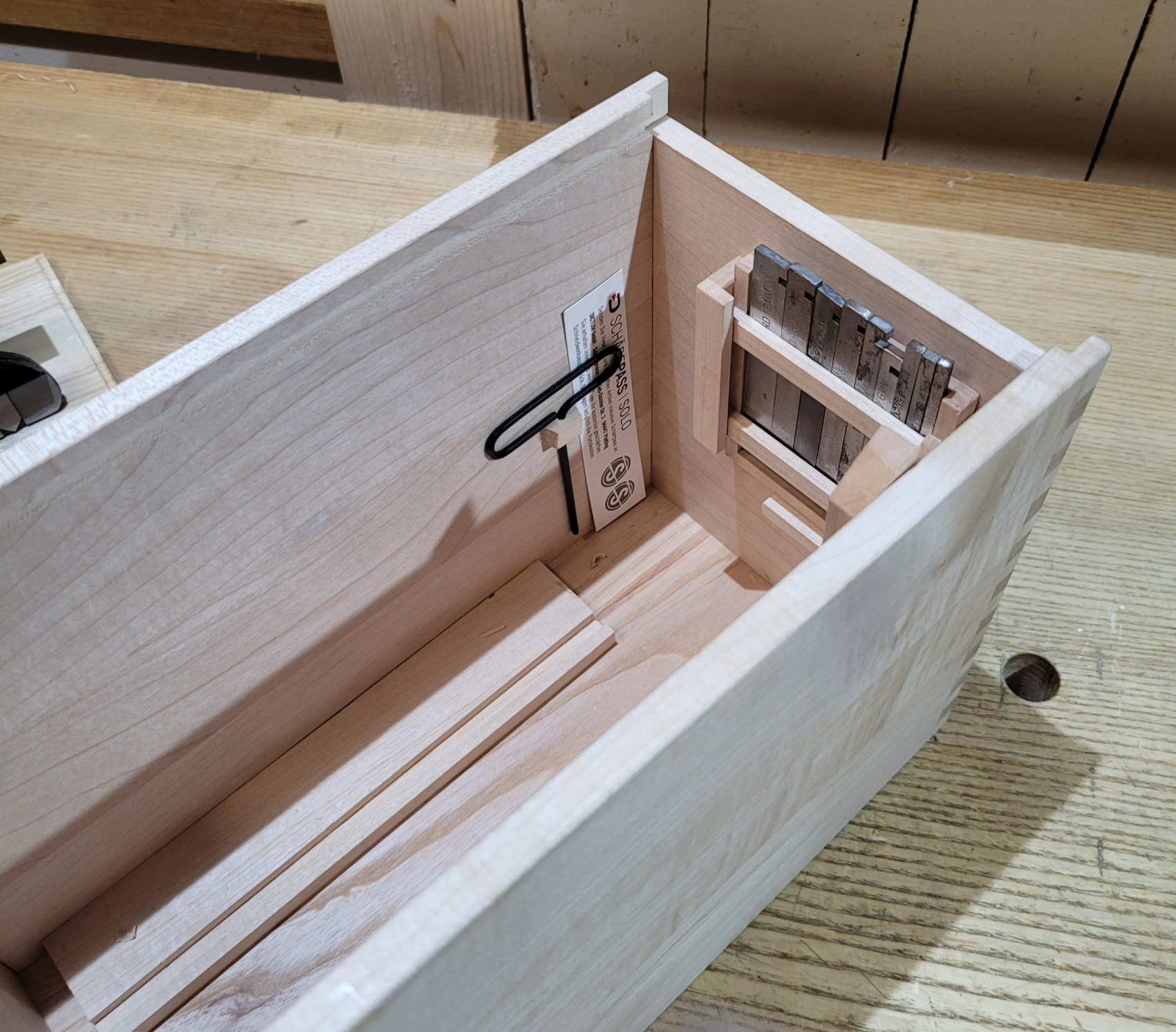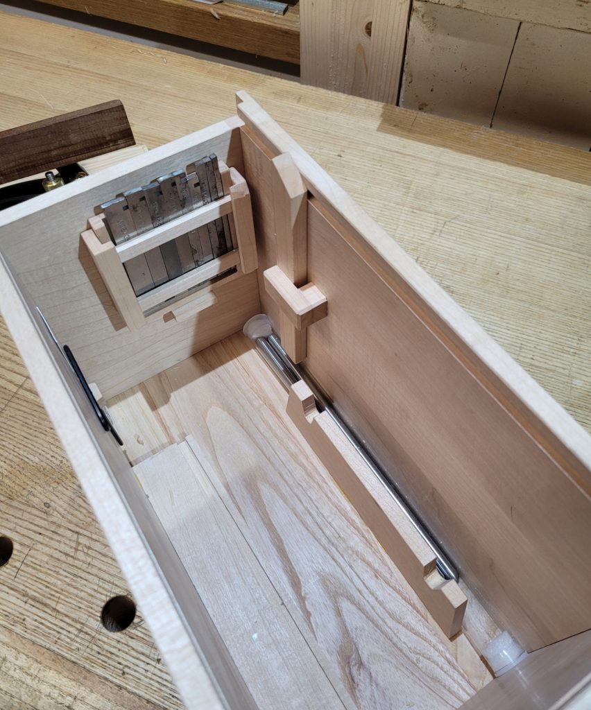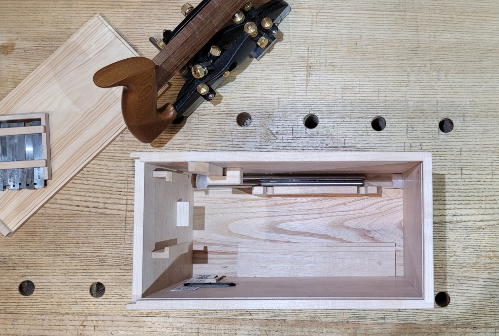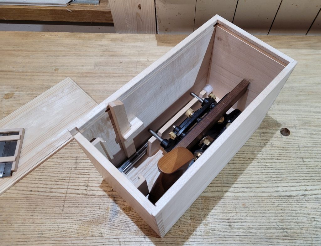 Für meinen neuen Veritas Kombinationshobel fertigte ich diese Aufbewahrungskiste. Der Korpus ist mit Fingerzinken ausgeführt, Boden und Deckel genutet. Für das diverse Zubehör wurden Halterungen eingebaut. Der Deckel kann nur geschlossen werden, wenn ein Hebelmechanismus den Hobel ordnungsgemäß an Ort und Stelle hält.