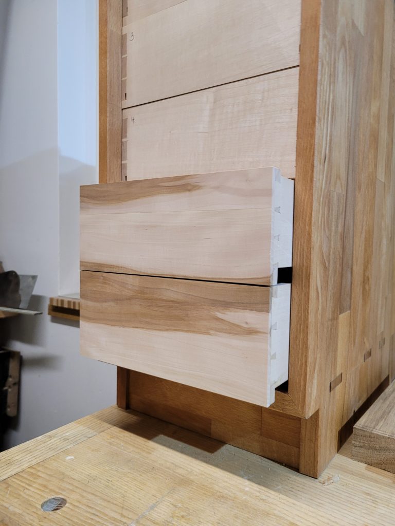 Schubladenschränkchen aus Massivholz – Korpus aus Buche, Schwalbenschwanz- und Schlitz- und Zapfenverbindungen – Schubläden aus Ahorn und Kiefer, klassisch gebaut mit offener Zinkung – Schubladenfronten dickfurniert aus selbstgesägtem Apfelbaum – Griffe aus Walnuss – Rückwand aus Restholz, Bretter mit Falz