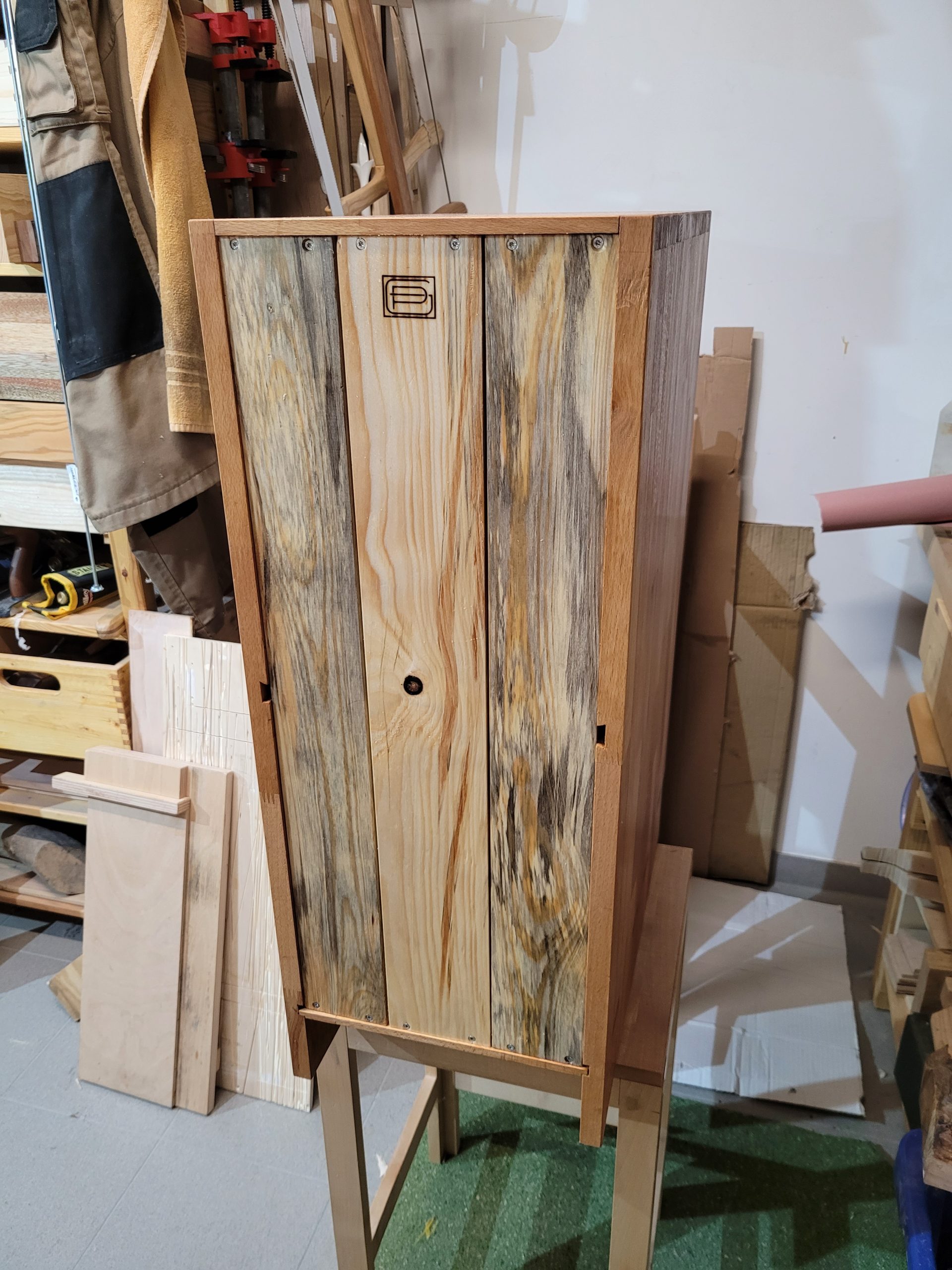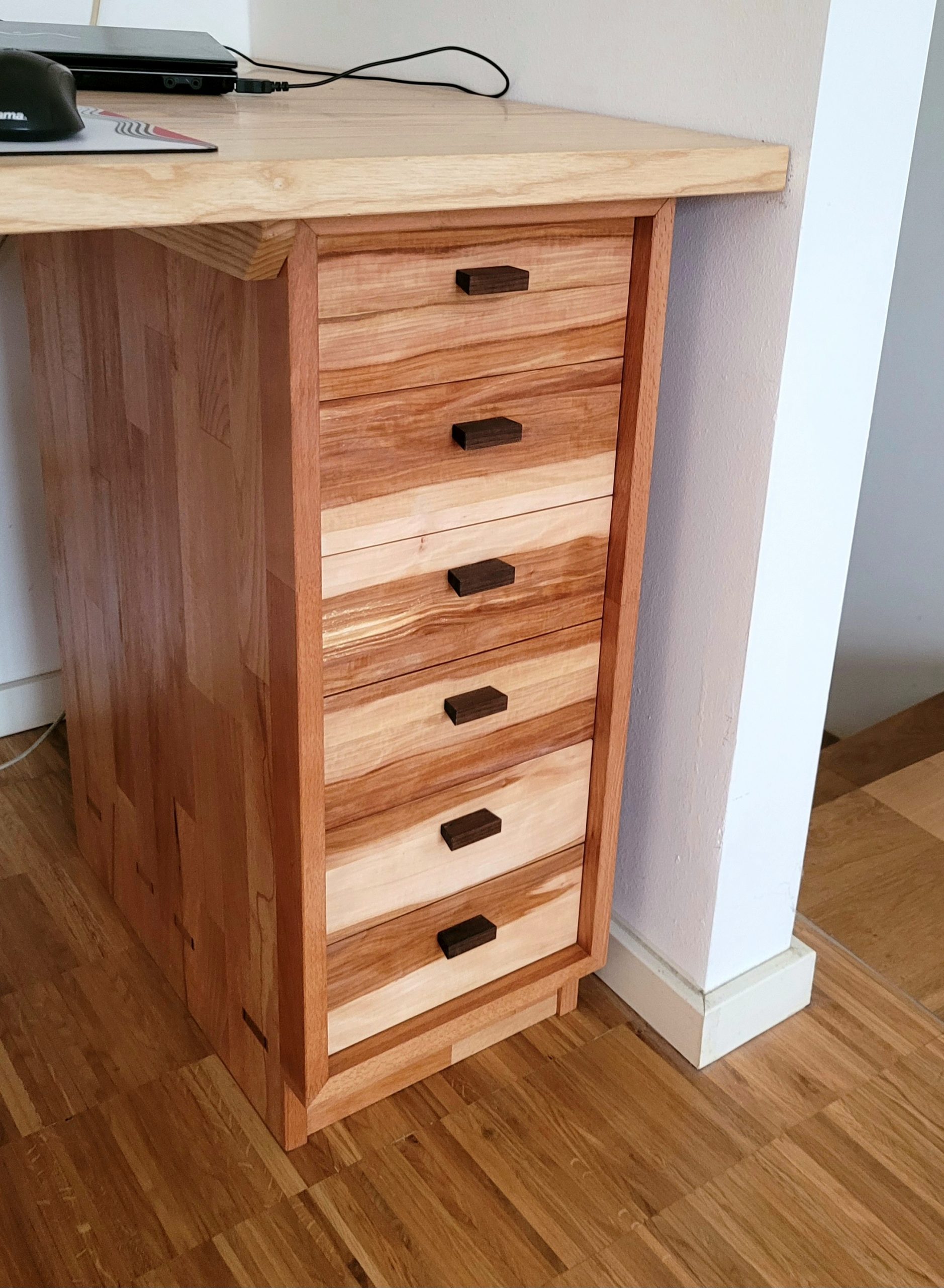 Schubladenschränkchen aus Massivholz – Korpus aus Buche, Schwalbenschwanz- und Schlitz- und Zapfenverbindungen – Schubläden aus Ahorn und Kiefer, klassisch gebaut mit offener Zinkung – Schubladenfronten dickfurniert aus selbstgesägtem Apfelbaum – Griffe aus Walnuss – Rückwand aus Restholz, Bretter mit Falz