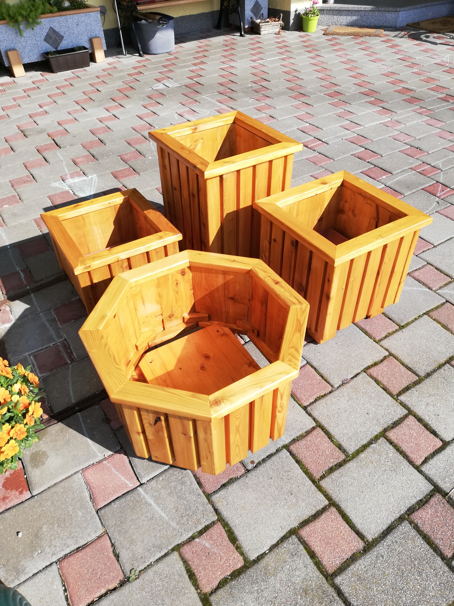 Verschiedene Blumentröge aus Lärchenholz. Gefertigt mit der Pégas Feinschnittsäge. Lackiert mit Xyladecor Langzeitschutz Oregon.