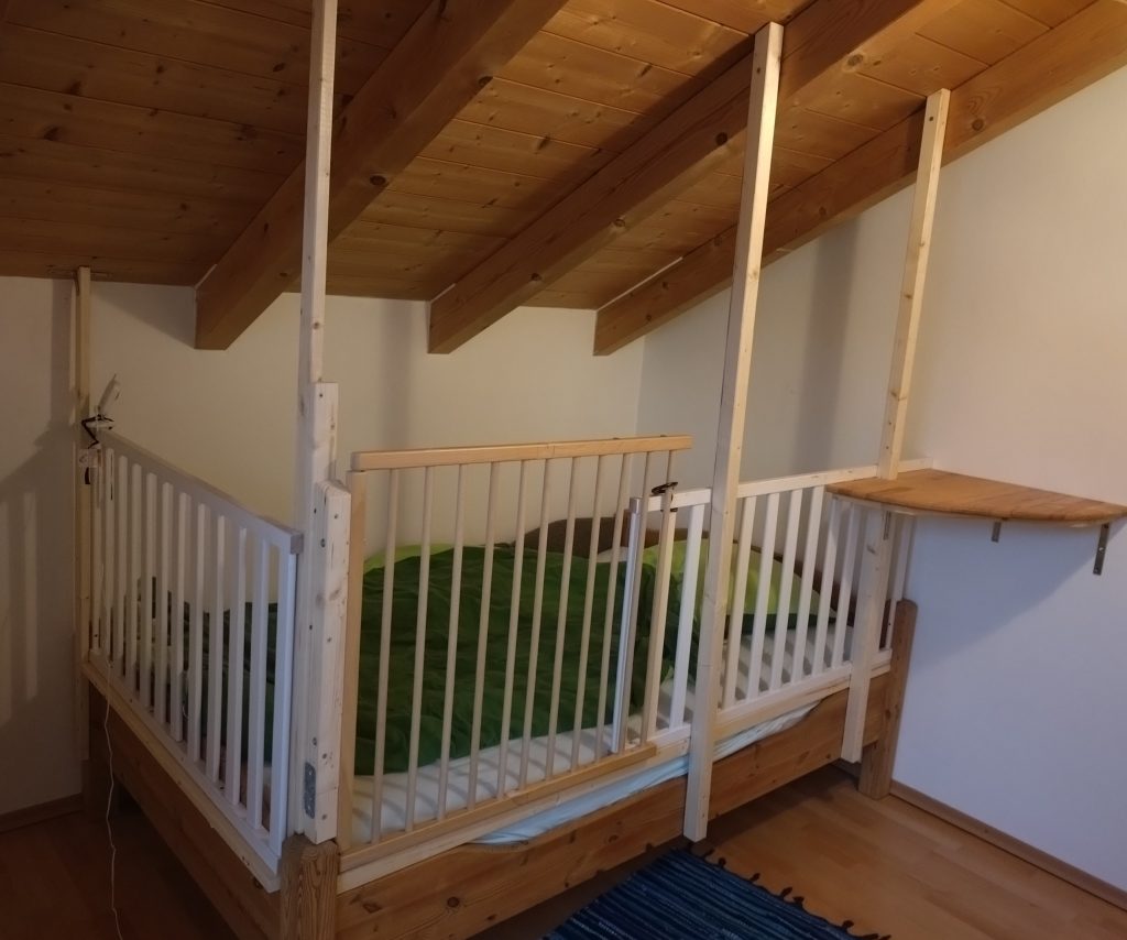 In der Tischplatte die durch Gratleisten gehalten wird sind einige Teile wie z. B. die Holznägel aus Ahorn.