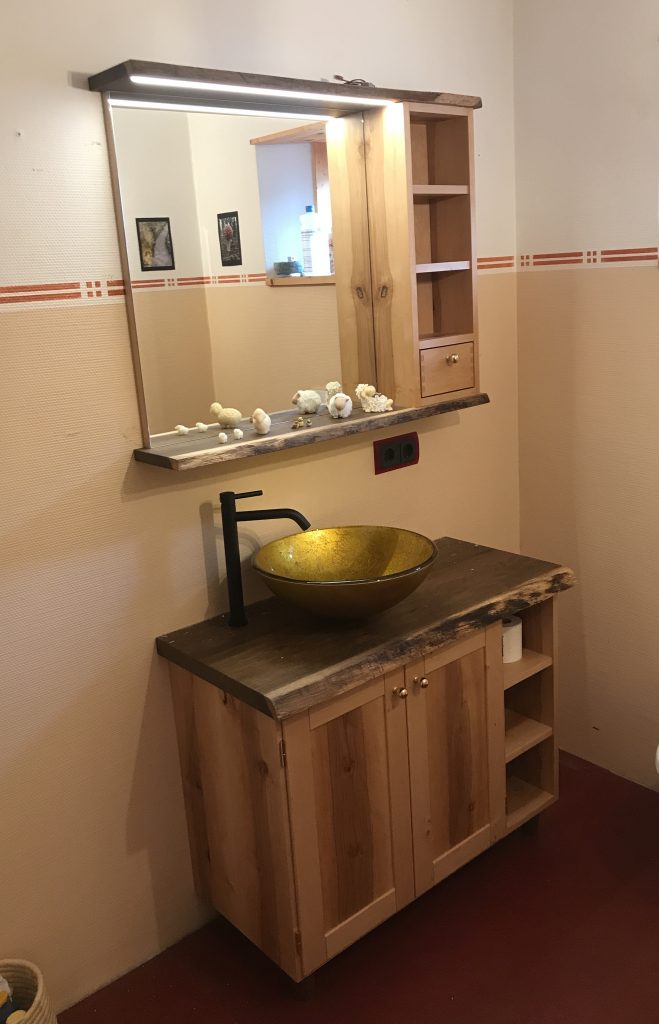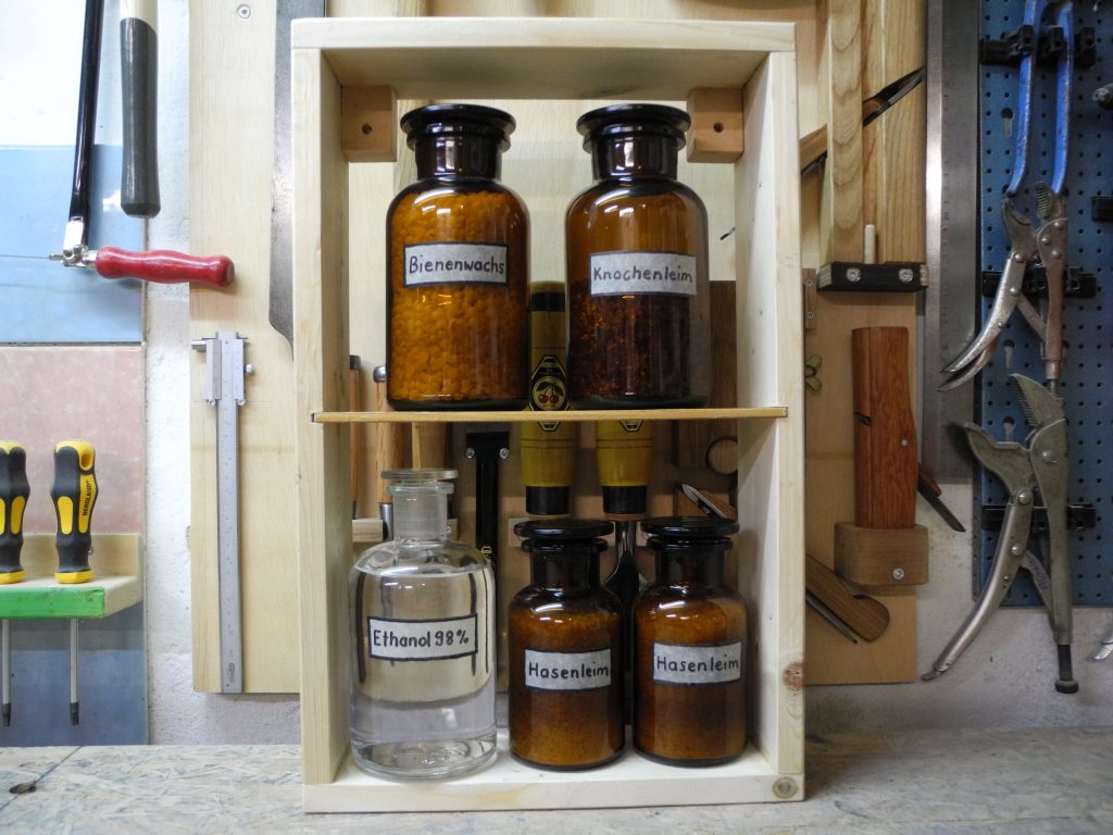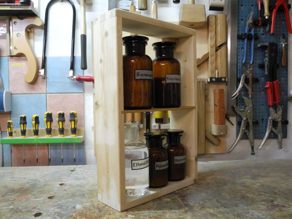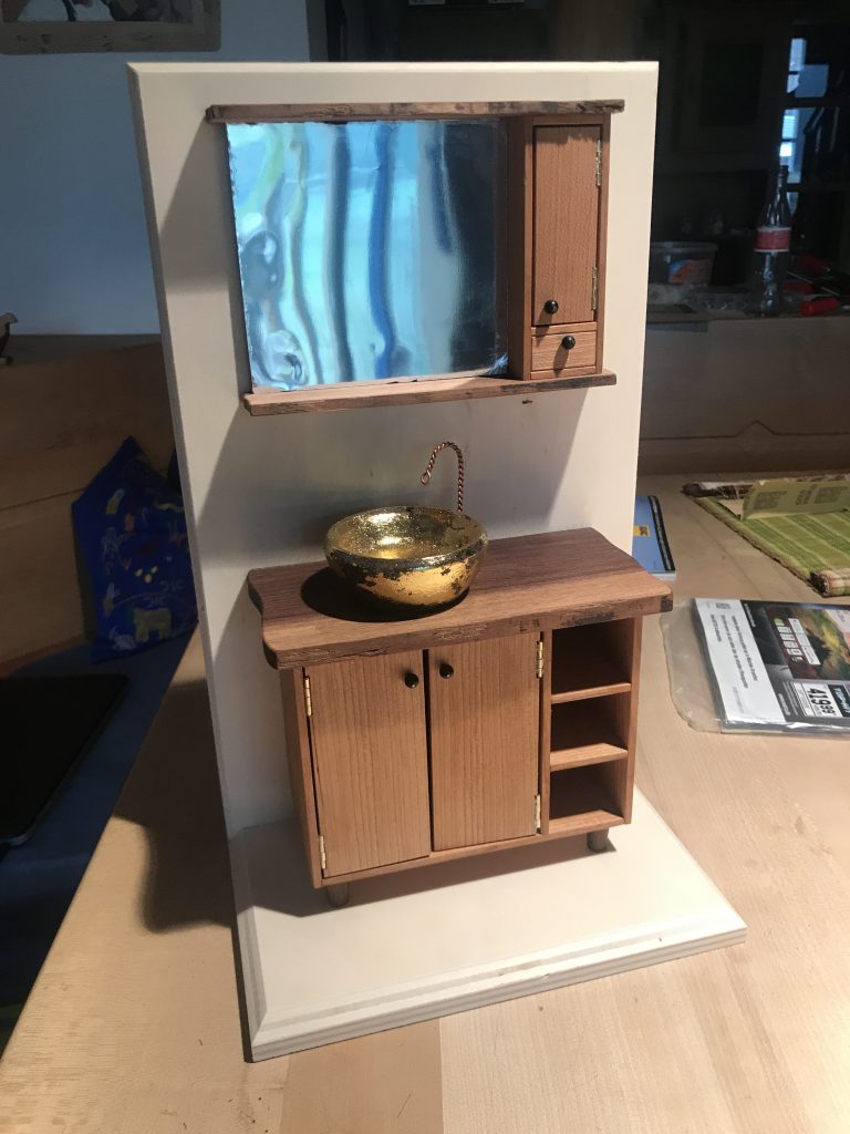 Hier sehen Sie mein damaliges Gesellenstück und das vorher gefertigte Modell. Die Korpen bestehen aus Erlenholz. Die Eichenteile wurden alle geräuchert. Eine kleine Schublade ergänzt die offenen Fächer im Spiegelschrank. Die gefälzten Rahmentüren mit Füllung verdecken die Abwasserleitung und schaffen Platz für Handtücher, Toilettenpapier, etc. Alle Oberflächen wurden geölt.