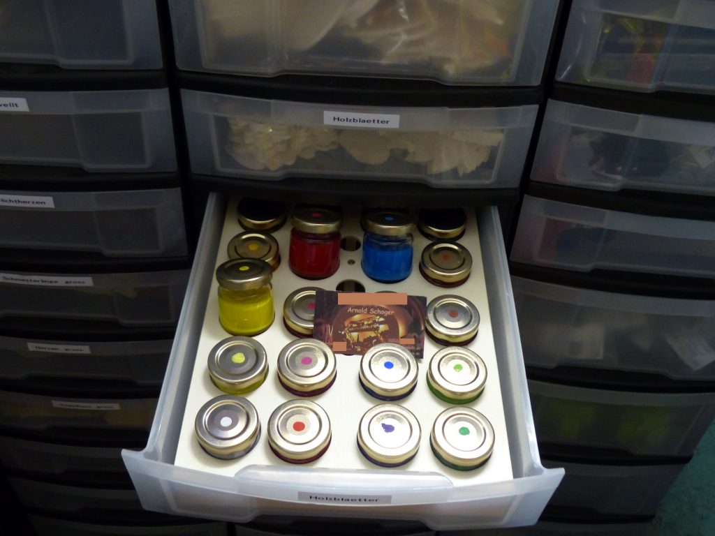 Für meine Schulprojekte fertigte ich diesen Farbkasten zur Aufbewahrung in einer Containerschublade an. Die Löcher bohrte ich mit einer Lochsäge. Passende Löcher kann man auch mit einem Kreisschneider herstellen.