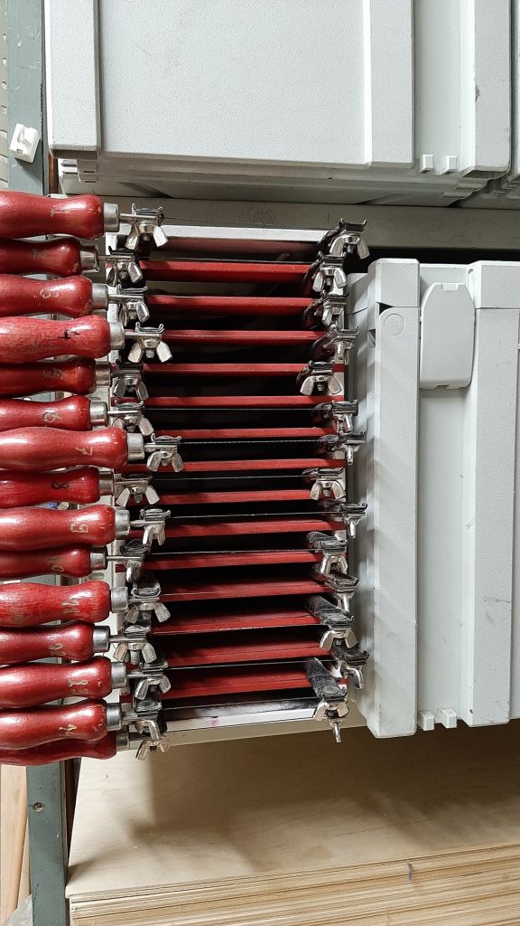 Bretter habe ich auf 30cm und 15cm abgelängt mit Tischkreissäge. Ich habe die einzelnen Teile dann Stabverleimt mit Hilfe von Flachdübeln.