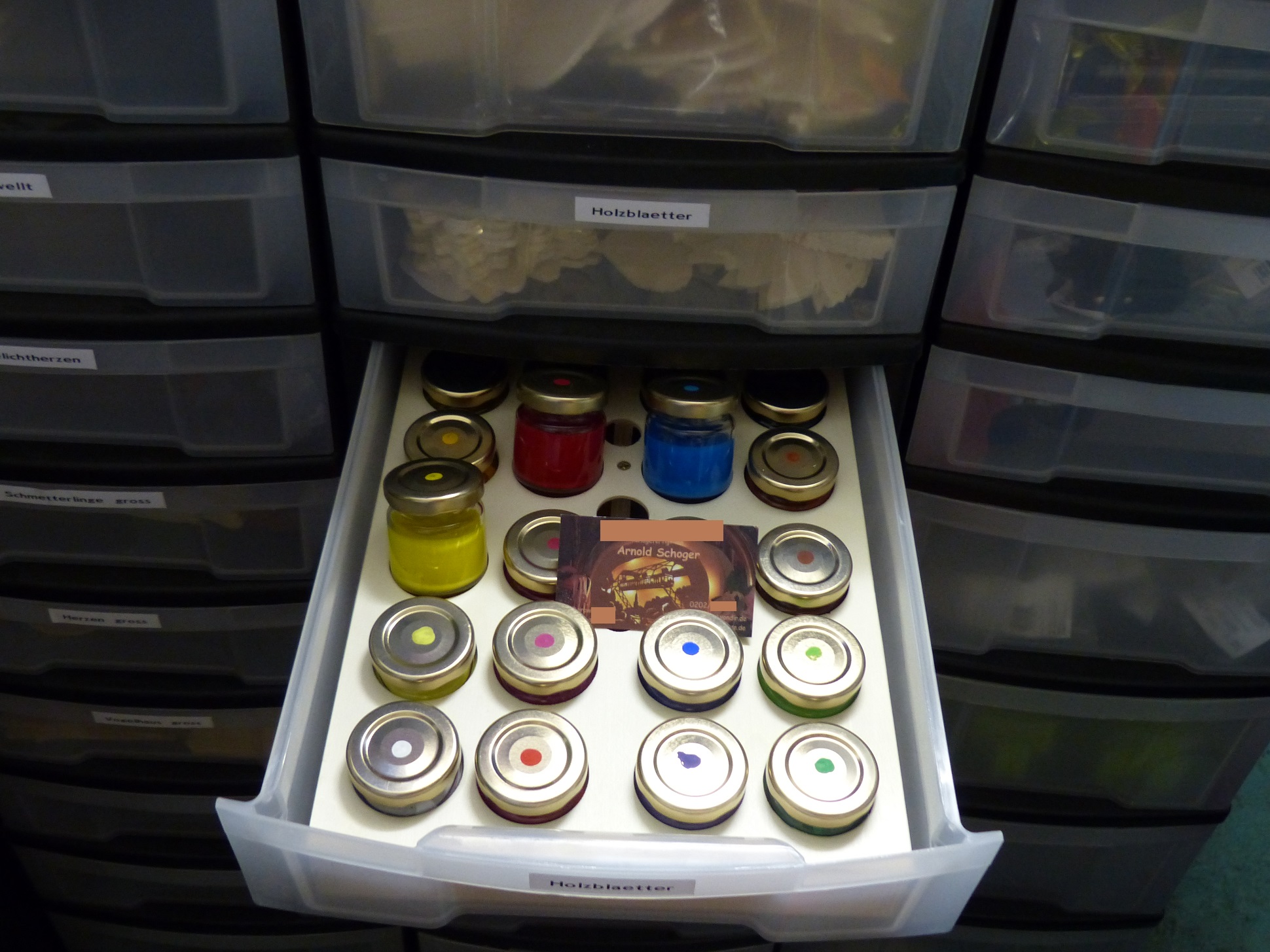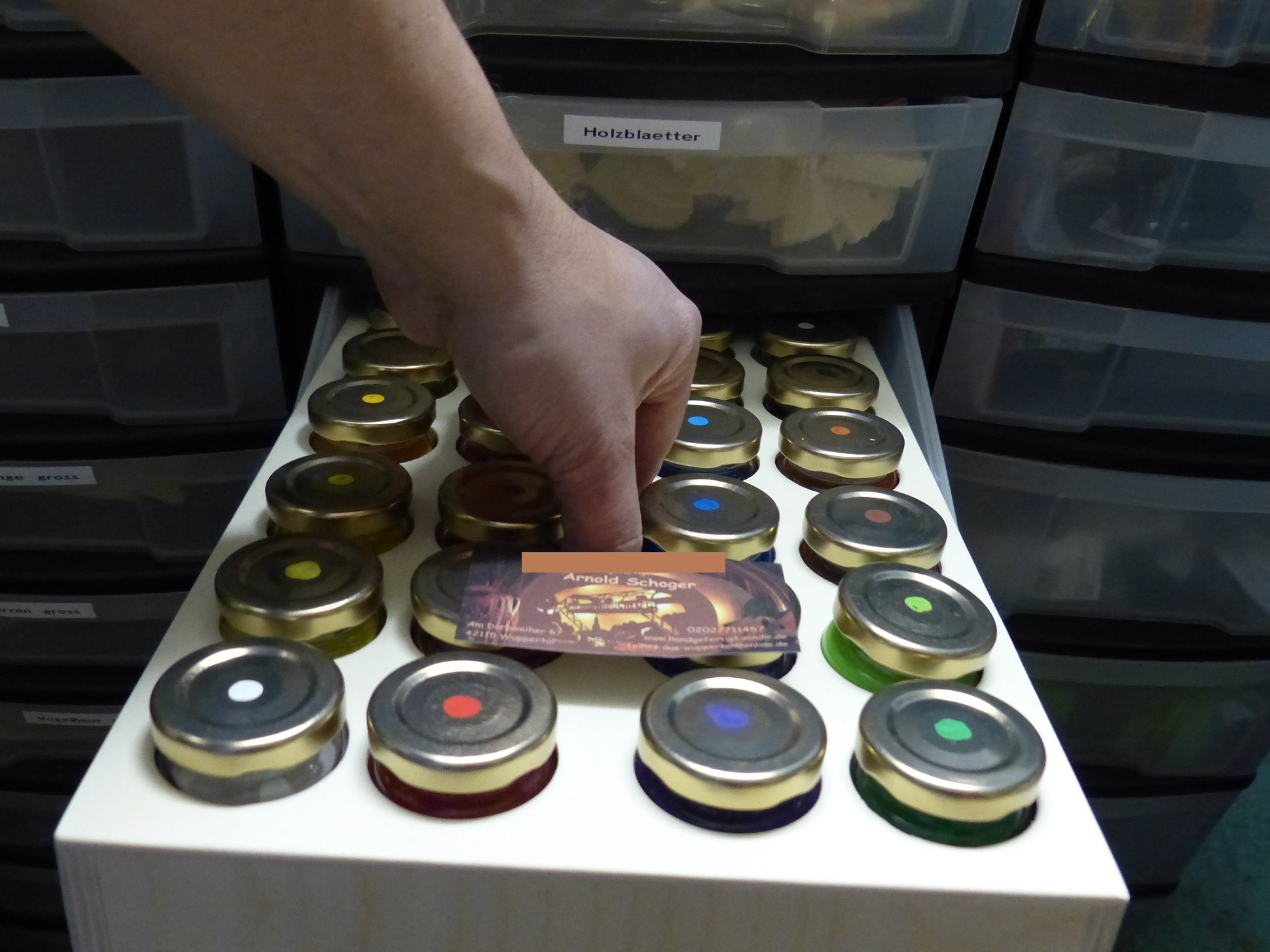 Für meine Schulprojekte fertigte ich diesen Farbkasten zur Aufbewahrung in einer Containerschublade an. Die Löcher bohrte ich mit einer Lochsäge. Passende Löcher kann man auch mit einem Kreisschneider herstellen.