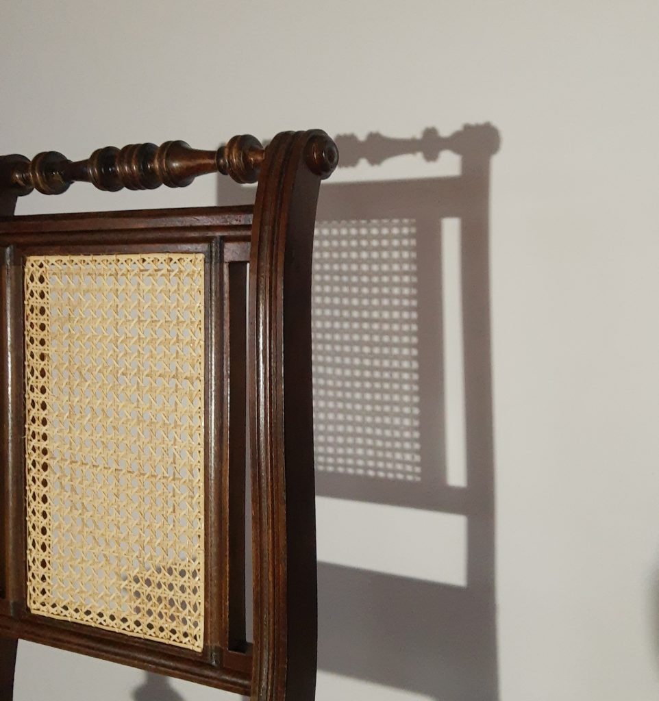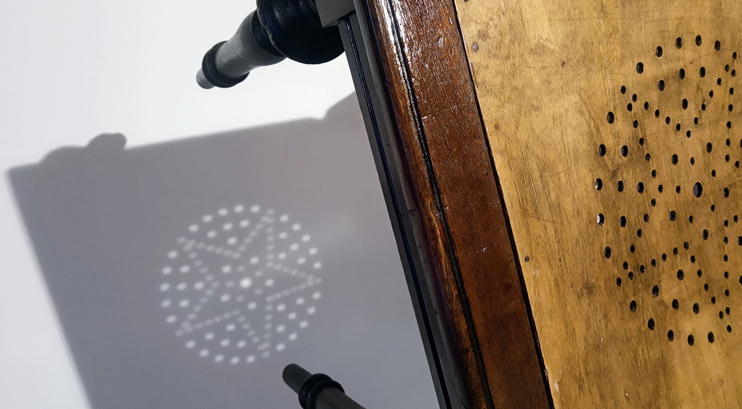 Die Lehne dieses Gründerzeit-Stuhls würde neu geflochten. Leider waren die Bohrungen recht unregelmäßig. Bis zu einem gewissen Grad lässt sich dies beim Flechten ausgleichen, aber nicht komplett. Die geflochtene Sitzfläche wurde vor Jahren durch ein Brett ersetzt. Da diese Bretter typisch sind, habe ich es belassen.