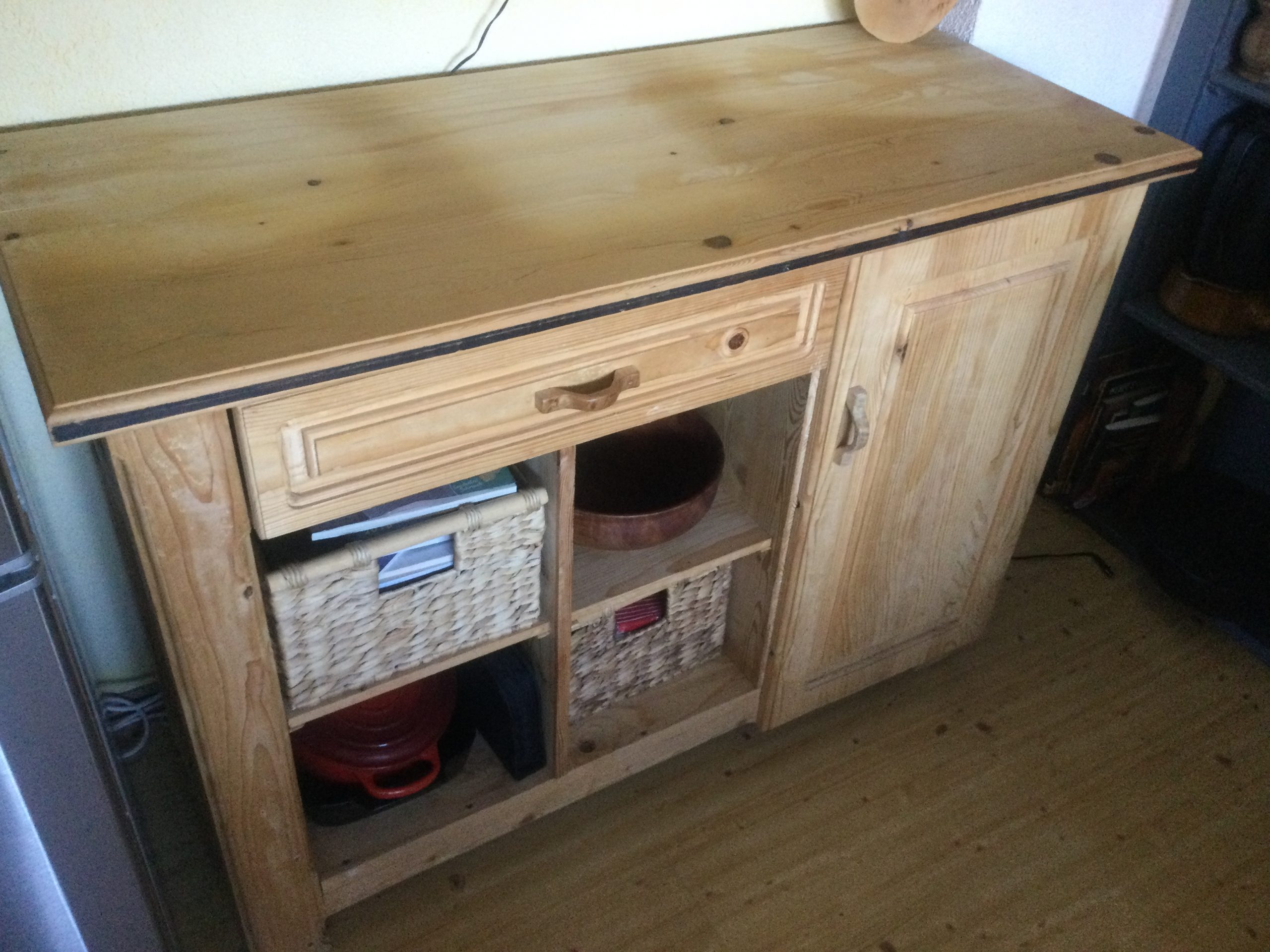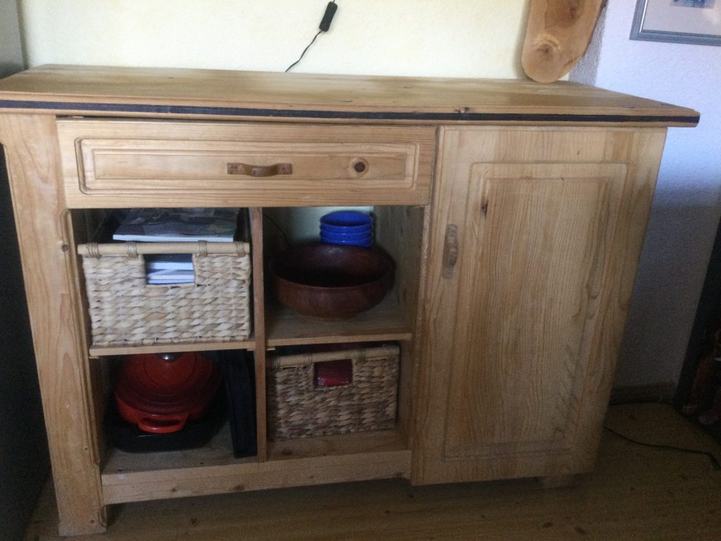 Die Kommode hat die Maße L/H/T 120/85/50 cm. Das Holz ist Fichte und war eigentlich Abfall vom Hausbau.