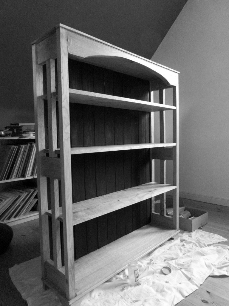 Wenn das eine Regal voll ist, dann muss ein neues her. In diesem Fall aus massiver Eiche und insgesamt 28 Schlitz- und Zapfen-Verbindungen. Während der grobe Zuschnitt diesmal mit maschineller Hilfe erfolgte, sind die Verbindungen reine Handarbeit. Die Rückwand ist aus Fichtenbrettern, die mit Feder und Nut verbunden sind. Für die Oberfläche habe ich blonden Schellack, Kirjeswachs und Original Milk Paint benutzt.