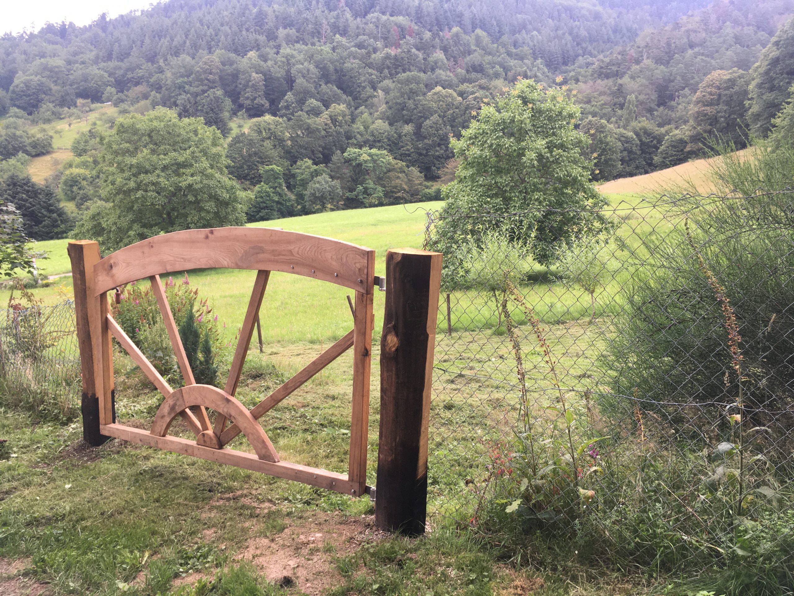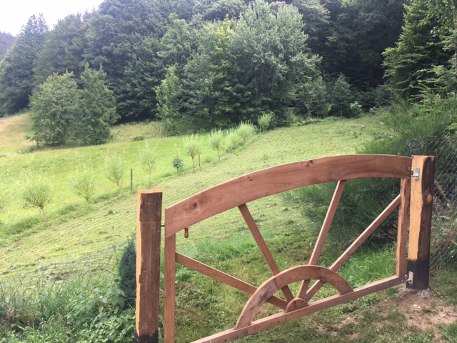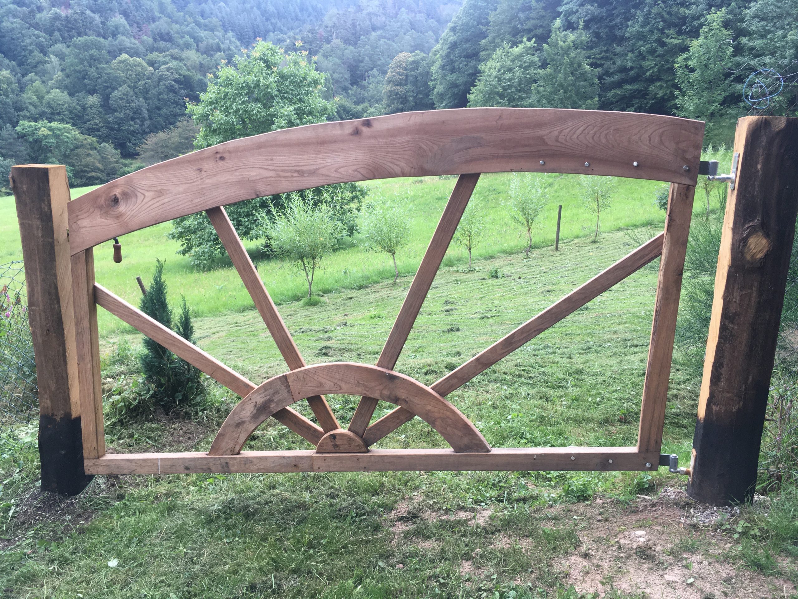Aus Eiche und Eschenholz. Das Tor ist rein verdübelt und kommt ohne Metallteile aus. In Handarbeit gehobelt, mit Japansäge zugeschnitten und mit Streichmaß angezeichnet. Eichenpfosten für bessere Dauerhaftigkeit befeuert. Breite etwa 2,6 m.