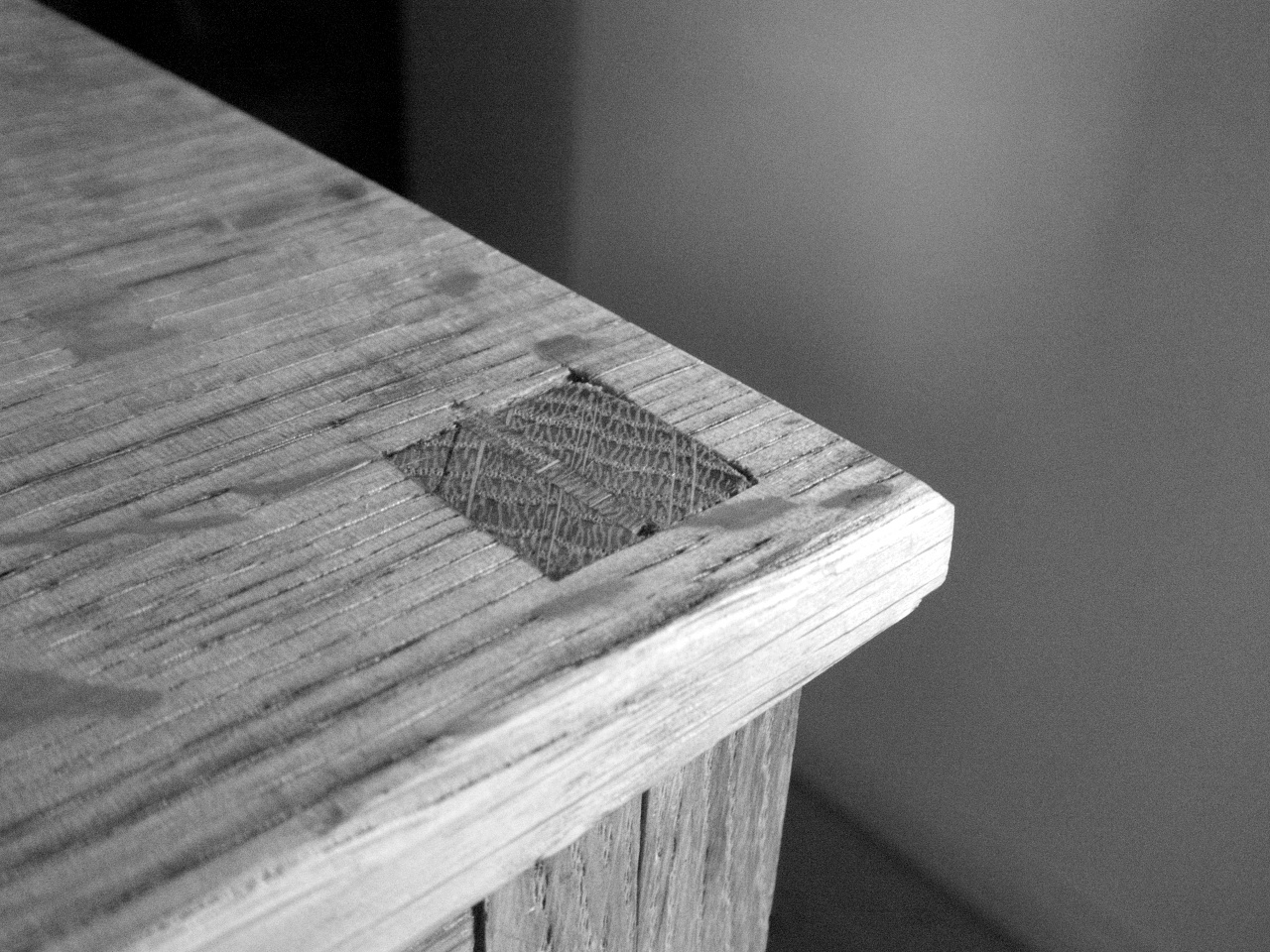Ausbesserung des kaputten Furniers mit dem Einsetzen neuer Furnierstücke; Risse weiß verspachtelt, geschliffen und mit Leinölfirnis veredelt.
