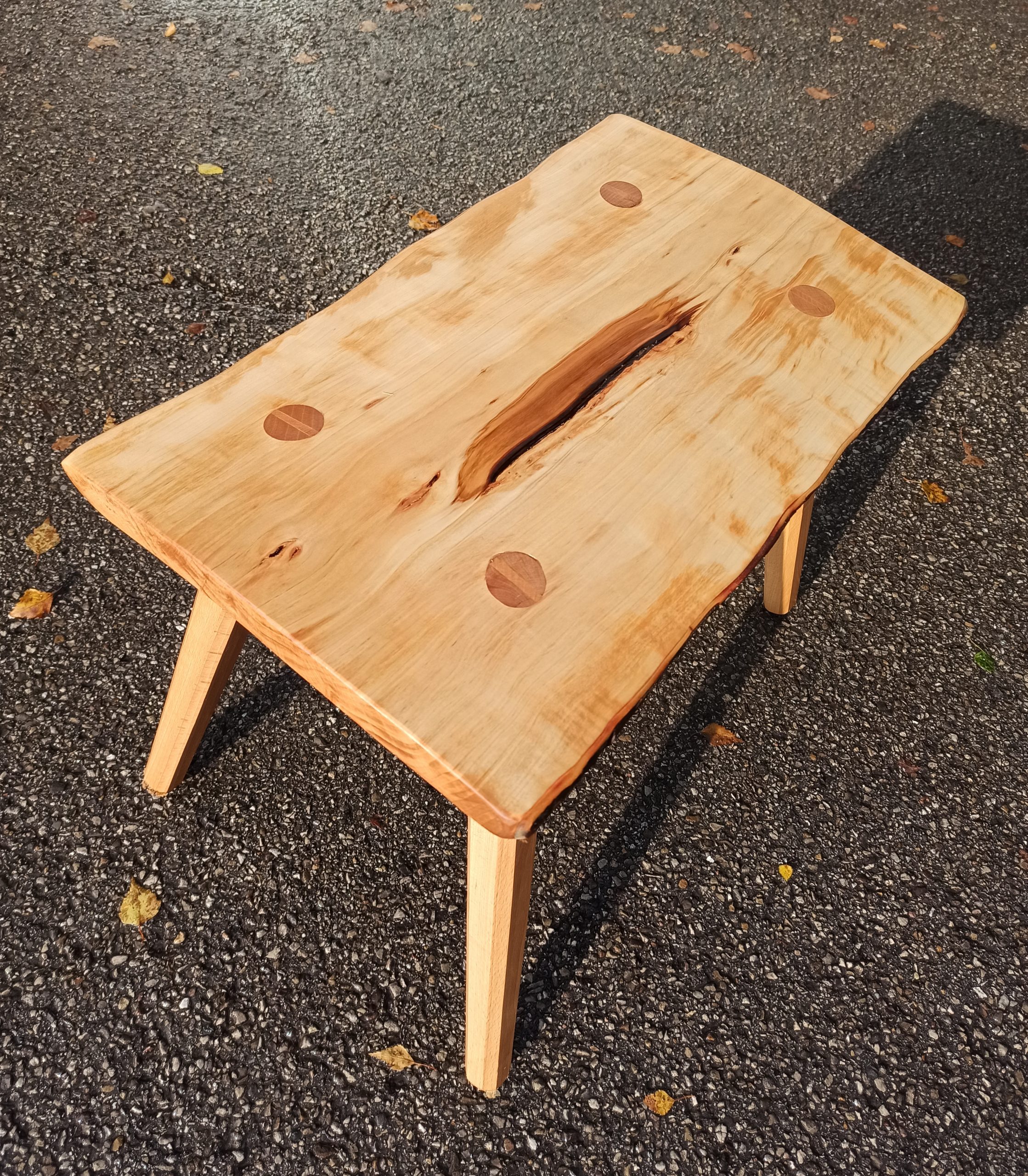 Aus einfachen Leimholzplatten mit Schwalbe und Zinken verbunden und mit Walnuss-Wurzelholz furniert. Löcher mit schwarzem Harz ausgespachtelt. Finish mit Öllack matt. Die Schublade wurde zusammen mit dem Rahmen aufs Furnier geklebt, sodass die Maserung durchgängig ist. Zum Herausschneiden der Schublade hat sich das Veritas Streichmaß hervorragend geeignet.