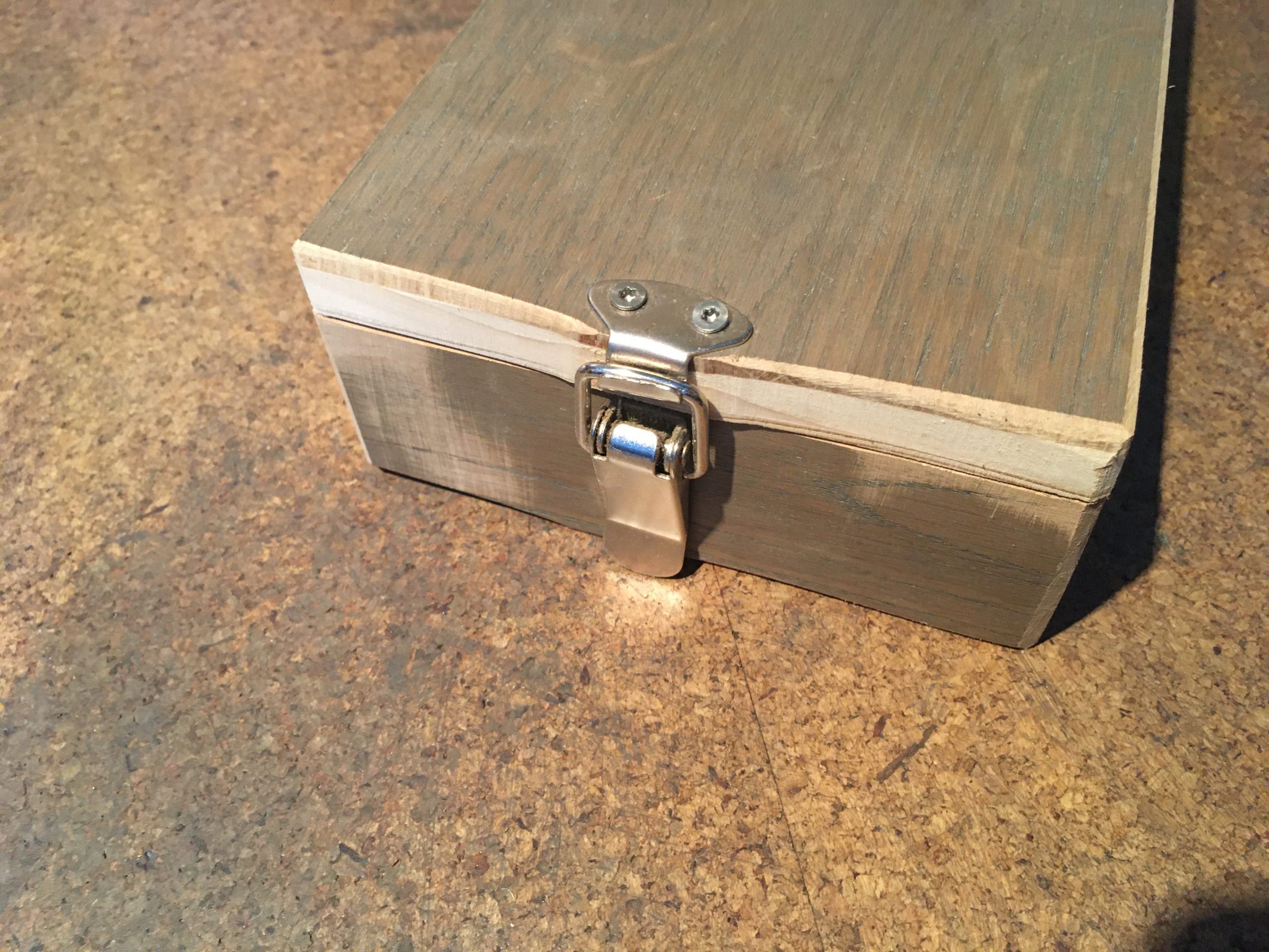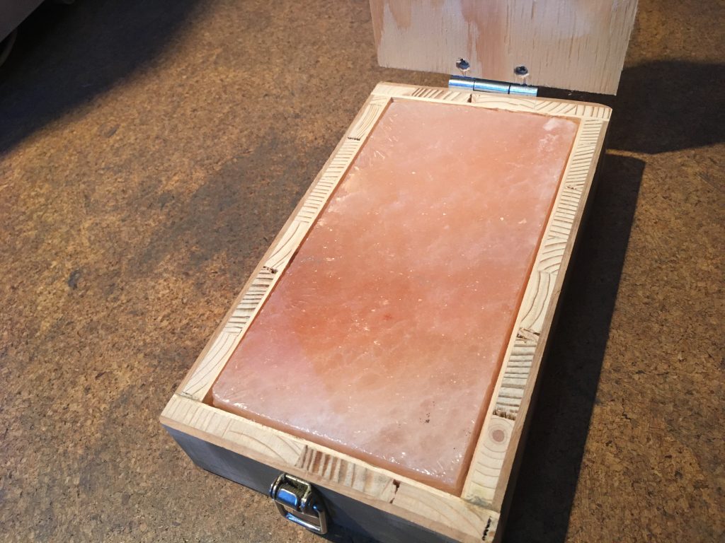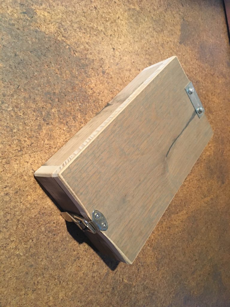 Aus Eichenparkettresten mit Schnalle mit Japansäge zugeschnitten und auf Stoß verleimt. Hier zur Aufbewahrung für einen Grillsalzstein.
