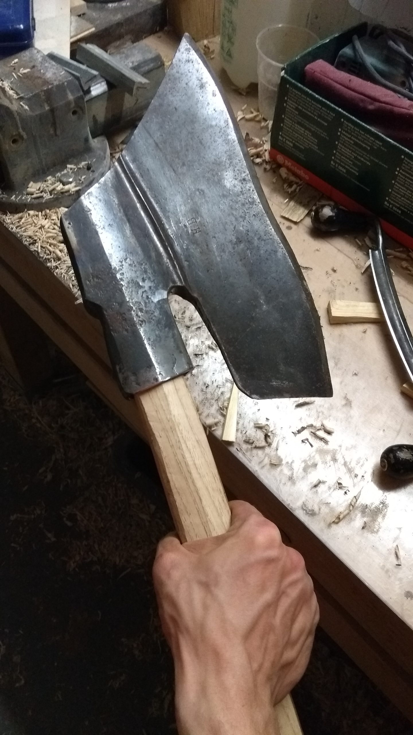 Für ein altes Breitbeil zum Behauen von Balken; aus Eschenholz mit dem Ziehmesser gefertigt.