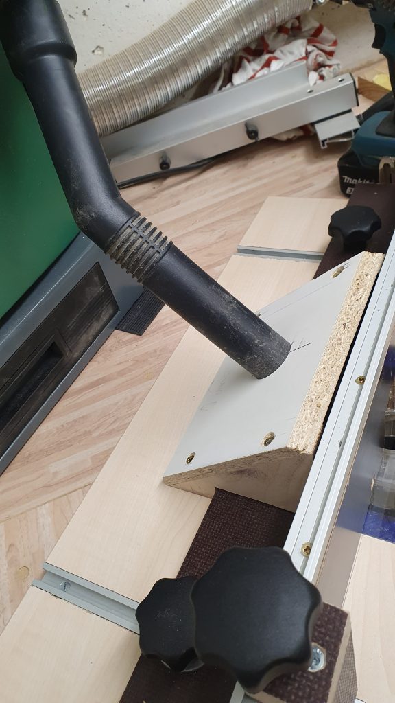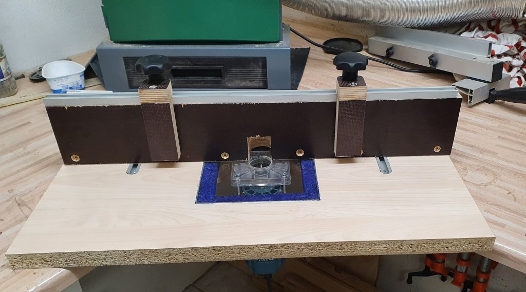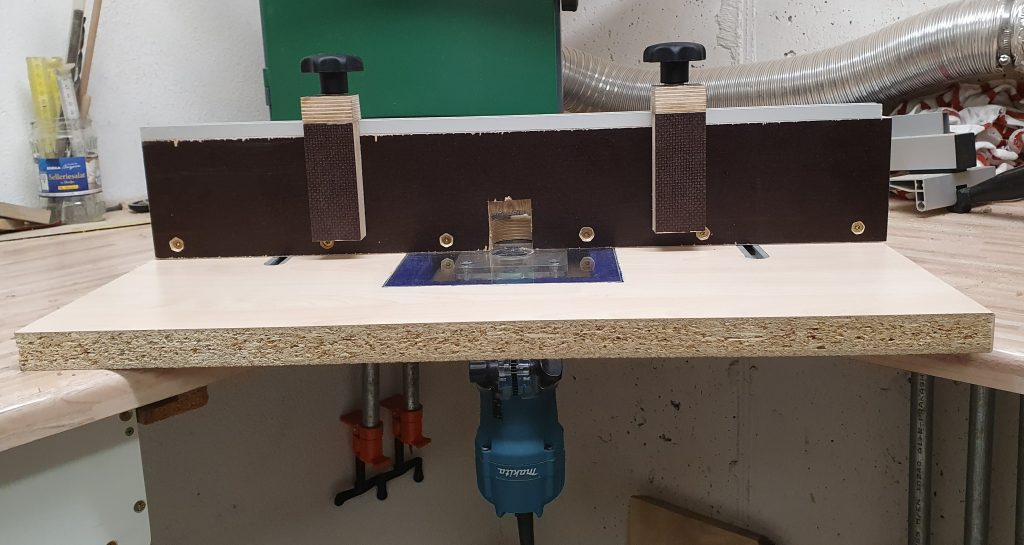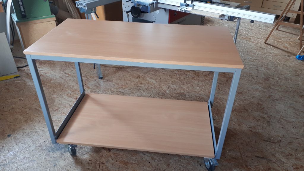 Dieser Tisch wurde aus einem alten Schreibtischgestell gebaut. Das Gestell wurde unten links und rechts mit Winkeleisen verstärkt. Die Tischplatten sind aus 19mm beschichteten Spanplatten. Die Größe ist 120cm x 60cm. Die Höhe wurde so gewählt, daß sie mit der Höhe meiner Kreissäge und meiner Hobelmaschine gleich ist. Zusätzlich sind Räder montiert, um in der Werkstatt mobil zu sein.