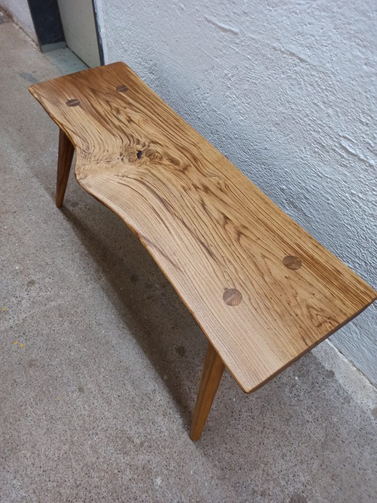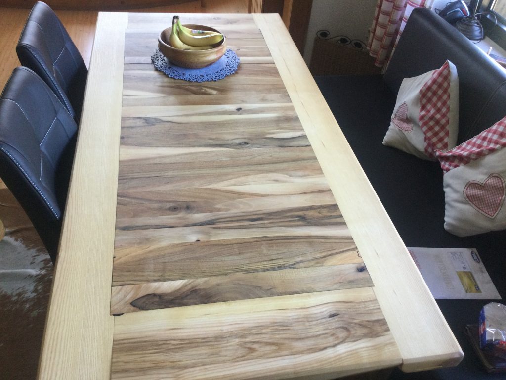 Der Esstisch ist aus Walnuss und Esche. Die Bäume sind aus der Nachbarschaft und von mir zugeschnitten worden. Die Oberfläche wurde mit Leinöl von DICTUM behandelt.