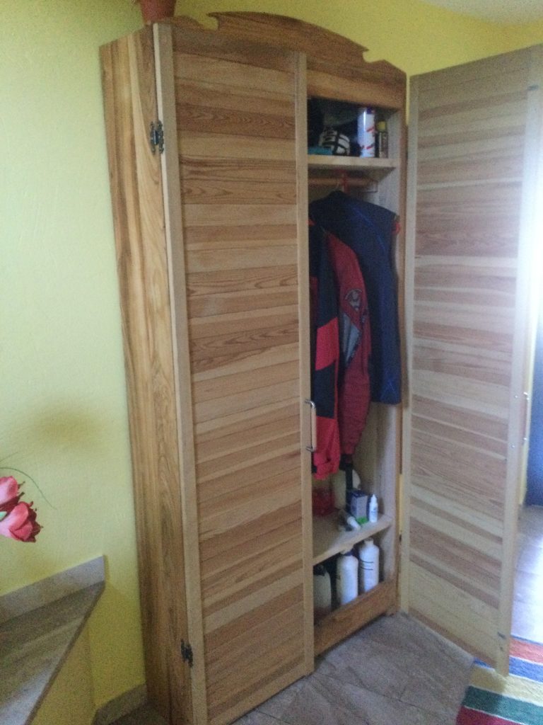 Die Seiten sind aus Kirsche und vom Baum zum Brett alles selbst hergestellt. Es wurden immer 3 Bretter verleimt die Lamellentüren wurden gekauft. Maße: h = 2m, t = 30 cm, b = 1 m.
