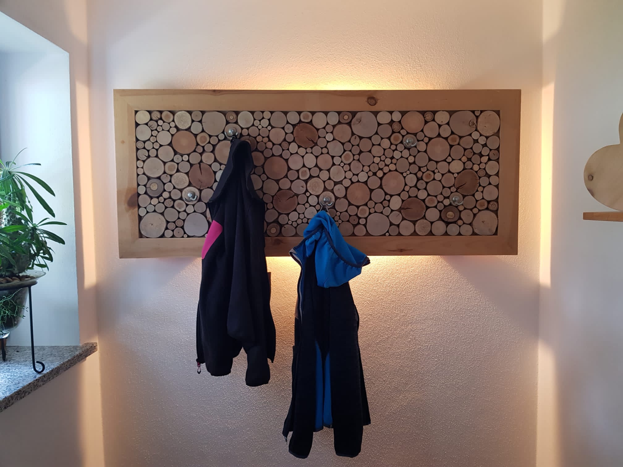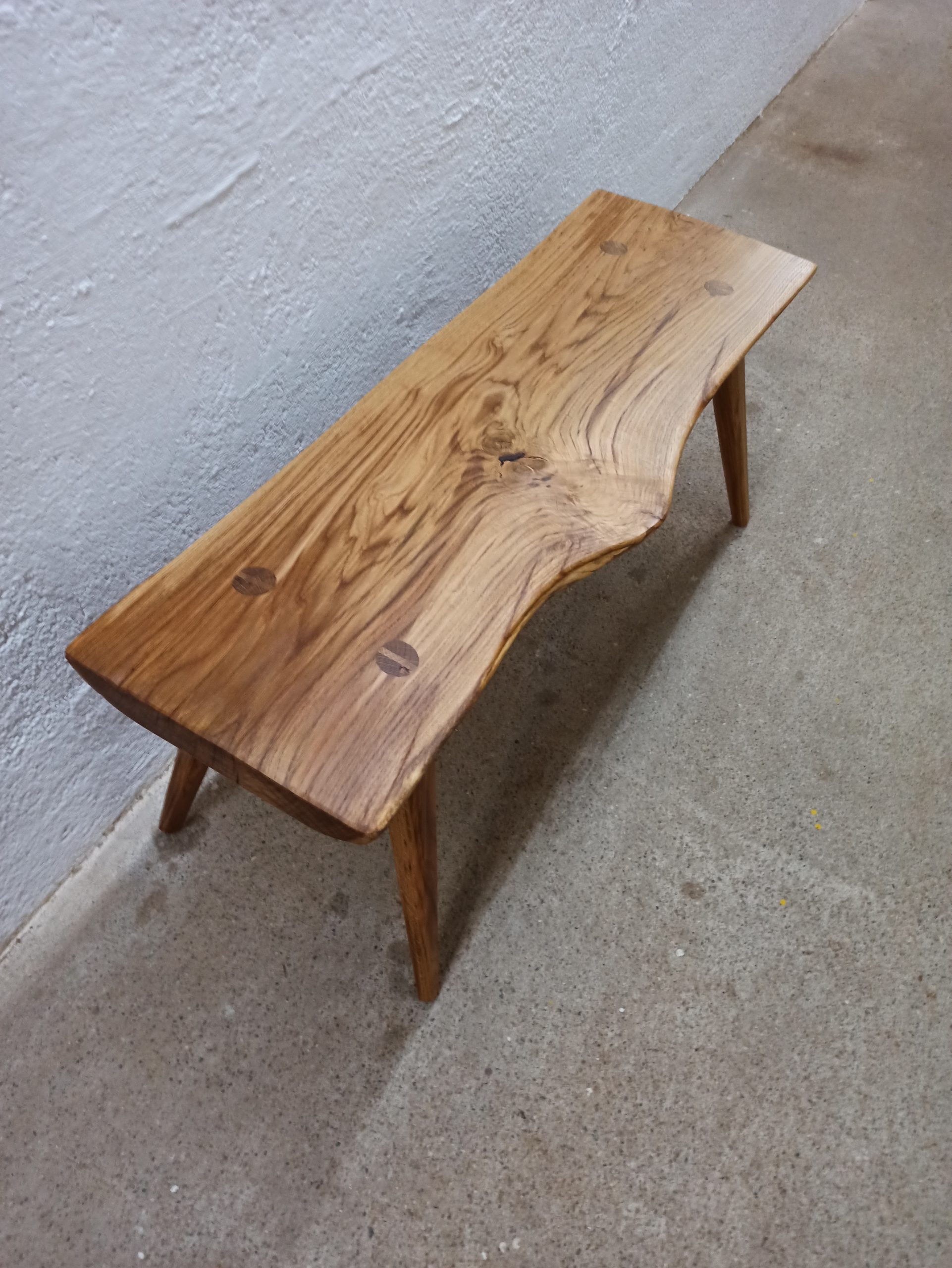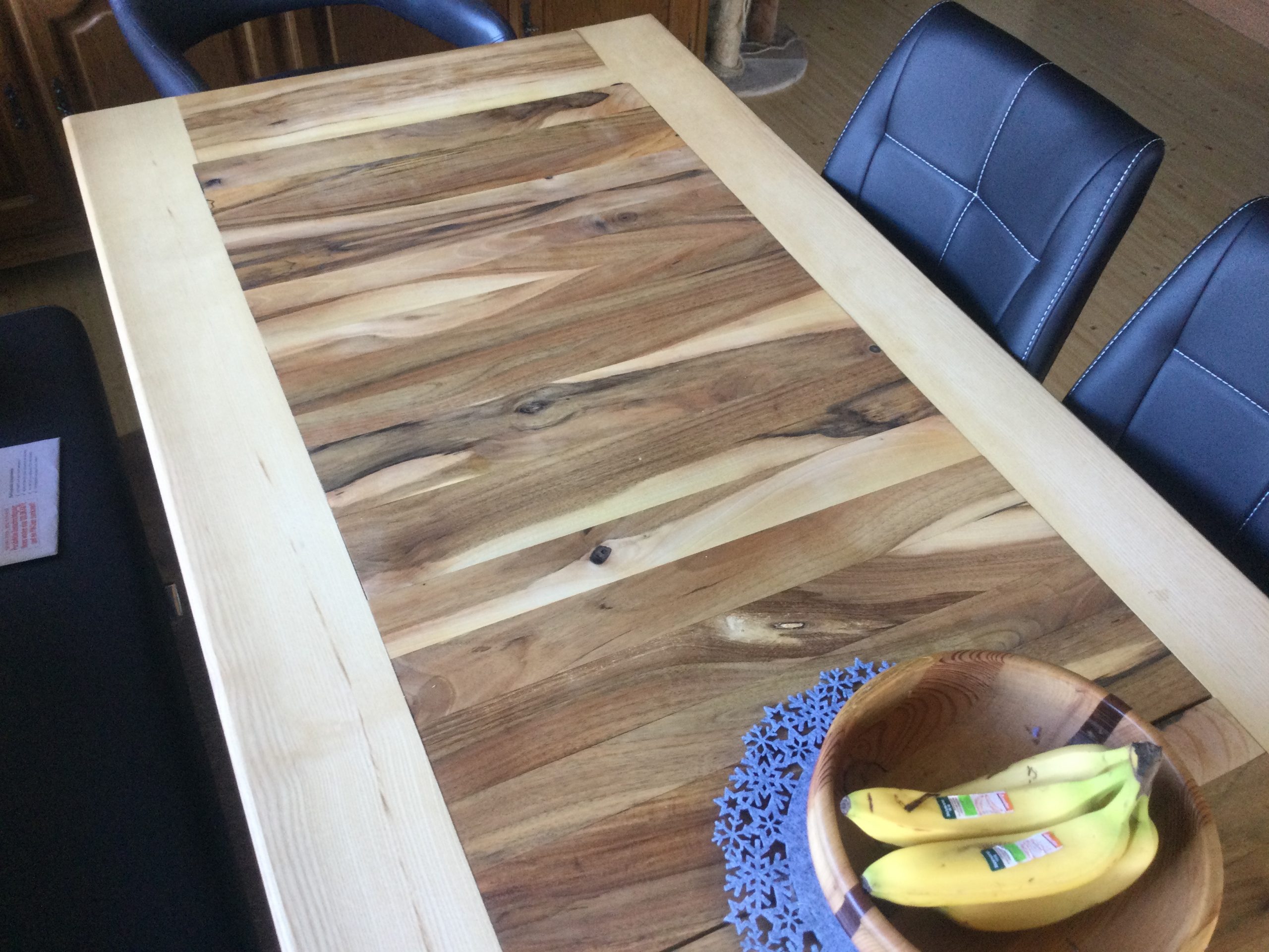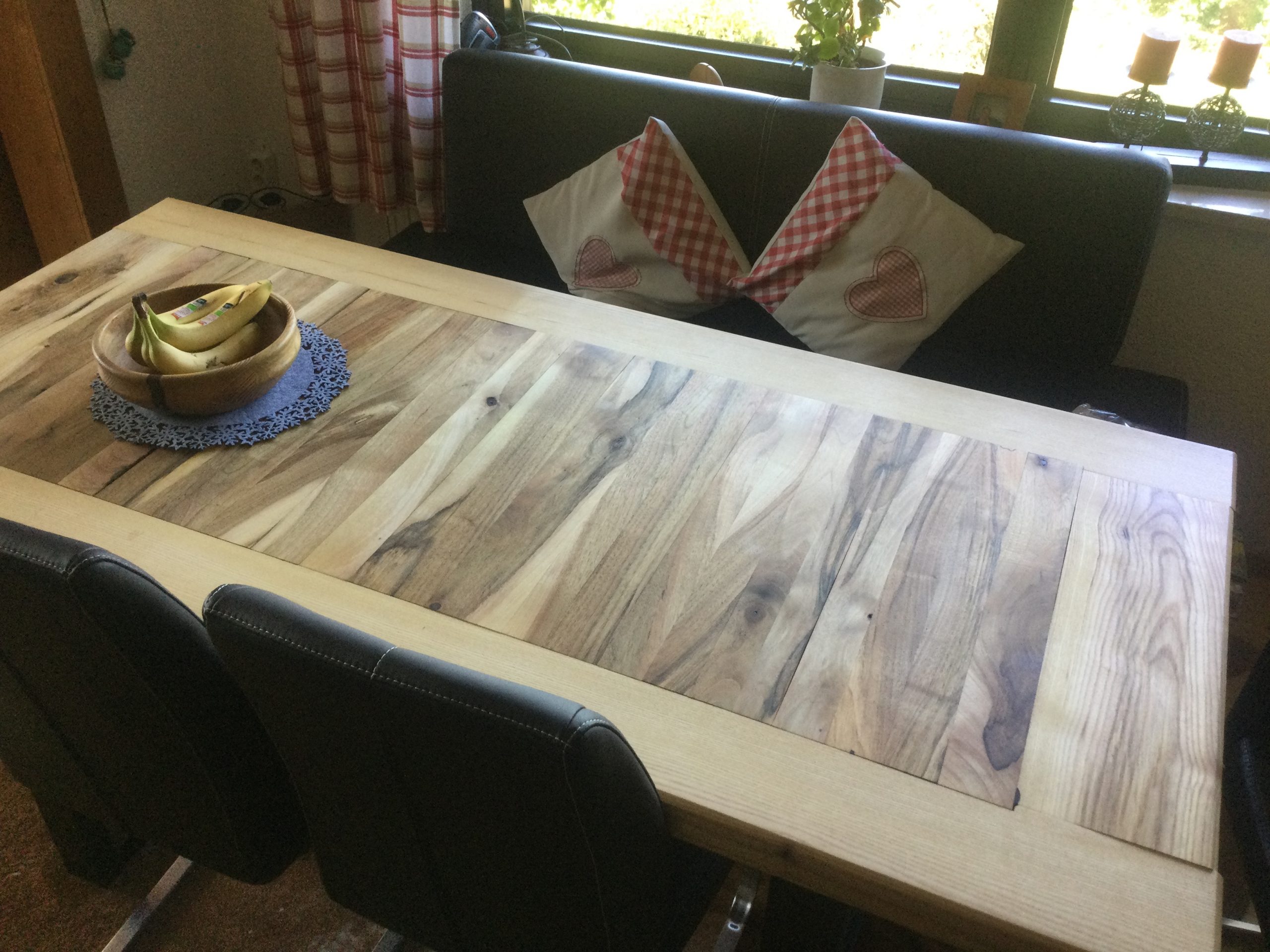 Der Esstisch ist aus Walnuss und Esche. Die Bäume sind aus der Nachbarschaft und von mir zugeschnitten worden. Die Oberfläche wurde mit Leinöl von DICTUM behandelt.