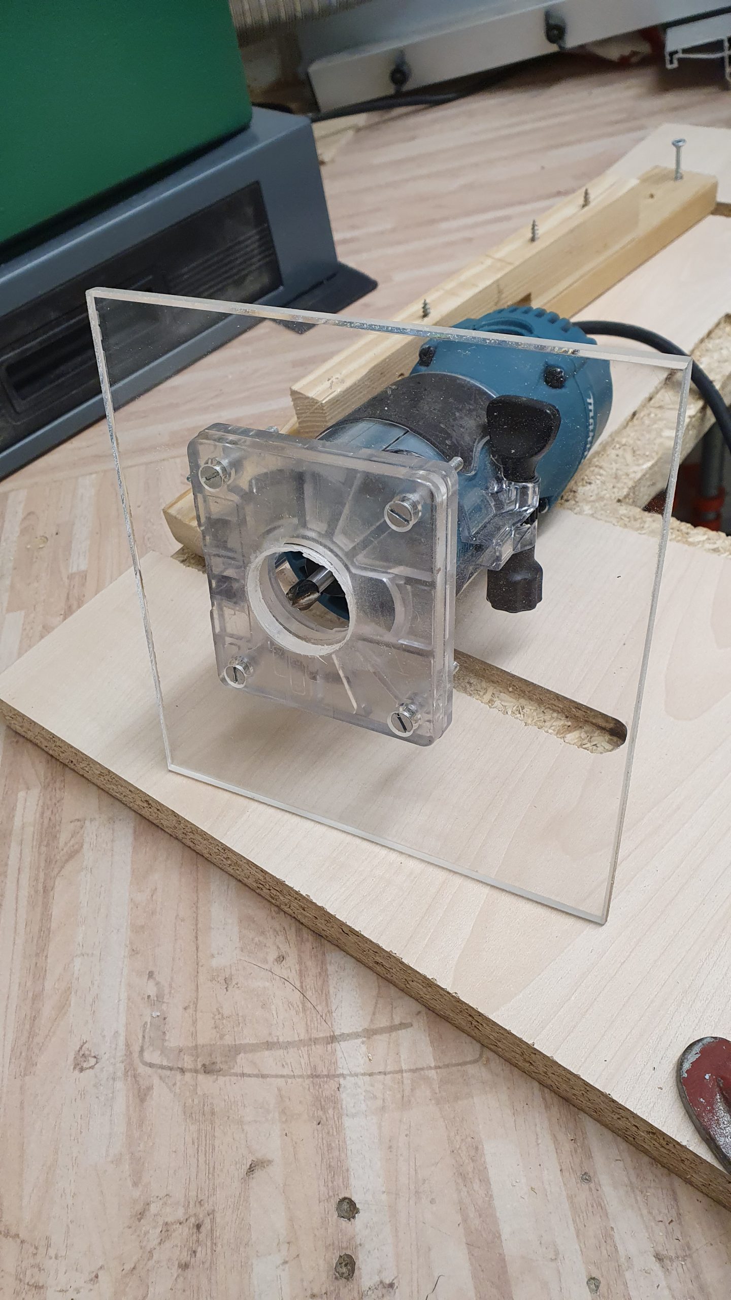 Dieser Tisch wurde aus einem alten Schreibtischgestell gebaut. Das Gestell wurde unten links und rechts mit Winkeleisen verstärkt. Die Tischplatten sind aus 19mm beschichteten Spanplatten. Die Größe ist 120cm x 60cm. Die Höhe wurde so gewählt, daß sie mit der Höhe meiner Kreissäge und meiner Hobelmaschine gleich ist. Zusätzlich sind Räder montiert, um in der Werkstatt mobil zu sein.