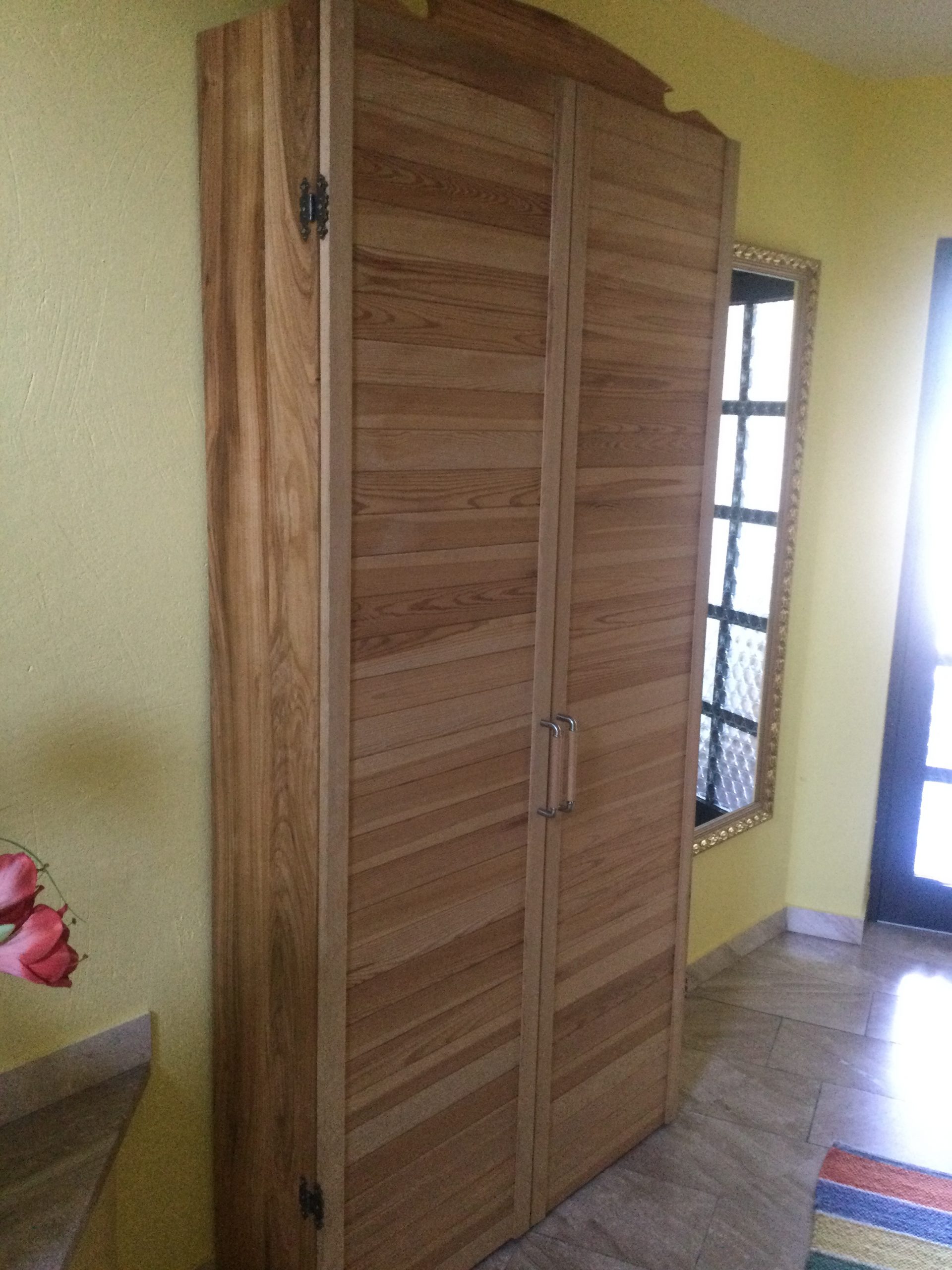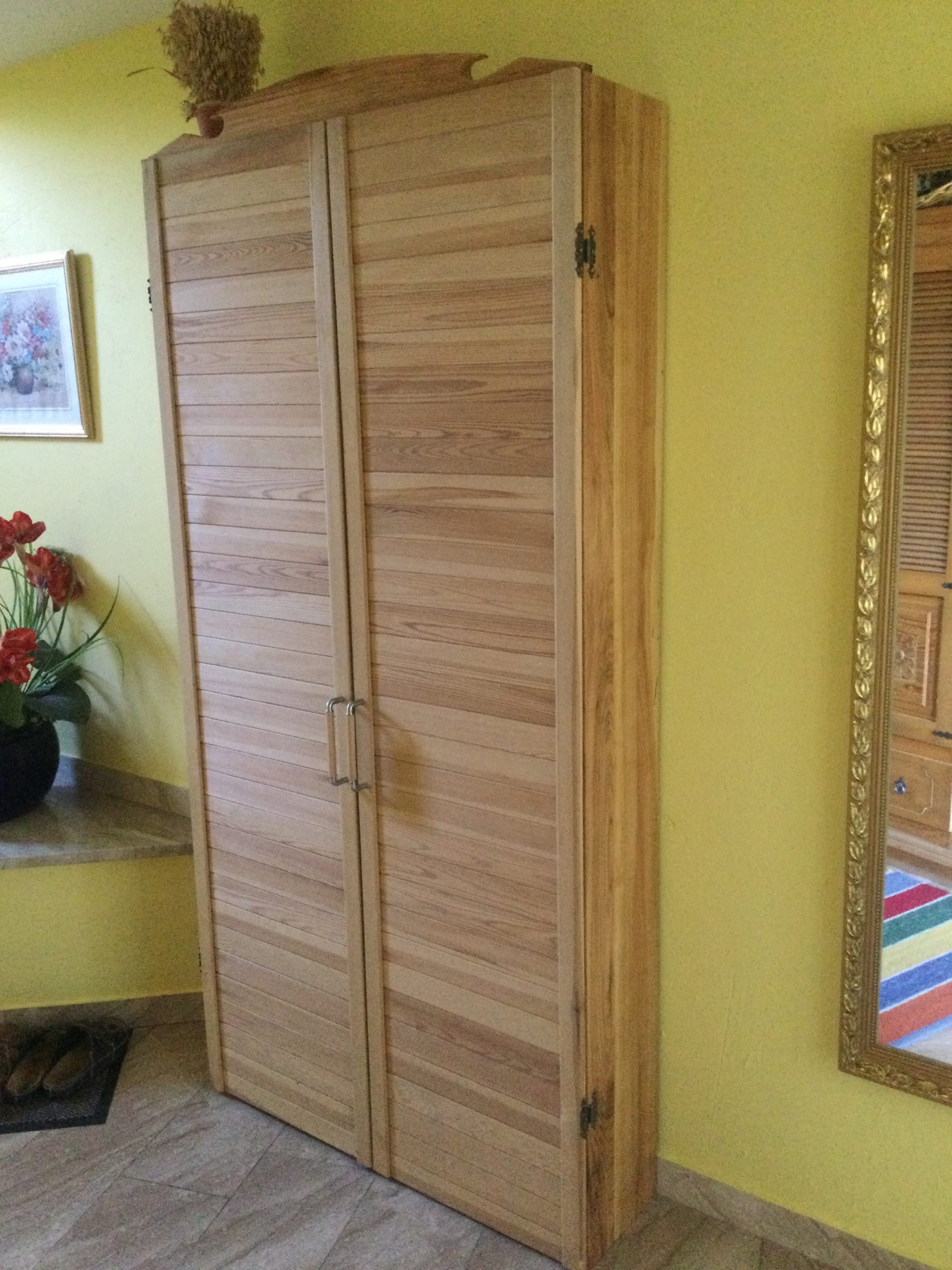 Die Seiten sind aus Kirsche und vom Baum zum Brett alles selbst hergestellt. Es wurden immer 3 Bretter verleimt die Lamellentüren wurden gekauft. Maße: h = 2m, t = 30 cm, b = 1 m.