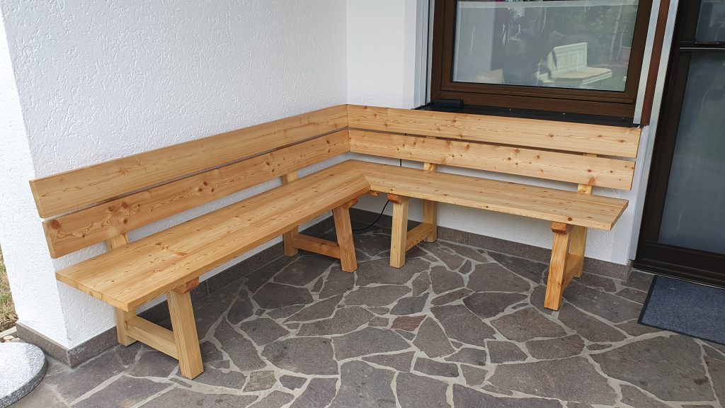 Bei diesem Projekt wurden ca. 30 Quadratmeter Wandverkleidung aus 14 mm starken Profilbrettern angebracht. Als Unterkonstruktion dienen einfache Dachlatten. Der obere Abschluß aus T-förmig zusammengesetzten Glattkantbrettern wurde mit Lamellos verdeckt befestigt. Als Werkzeug standen verschiedenste Handwerkzeuge wie Hobel, Stemmeisen und Sägen zur Verfügung, außerdem Elektrogeräte, z.B. eine Mafell Tauchkreissäge mit Führungsschiene, Schlagbohrmaschine, Akkuschrauber, Saugmobil sowie eine Festool Tischzugsäge CS 70 Precisio.