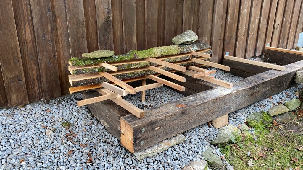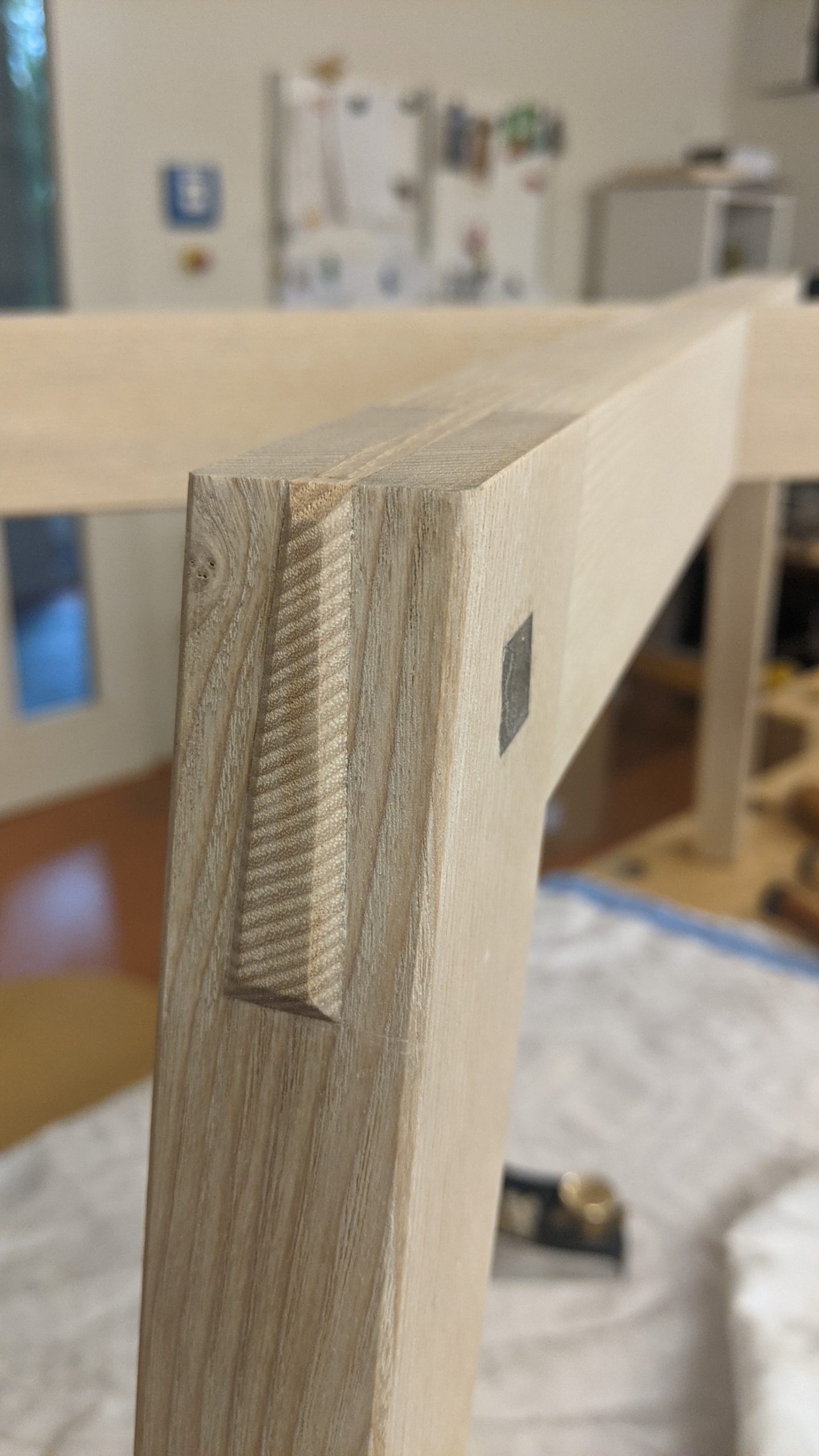 Das Gestell und die Beine aus Esche sind mit einem Schwalbenschwanz und 4-Kant-Dübel aus Räuchereiche gezinkt und mit einer schräg abgesetzten Kreuzüberblattung verbunden.