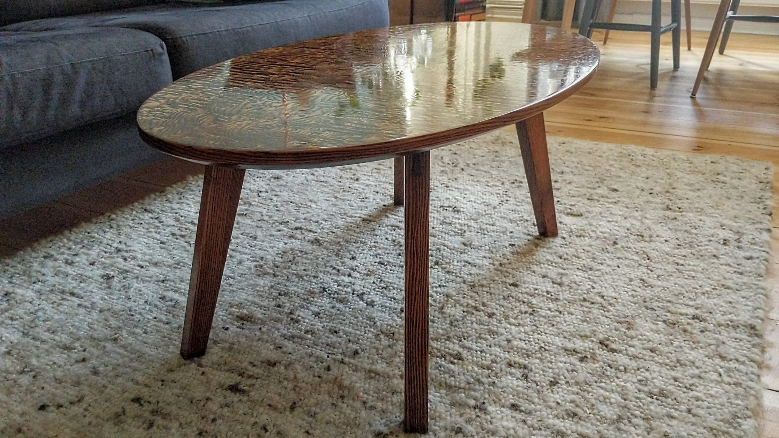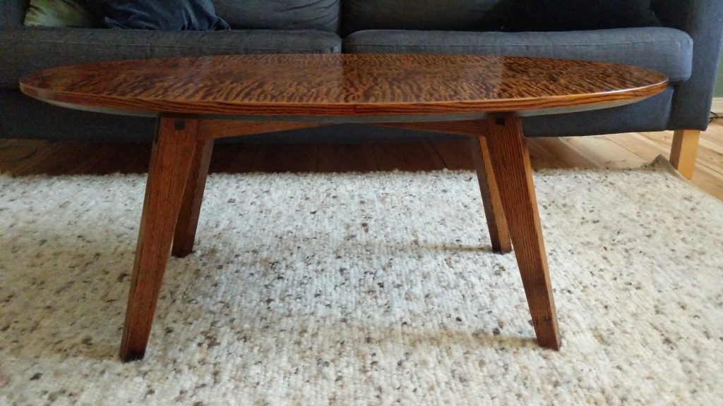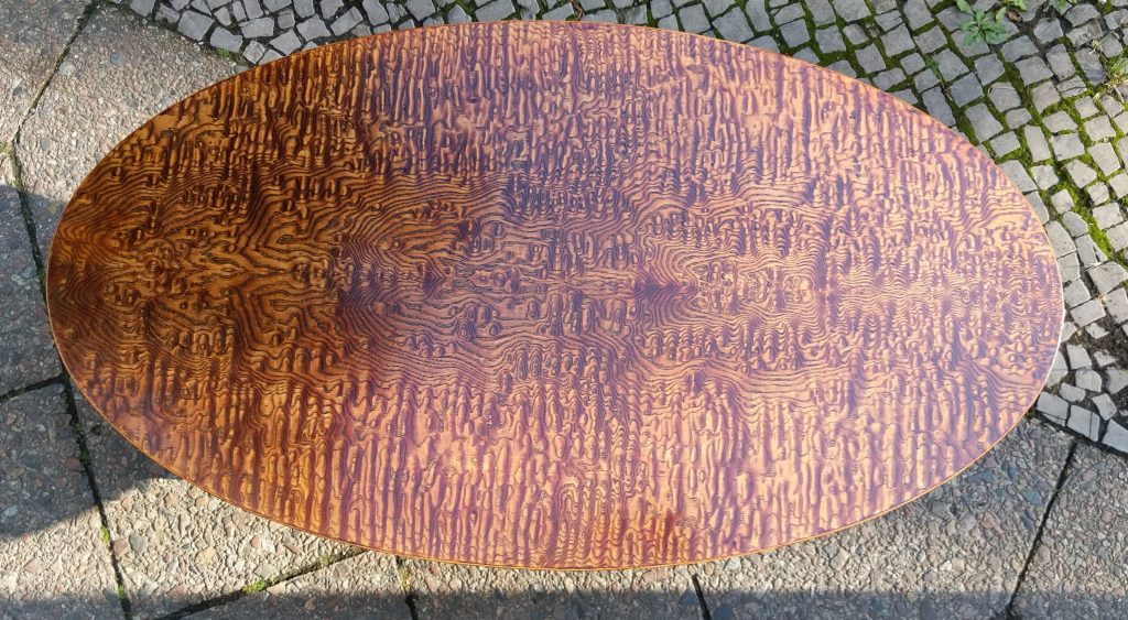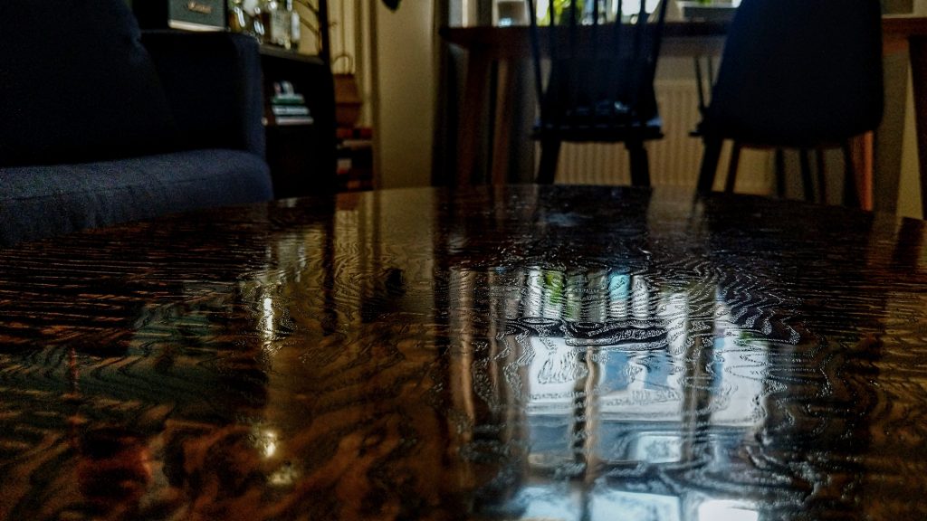 Couchtisch mit 12 Schichten Urushi-Lack und selbst angesetzter Bienenwachspolitur. Die Trägerplatte aus Ahorn-Multiplex ist mit Tamo (oder Sen-Esche/mandschurische Esche) furniert und einem Umleimer laminiert.