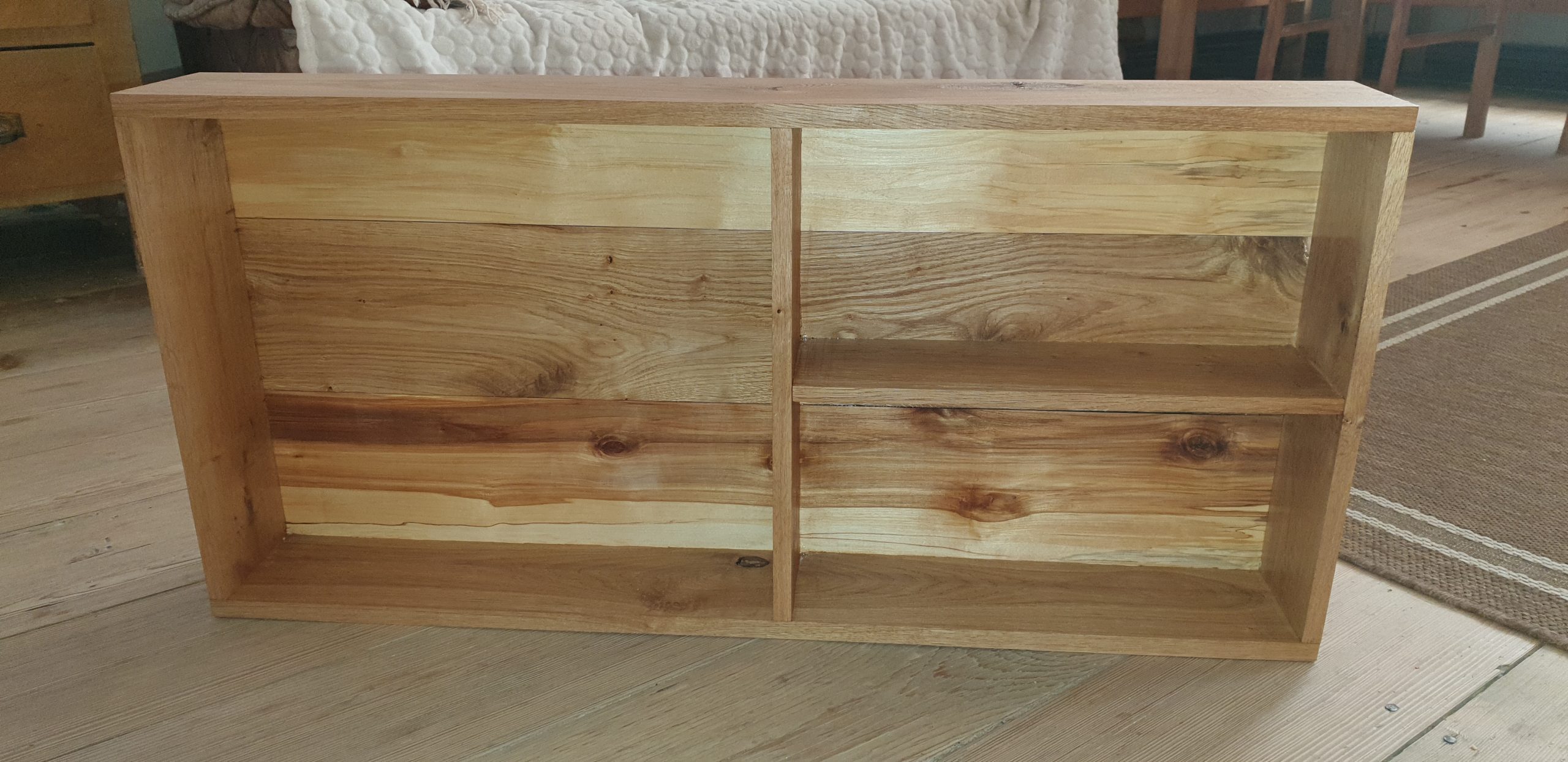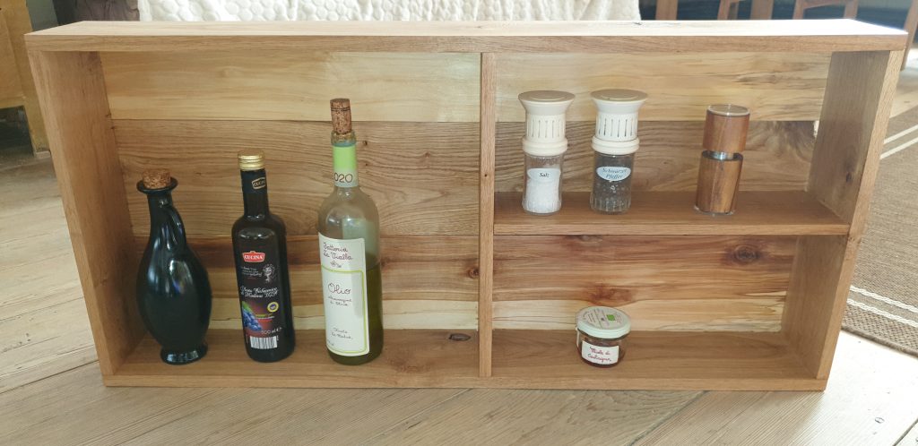 Gewürzregal aus Eiche, in der Rückwand sind zwei Bretter aus gestockter Birke verbaut.